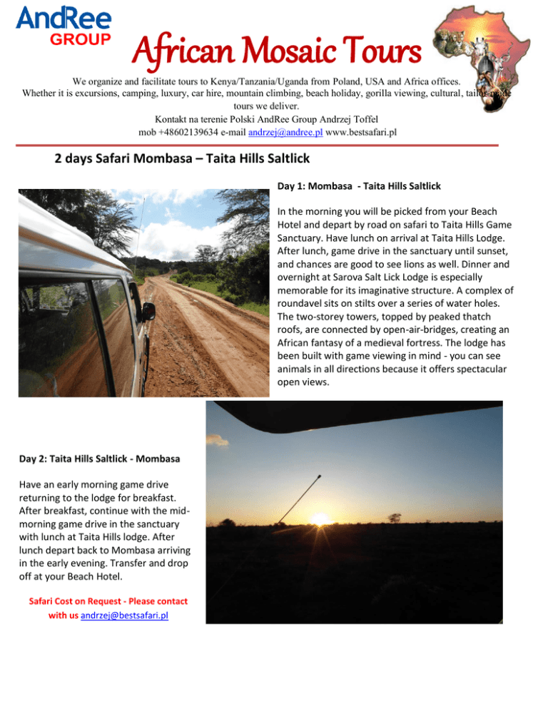African Mosaic Tours We organize and facilitate tours to Kenya/Tanzania/Uganda from Poland, USA and Africa offices. Whether it is excursions, camping, luxury, car hire, mountain climbing, beach holiday, gorilla viewing, cultural, tailor-made tours we deliver. Kontakt na terenie Polski AndRee Group Andrzej Toffel mob +48602139634 e-mail [email protected] www.bestsafari.pl 2 days Safari Mombasa – Taita Hills Saltlick Day 1: Mombasa - Taita Hills Saltlick In the morning you will be picked from your Beach Hotel and depart by road on safari to Taita Hills Game Sanctuary. Have lunch on arrival at Taita Hills Lodge. After lunch, game drive in the sanctuary until sunset, and chances are good to see lions as well. Dinner and overnight at Sarova Salt Lick Lodge is especially memorable for its imaginative structure. A complex of roundavel sits on stilts over a series of water holes. The two-storey towers, topped by peaked thatch roofs, are connected by open-air-bridges, creating an African fantasy of a medieval fortress. The lodge has been built with game viewing in mind - you can see animals in all directions because it offers spectacular open views. Day 2: Taita Hills Saltlick - Mombasa Have an early morning game drive returning to the lodge for breakfast. After breakfast, continue with the midmorning game drive in the sanctuary with lunch at Taita Hills lodge. After lunch depart back to Mombasa arriving in the early evening. Transfer and drop off at your Beach Hotel. Safari Cost on Request - Please contact with us [email protected]