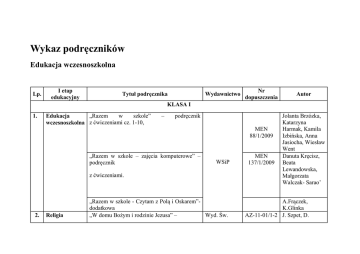 Wykaz podręczników Edukacja wczesnoszkolna Lp. I etap edukacyjny Tytuł podręcznika Wydawnictwo Nr dopuszczenia Autor KLASA I 1. „Razem w szkole” Edukacja z ćwiczeniami cz. 1-10, wczesnoszkolna – podręcznik MEN 88/1/2009 „Razem w szkole – zajęcia komputerowe” – podręcznik WSiP z ćwiczeniami. 2. Religia „Razem w szkole - Czytam z Polą i Oskarem”dodatkowa „W domu Bożym i rodzinie Jezusa” – Wyd. Św. MEN 137/1/2009 Jolanta Brzózka, Katarzyna Harmak, Kamila Izbińska, Anna Jasiocha, Wiesław Went Danuta Kręcisz, Beata Lewandowska, Małgorzata Walczak- Sarao’ A.Frączek, K.Glinka AZ-11-01/1-2 J. Szpet, D. podręcznik 3. Język angielski Wojciecha „Superworld 1” – podręcznik i ćwiczenia Macmillan Polska Sp. Jackowiak MEN 8/1/2009 z o.o. Carol Read, Ana Soberón, Ilona Kubrakiewicz, Barbara Ściborowska KLASA II 1. „Razem w szkole”. Edukacja wczesnoszkolna Edukacja wczesnoszkolna w klasie 2. –podręcznik z ćwiczeniami cz. 1-4, MEN 88/2/2009 „Razem w szkole”. Edukacja wczesnoszkolna w klasie 2. –podręcznik z ćwiczeniami cz. 510, 2. Religia MEN 88/3/2010 WSiP Jolanta Brzózka, Katarzyna Harmak, Kamila Izbińska, Anna Jasiocha, Wiesław Went Jolanta Brzózka, Katarzyna Harmak, Kamila Izbińska, Anna Jasiocha, Wiesław Went Danuta Kręcisz, Beata Lewandowska „Razem w szkole – zajęcia komputerowe” – podręcznik MEN 137/2/2010 z ćwiczeniami. „Razem w szkole – Czytamy ze zrozumieniem” „Bliscy serca Jezusa” – podręcznik i karty Wyd. Św. pracy Wojciecha P.Zbróg AZ-12-01/1-2 J. Szpet, D. Jackowiak 3. Język angielski Superworld 2 – podręcznik i ćwiczenia Macmillan Polska Sp. MEN 427/02 z o.o Carol Read, Ana Soberón, Ilona Kubrakiewicz, Barbara ŚciborowskaCarol Read KLASA III 1. Kształcenie zintegrowane „Świat ucznia” – kształcenie zintegrowane podręcznik kl. 3 Katarzyna Grodzka część 1,2, ćwiczenia kl.3 część 1-6 „Świat ucznia” – matematyka - podręcznik z ćwiczeniami kl. 3 cz. 1-4, 2. Religia 3. Język angielski Juka „Świat ucznia” - matematyka zbiór zadań klasa 3. „Jezusowa wspólnota serc” – podręcznik i Wyd. Św. karty pracy Wojciecha Superworld 3 Macmillan Polska Sp. z o.o MEN 262/04 Maria Frindt Beata Brodala, Halina Mrugała AZ-13-01/1-2 J. Szpet, D. Jackowiak MEN 427/02 Carol Read, Ana Soberón, Ilona Kubrakiewicz, Barbara Ściborowska