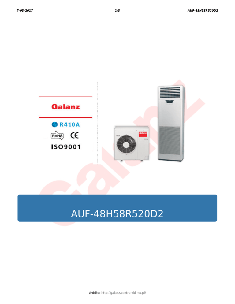 7-03-2017 1/3 AUF-48H58R520D2 źródło: http://galanz.centrumklima.pl/ AUF-48H58R520D2 7-03-2017 2/3 AUF-48H58R520D2 Dane techniczne AUF-48H58R520D2 Zasilanie Chłodzenie [V/Hz] 380~400/50/3 - wydajność [W] 14000 - pobór mocy [W] 4900 - pobór prądu [A] 8,5 - EER Grzanie 2,85 - wydajność [W] 15400 - pobór mocy [W] 5100 - pobór prądu [A] 9,7 - COP 3,01 Maks. zapotrzebowanie mocy [W] 6300 Maks. prąd [A] 12,4 Prąd początkowy [A] 66,0 [m³/h] 1900 - nominalny pobór mocy [W] 240 - nominalny pobór prądu [A] 1,2 - zdolność osuszania [l/h] 4,8 - poziom hałasu [dB(A)] 52 - poziom hałasu [dB(A)] 62 Jednostka wewn. - przepływ powietrza Jednostka zewn. - typ czynnika chłodniczego R410A - ilość czynnika chłodniczego [g] 2850 - ciśnienie obliczeniowe [MPa] 4,15 - strona cieczowa [mm] 9,52 - strona gazowa [mm] 19,0 - maks. długość instalacji [m] 15 - maks. różnica poziomów [m] 10 Temperatura pracy urządzenia [°C] -7 ~ +43 Powierzchnia działania [m²] 44 ~ 65 Rury chłodnicze Sprężarka - rodzaj spiralna - marka SANYO źródło: http://galanz.centrumklima.pl/ 7-03-2017 3/3 AUF-48H58R520D2 Wymiary i waga Szerokość Wysokość Głębokość Waga - jednostka 1900 mm 605 mm 330 mm 60,0 kg - w opakowaniu 2040 mm 770 mm 445 mm 73,0 kg - jednostka 970 mm 928 mm 345 mm 85,0 kg - w opakowaniu 1095 mm 1070 mm 470 mm 97,0 kg Jednostka wewnętrzna Jednostka zewnętrzna źródło: http://galanz.centrumklima.pl/