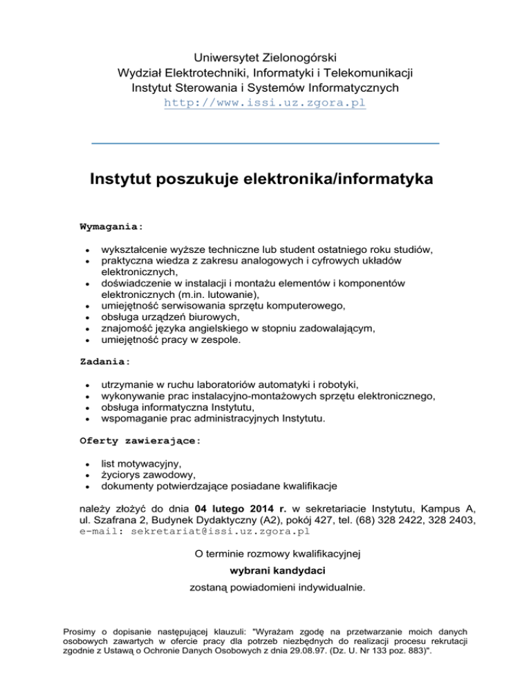 Uniwersytet Zielonogórski Wydział Elektrotechniki, Informatyki i Telekomunikacji Instytut Sterowania i Systemów Informatycznych http://www.issi.uz.zgora.pl Instytut poszukuje elektronika/informatyka Wymagania: • • • • • • • wykształcenie wyższe techniczne lub student ostatniego roku studiów, praktyczna wiedza z zakresu analogowych i cyfrowych układów elektronicznych, doświadczenie w instalacji i montażu elementów i komponentów elektronicznych (m.in. lutowanie), umiejętność serwisowania sprzętu komputerowego, obsługa urządzeń biurowych, znajomość języka angielskiego w stopniu zadowalającym, umiejętność pracy w zespole. Zadania: • • • • utrzymanie w ruchu laboratoriów automatyki i robotyki, wykonywanie prac instalacyjno-montażowych sprzętu elektronicznego, obsługa informatyczna Instytutu, wspomaganie prac administracyjnych Instytutu. Oferty zawierające: • • • list motywacyjny, życiorys zawodowy, dokumenty potwierdzające posiadane kwalifikacje należy złożyć do dnia 04 lutego 2014 r. w sekretariacie Instytutu, Kampus A, ul. Szafrana 2, Budynek Dydaktyczny (A2), pokój 427, tel. (68) 328 2422, 328 2403, e-mail: [email protected] O terminie rozmowy kwalifikacyjnej wybrani kandydaci zostaną powiadomieni indywidualnie. Prosimy o dopisanie następującej klauzuli: "Wyrażam zgodę na przetwarzanie moich danych osobowych zawartych w ofercie pracy dla potrzeb niezbędnych do realizacji procesu rekrutacji zgodnie z Ustawą o Ochronie Danych Osobowych z dnia 29.08.97. (Dz. U. Nr 133 poz. 883)".