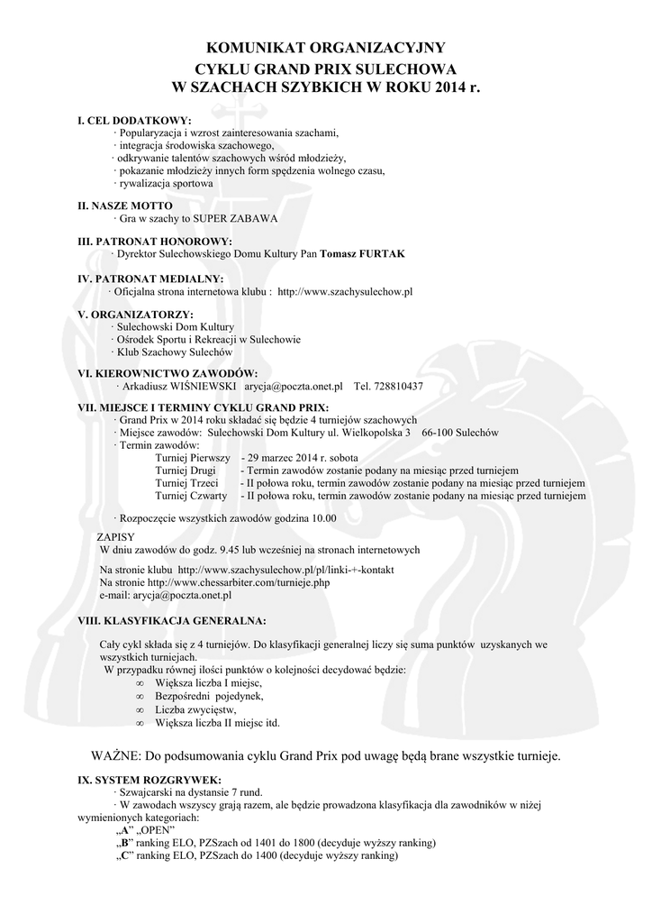 KOMUNIKAT ORGANIZACYJNY CYKLU GRAND PRIX SULECHOWA W SZACHACH SZYBKICH W ROKU 2014 r. I. CEL DODATKOWY: · Popularyzacja i wzrost zainteresowania szachami, · integracja środowiska szachowego, · odkrywanie talentów szachowych wśród młodzieży, · pokazanie młodzieży innych form spędzenia wolnego czasu, · rywalizacja sportowa II. NASZE MOTTO · Gra w szachy to SUPER ZABAWA III. PATRONAT HONOROWY: · Dyrektor Sulechowskiego Domu Kultury Pan Tomasz FURTAK IV. PATRONAT MEDIALNY: · Oficjalna strona internetowa klubu : http://www.szachysulechow.pl V. ORGANIZATORZY: · Sulechowski Dom Kultury · Ośrodek Sportu i Rekreacji w Sulechowie · Klub Szachowy Sulechów VI. KIEROWNICTWO ZAWODÓW: · Arkadiusz WIŚNIEWSKI [email protected] Tel. 728810437 VII. MIEJSCE I TERMINY CYKLU GRAND PRIX: · Grand Prix w 2014 roku składać się będzie 4 turniejów szachowych · Miejsce zawodów: Sulechowski Dom Kultury ul. Wielkopolska 3 66-100 Sulechów · Termin zawodów: Turniej Pierwszy - 29 marzec 2014 r. sobota Turniej Drugi - Termin zawodów zostanie podany na miesiąc przed turniejem Turniej Trzeci - II połowa roku, termin zawodów zostanie podany na miesiąc przed turniejem Turniej Czwarty - II połowa roku, termin zawodów zostanie podany na miesiąc przed turniejem · Rozpoczęcie wszystkich zawodów godzina 10.00 ZAPISY W dniu zawodów do godz. 9.45 lub wcześniej na stronach internetowych Na stronie klubu http://www.szachysulechow.pl/pl/linki-+-kontakt Na stronie http://www.chessarbiter.com/turnieje.php e-mail: [email protected] VIII. KLASYFIKACJA GENERALNA: Cały cykl składa się z 4 turniejów. Do klasyfikacji generalnej liczy się suma punktów uzyskanych we wszystkich turniejach. W przypadku równej ilości punktów o kolejności decydować będzie: • Większa liczba I miejsc, • Bezpośredni pojedynek, • Liczba zwycięstw, • Większa liczba II miejsc itd. WAŻNE: Do podsumowania cyklu Grand Prix pod uwagę będą brane wszystkie turnieje. IX. SYSTEM ROZGRYWEK: · Szwajcarski na dystansie 7 rund. · W zawodach wszyscy grają razem, ale będzie prowadzona klasyfikacja dla zawodników w niżej wymienionych kategoriach: „A” „OPEN” „B” ranking ELO, PZSzach od 1401 do 1800 (decyduje wyższy ranking) „C” ranking ELO, PZSzach do 1400 (decyduje wyższy ranking) X. TEMPO I PRZEPISY GRY: · Tempo gry 15 minut dla każdego zawodnika, · W turnieju obowiązują najnowsze przepisy zawarte w Kodeksie Szachowym PZSzach. XI. WARUNKI UCZESTNICTWA W TURNIEJU: · Wpisowe: - Seniorzy 10 zł - Juniorzy 5 zł WAŻNE: 100 % WPISOWEGO PRZEZNACZONE NA NAGRODY FINANSOWE WRĘCZANE W FINALE GRAND PRIX SULECHOWA W SZACHACH W CZWARTYM OSTATNIM TURNIEJU. XII. NAGRODY I WYRÓŻNIENIA: · W klasyfikacji indywidualnej poszczególnych turniejów tj: I, II, III IV: - puchary za I miejsca w kategoriach „A, B, C”, -dyplomy za miejsca I-III we wszystkich kategoriach, Nagrody w klasyfikacji generalnej po podliczeniu wyników z czterech turniejów: Grupa A (OPEN) - I miejsce – 200 zł - II miejsce – 150 zł - III miejsce – 100 zł - IV miejsce – 50 zł - V miejsce – nagroda rzeczowa Grupa B (ranking ELO, PZSzach od 1401 do 1800) - I miejsce – 120 zł - II miejsce – 80 zł - III miejsce – 50 zł - IV miejsce – 30 zł - V miejsce – nagroda rzeczowa Grupa C (ranking ELO, PZSzach do 1400) - I miejsce – 80 zł - II miejsce – 60 zł - III miejsce – 40 zł - IV miejsce – nagroda rzeczowa lub finansowa - V miejsce – nagroda rzeczowa Nagrody mogą być łączone. Przewiduje się wyróżnienia, nagrody rzeczowe lub finansowe dla: - najmłodszego zawodnika turnieju - najstarszego zawodnika turnieju - najlepszej kobiety XIII. SPRAWY WYCHOWAWCZE - W czasie gry obowiązują zasady dobrego zachowania umożliwiające zawodnikom bezproblemowe rozegranie partii, oraz kategoryczny zakaz picia alkoholu i palenia tytoniu. - Opiekę wychowawczą podczas zawodów sprawują SZKOLENIOWCY I OPIEKUNOWIE !!!, we współpracy z Organizatorem. XV. SPRAWY RÓŻNE - Osoby niepełnoletnie muszą przebywać w trakcie turnieju pod nadzorem opiekuna! - Uczestnicy indywidualnie ubezpieczają się od następstw nieszczęśliwych wypadków i biorą w zawodach udział na własną odpowiedzialność oraz odpowiadają za wyrządzone przez siebie szkody. - Ostateczna interpretacja niniejszego regulaminu oraz weryfikacja zawodników mogących brać udział w turnieju należy do kierownika zawodów oraz sędziego głównego. Z szachowym pozdrowieniem