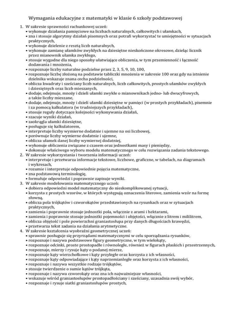 Wymagania edukacyjne z matematyki w klasie 6 szkoły podstawowej 1. W zakresie sprawności rachunkowej uczeń: • wykonuje działania pamięciowe na liczbach naturalnych, całkowitych i ułamkach, • zna i stosuje algorytmy działań pisemnych oraz potrafi wykorzystać te umiejętności w sytuacjach praktycznych, • wykonuje dzielenie z resztą liczb naturalnych, • wykonuje zamianę ułamków zwykłych na dziesiętne nieskończone okresowe, dzieląc licznik przez mianownik ułamka zwykłego, • stosuje wygodne dla niego sposoby ułatwiające obliczenia, w tym przemienność i łączność dodawania i mnożenia, • rozpoznaje liczby naturalne podzielne przez 2, 3, 5, 9, 10, 100, • rozpoznaje liczbę złożoną na podstawie tabliczki mnożenia w zakresie 100 oraz gdy na istnienie dzielnika wskazuje znana cecha podzielności, • oblicza kwadraty i sześciany liczb naturalnych, liczb całkowitych, prostych ułamków zwykłych i dziesiętnych oraz liczb mieszanych, • dodaje, odejmuje, mnoży i dzieli ułamki zwykłe o mianownikach jedno- lub dwucyfrowych, a także liczby mieszane, • dodaje, odejmuje, mnoży i dzieli ułamki dziesiętne w pamięci (w prostych przykładach), pisemnie i za pomocą kalkulatora (w trudniejszych przykładach), • stosuje reguły dotyczące kolejności wykonywania działań, • szacuje wyniki działań, • zaokrągla ułamki dziesiętne, • posługuje się kalkulatorem, • interpretuje liczby wymierne dodatnie i ujemne na osi liczbowej, • porównuje liczby wymierne dodatnie i ujemne, • oblicza ułamek danej liczby wymiernej dodatniej, • wykonuje obliczenia związane z czasem oraz jednostkami masy i pieniędzy, • dokonuje właściwego wyboru modelu matematycznego w celu rozwiązania zadania tekstowego. 2. W zakresie wykorzystania i tworzenia informacji uczeń: • interpretuje i przetwarza informacje tekstowe, liczbowe, graficzne, w tabelach, na diagramach i wykresach, • rozumie i interpretuje odpowiednie pojęcia matematyczne, • zna podstawową terminologię, • formułuje odpowiedzi i poprawnie zapisuje wyniki. 3. W zakresie modelowania matematycznego uczeń: • dobiera odpowiedni model matematyczny do nieskomplikowanej sytuacji, • korzysta z prostych wzorów, w których występują oznaczenia literowe, zamienia wzór na formę słowną, • oblicza pola trójkątów i czworokątów przedstawionych na rysunkach oraz w sytuacjach praktycznych, • zamienia i poprawnie stosuje jednostki pola, włącznie z arami i hektarami, • zamienia i poprawnie stosuje jednostki pojemności i objętości, włącznie z litrem i mililitrem, • oblicza objętość i pole powierzchni graniastosłupa przy danych długościach krawędzi, • przetwarza tekst zadania na działania arytmetyczne. 4. W zakresie kształcenia wyobraźni geometrycznej uczeń: • sprawnie posługuje się przyrządami matematycznymi w celu sporządzania rysunków, • rozpoznaje i nazywa podstawowe figury geometryczne, w tym wielokąty, • rozpoznaje odcinki, proste prostopadłe i równoległe, również w figurach płaskich i przestrzennych, • rozpoznaje, mierzy i rysuje kąty o podanej mierze, • rozpoznaje kąty wierzchołkowe i kąty przyległe oraz korzysta z ich własności, • rozpoznaje kąty odpowiadające i kąty naprzemianległe oraz korzysta z ich własności, • rozpoznaje i nazywa wszystkie rodzaje trójkątów, • stosuje twierdzenie o sumie kątów trójkąta, • rozpoznaje i nazywa czworokąty oraz zna ich najważniejsze własności, • wskazuje wśród graniastosłupów prostopadłościany i sześciany, uzasadnia swój wybór, • rozpoznaje i rysuje siatki graniastosłupów prostych, • rozpoznaje i rysuje siatki ostrosłupów. 5. W zakresie rozumowania i tworzenia strategii uczeń: • czyta ze zrozumieniem prosty tekst zawierający informacje liczbowe, • odczytuje dane przedstawione w różny sposób (tabele, rysunki, mapy, diagramy), • dostrzega zależności matematyczne w otaczającym świecie, • ustala kolejność czynności (w tym obliczeń) prowadzących do rozwiązania problemu, • dostrzega zależności między podanymi informacjami, • dzieli rozwiązanie zadania na etapy, stosując własne poprawne oraz wygodne dla niego strategie rozwiązania, • do rozwiązania zadań osadzonych w kontekście praktycznym stosuje zdobytą wiedzę z zakresu arytmetyki i geometrii, nabyte umiejętności rachunkowe oraz własne poprawne metody, • weryfikuje wynik zadania tekstowego, oceniając sensowność rozwiązania. 6. W zakresie praktycznego zastosowania matematyki uczeń: • dokonuje właściwego wyboru metod rozwiązywania problemów, • interpretuje 100% danej wielkości jako całość, 50% – jako połowę, 25% – jako jedną czwartą, 10% – jako jedną dziesiątą, 1% – jako setną część danej wielkości, • w przykładach osadzonych w kontekście praktycznym oblicza procent danej wielkości, • wykonuje obliczenia zegarowe na godzinach, minutach i sekundach, • zapisuje minuty jako dziesiętne części godziny, • wykonuje proste obliczenia kalendarzowe dotyczące dni, tygodni, miesięcy, lat, • zamienia i poprawnie stosuje jednostki: monetarne, długości, masy, pola, objętości i pojemności, • oblicza zależności między prędkością, drogą i czasem w ruchu jednostajnym, stosuje różne jednostki prędkości, • w przykładach osadzonych w kontekście praktycznym oblicza: koszty zakupów, remontu mieszkania, czasu i kosztów podróży, liczbę kalorii artykułów spożywczych, • przedstawia dane na diagramach kołowych, słupkowych i w tabelach oraz je odczytuje, • wykonuje obliczenia na podstawie planów i map oraz tabel. I. Wymagania na poszczególne oceny a) Wymagania konieczne (na ocenę dopuszczającą) obejmują wiadomości i umiejętności umożliwiające uczniowi dalszą naukę, bez których uczeń nie jest w stanie zrozumieć kolejnych zagadnień omawianych podczas lekcji i wykonywać prostych