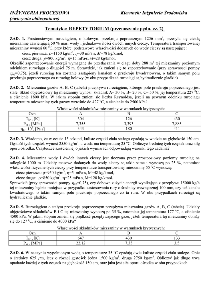 INĩYNIERIA PROCESOWA (üwiczenia obliczeniowe) Kierunek: InĪynieria ĝrodowiska Tematyka: REPETYTORIUM (przenoszenie pĊdu, cz. 2) ZAD. 1. Prostoosiowym rurociągiem, o koáowym przekroju poprzecznym 1256 mm2, przesyáa siĊ ciekáą mieszaninĊ zawierającą 50 % mas. wody i jednakowe iloĞci dwóch innych cieczy. Temperatura transportowanej mieszaniny wynosi 60 oC, przy której podstawowe wáaĞciwoĞci dodanych do wody cieczy są nastĊpujące: ciecz pierwsza: U=1150 kg/m3, K=30 mPas, M=78 kg/kmol, ciecz druga: U=800 kg/m3, K=15 mPas, M=28 kg/kmol. OkreĞliü zapotrzebowanie energii wymagane do przetáaczania w ciągu doby 288 m3 tej mieszaniny poziomym odcinkiem rurociągu o dáugoĞci 75 m. Sprawdziü, jak zmieni siĊ to zapotrzebowanie (przy sprawnoĞci pompy Kog=0,75), jeĪeli rurociąg ten zostanie zastąpiony kanaáem o przekroju kwadratowym, o takim samym polu przekroju poprzecznego co rurociąg koáowy (w obu przypadkach rurociągi są hydraulicznie gáadkie). ZAD. 2. Mieszanina gazów A, B, C (tabela) przepáywa rurociągiem, którego pole przekroju poprzecznego jest staáe. Skáad objĊtoĞciowy tej mieszaniny wynosi: skáadnik A– 30 %, B– 20 %, C– 50 %, jej temperatura 227 oC, a ciĞnienie 1800 kPa. W jakim stopniu zmieni siĊ liczba Reynoldsa, jeĪeli na pewnym odcinku rurociągu temperatura mieszaniny tych gazów wzroĞnie do 427 oC, a ciĞnienie do 2500 kPa? Ozn. Tkr , [K] Pkr , [MPa] Kkr 107, [Pas] WáaĞciwoĞci skáadników mieszaniny w warunkach krytycznych: A B 304 126 7,355 3,393 343 180 C 430 7,885 411 ZAD. 3. Wiadomo, Īe w czasie 15 sekund, kuliste cząstki ciaáa staáego opadają w wodzie na gáĊbokoĞü 150 cm. GĊstoĞü tych cząstek wynosi 2550 kg/m3, a woda ma temperaturĊ 25 oC. Obliczyü ĞrednicĊ tych cząstek oraz siáĊ oporu oĞrodka. Cząsteczce szeĞciennej o jakich wymiarach odpowiadają warunki tego zadania? ZAD. 4. Mieszanina wody i dwóch innych cieczy jest táoczona przez prostoosiowy poziomy rurociąg na odlegáoĞü 1000 m. Udziaáy masowe dodanych do wody cieczy są takie same i wynoszą po 25 %, natomiast wáaĞciwoĞci fizyczne tych cieczy przy temperaturze transportowanej mieszaniny 55 oC wynoszą: ciecz pierwsza: U=950 kg/m3, K=5 mPas, M=48 kg/kmol, ciecz druga: U=850 kg/m3, K=25 mPas, M=120 kg/kmol. Sprawdziü (przy sprawnoĞci pompy Kog=0,75), czy dobowe zuĪycie energii wynikające z przepáywu 15000 kg/h tej mieszaniny bĊdzie mniejsze w przypadku zastosowania rury o Ğrednicy wewnĊtrznej 100 mm, czy teĪ kanaáu kwadratowego o takim samym polu przekroju poprzecznego co ta rura. W obu przypadkach rurociągi są hydraulicznie gáadkie. ZAD. 5. Rurociągiem o staáym przekroju poprzecznym przepáywa mieszanina gazów A, B, C (tabela). Udziaáy objĊtoĞciowe skáadników B i C tej mieszaniny wynoszą po 35 %, natomiast jej temperatura 177 oC, a ciĞnienie 4500 kPa. W jakim stopniu zmieni siĊ prĊdkoĞü przepáywającego gazu, jeĪeli temperatura tej mieszaniny obniĪy siĊ do 127 oC, a ciĞnienie do 4000 kPa? Ozn. Tkr , [K] Pkr , [MPa] WáaĞciwoĞci skáadników mieszaniny w warunkach krytycznych: A B 647 430 22,12 7,35 C 133 3,5 ZAD. 6. W naczyniu wypeánionym wodą o temperaturze 35 oC opadają dwie kuliste cząstki ciaáa staáego. Obie o Ğrednicy 625 Pm, lecz o róĪnej gĊstoĞci: jedna 1500 kg/m3, druga 2750 kg/m3. Obliczyü jak dáugo trwa opadanie kaĪdej z tych cząstek na gáĊbokoĞü 150 cm, oraz jaka jest siáa oporu oĞrodka w obu przypadkach.