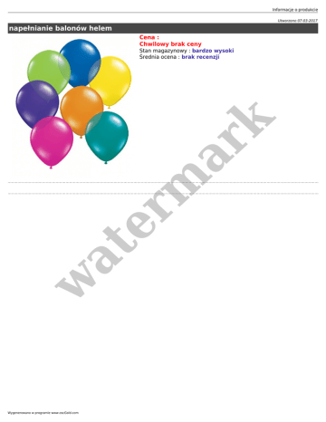 Informacje o produkcie Utworzono 07-03-2017 napełnianie balonów helem Cena : Chwilowy brak ceny w at er m ar k Stan magazynowy : bardzo wysoki Średnia ocena : brak recenzji Wygenerowano w programie www.oscGold.com