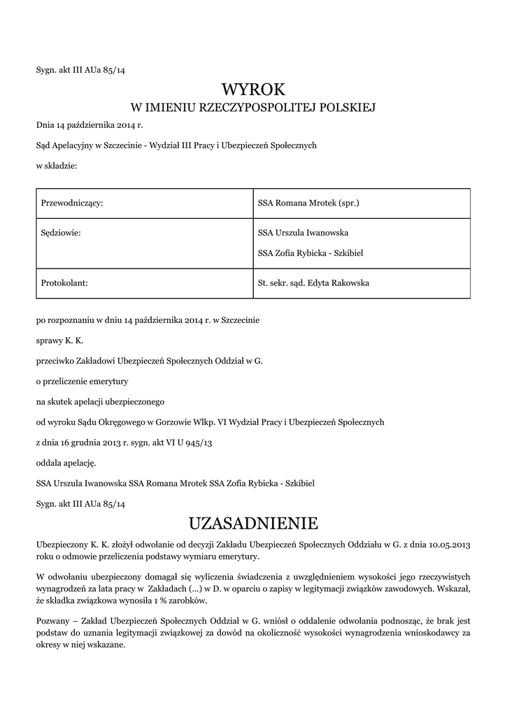 Sygn. akt III AUa 85/14 WYROK W IMIENIU RZECZYPOSPOLITEJ POLSKIEJ Dnia 14 października 2014 r. Sąd Apelacyjny w Szczecinie - Wydział III Pracy i Ubezpieczeń Społecznych w składzie: Przewodniczący: SSA Romana Mrotek (spr.) Sędziowie: SSA Urszula Iwanowska SSA Zofia Rybicka - Szkibiel Protokolant: St. sekr. sąd. Edyta Rakowska po rozpoznaniu w dniu 14 października 2014 r. w Szczecinie sprawy K. K. przeciwko Zakładowi Ubezpieczeń Społecznych Oddział w G. o przeliczenie emerytury na skutek apelacji ubezpieczonego od wyroku Sądu Okręgowego w Gorzowie Wlkp. VI Wydział Pracy i Ubezpieczeń Społecznych z dnia 16 grudnia 2013 r. sygn. akt VI U 945/13 oddala apelację. SSA Urszula Iwanowska SSA Romana Mrotek SSA Zofia Rybicka - Szkibiel Sygn. akt III AUa 85/14 UZASADNIENIE Ubezpieczony K. K. złożył odwołanie od decyzji Zakładu Ubezpieczeń Społecznych Oddziału w G. z dnia 10.05.2013 roku o odmowie przeliczenia podstawy wymiaru emerytury. W odwołaniu ubezpieczony domagał się wyliczenia świadczenia z uwzględnieniem wysokości jego rzeczywistych wynagrodzeń za lata pracy w Zakładach (...) w D. w oparciu o zapisy w legitymacji związków zawodowych. Wskazał, że składka związkowa wynosiła 1 % zarobków. Pozwany – Zakład Ubezpieczeń Społecznych Oddział w G. wniósł o oddalenie odwołania podnosząc, że brak jest podstaw do uznania legitymacji związkowej za dowód na okoliczność wysokości wynagrodzenia wnioskodawcy za okresy w niej wskazane. Sąd Okręgowy w Gorzowie Wielkopolskim wyrokiem z dni a16 grudnia 2013r. oddalił odwołanie. Sąd Okręgowy ustalił, że ubezpieczony K. K. uzyskał prawo do emerytury na mocy wyroku sądowego z dnia 24.04.2009 roku wydanego w sprawie VI U 255/08. Jej wskaźnik podstawy wymiaru wyniósł 64,91 % . Wysokości wynagrodzenia uzyskiwanego przez K. K. w Zakładach (...) w D. nie da się ustalić. Pracował on jako maszynista typograficzny od dnia 1.08.1970 roku do dnia 05.05.1972 roku i od dnia 02.04.1973 roku do dnia 12.11.1983 roku w pełnym wymiarze czasu pracy. Sąd Okręgowy wskazał, że przedmiotem sporu w sprawie było to, czy pozwany miał obowiązek przeliczenia podstawy wymiaru emerytury skarżącego w oparciu o zapisy zawarte w legitymacji związkowej złożonej wraz z wnioskiem ubezpieczonego. Przepis art. 111 ust. 1 ustawy z dnia 17 grudnia 1998 r. o emeryturach i rentach z Funduszu Ubezpieczeń Społecznych (tekst jednolity: Dz.U. z 2009 roku, Nr 153, poz. 1227 z późn. zm.- zwanej dalej: ustawą) stanowi: wysokość emerytury lub renty oblicza się ponownie, z zastrzeżeniem ust. 2 i 3, od podstawy wymiaru ustalonej w myśl art. 15, jeżeli do jej obliczenia wskazano podstawę wymiaru składki na ubezpieczenie społeczne lub ubezpieczenia emerytalne i rentowe na podstawie przepisów prawa polskiego: 1) z liczby kolejnych lat kalendarzowych i w okresie wskazanym do ustalenia poprzedniej podstawy wymiaru świadczenia, 2) z kolejnych 10 lat kalendarzowych wybranych z 20 lat kalendarzowych, poprzedzających bezpośrednio rok kalendarzowy, w którym zgłoszono wniosek o przyznanie emerytury lub renty albo o ponowne ustalenie emerytury lub renty, z uwzględnieniem art. 176, 3) z 20 lat kalendarzowych wybranych z całego okresu podlegania ubezpieczeniu, przypadających przed rokiem zgłoszenia wniosku o ponowne ustalenie emerytury lub renty, a wskaźnik wysokości podstawy wymiaru jest wyższy od poprzednio obliczonego. Przepis ten miał zastosowanie do wniosku ubezpieczonego o przeliczenie emerytury złożonego po wydaniu decyzji pierwszorazowej , ponieważ do wyliczenia emerytury wskazał on podstawę wymiaru składki na ubezpieczenie społeczne ( zarobki ) z lat kalendarzowych uwidocznionych w legitymacji związkowej, wybranych z całego okresu ubezpieczenia ( art. 111 ust 1 pkt. 3 ustawy ) . Podstawą do odmowy uwzględnienia wniosku skarżącego było twierdzenie, że nie przedłożył on wiarygodnych dowodów na wysokość podstawy wymiaru składki w spornym okresie . Sąd Okręgowy wskazał, że środkiem dowodowym stwierdzającym wysokość zarobku lub dochodu stanowiącego podstawę wymiaru emerytury lub renty jest zaświadczenie zakładów pracy wystawione według wzoru ustalonego przez Zakład Ubezpieczeń Społecznych albo legitymacja ubezpieczeniowa zawierająca wpisy dotyczące okresów zatrudnienia i wysokości osiąganych zarobków ( & 20 rozporządzenia Rady Ministrów z dnia 07.02.1983 roku w sprawie postępowania o świadczenia emerytalno – rentowe i zasad wypłaty tych świadczeń ( DZU nr 10 poz. 49 ze zmianami ). Przepis ten nie mógł regulować spornej materii, która dotyczyła lat siedemdziesiątych . Od 1 stycznia 1968 roku obowiązywał § 33 rozporządzenie Przewodniczącego Komitetu Pracy i Płacy z dnia 12 grudnia 1968 r. w sprawie postępowania o świadczenia emerytalne i zasad wypłaty tych świadczeń zgodnie z którym środkiem dowodowym stwierdzającym wysokość zarobku stanowiącego podstawę wymiaru emerytury lub renty z ustawy o p.z.e., z.e.g. i z.e.k. oraz o wypadkach przy pracy jest: 1) dla pracowników uspołecznionych zakładów pracy - zaświadczenie zakładu pracy wystawione według ustalonego wzoru, 2) dla pracowników nie uspołecznionych zakładów pracy - stwierdzenie właściwego oddziału ZUS o wysokości zarobków zgłaszanych bieżąco dla wymiaru składek na ubezpieczenia społeczne, 3) dla obywateli polskich zatrudnionych w przedstawicielstwach i misjach państw obcych - stwierdzenie właściwego oddziału ZUS o wysokości podstawy wymiaru składki na cele emerytalne lub zaświadczenie jak w pkt 1, jeżeli składka opłacana była przez przedstawicielstwo lub misję, 4) dla adwokata - członka zespołu adwokackiego - zaświadczenie zespołu adwokackiego. Środkiem dowodowym stwierdzającym wysokość zarobku (ust. 1) mogą być również legitymacja ubezpieczeniowa lub inne dowody w przypadkach określonych w przepisach w sprawie obliczania podstawy wymi