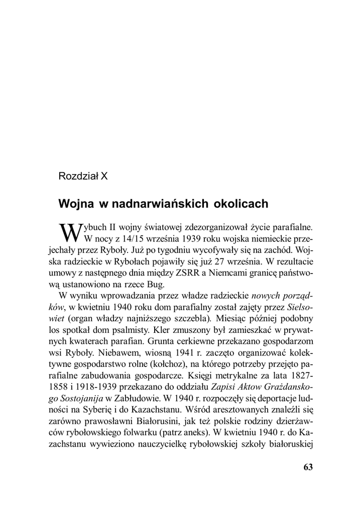 Rozdział X Wojna w nadnarwiańskich okolicach W ybuch II wojny światowej zdezorganizował życie parafialne. W nocy z 14/15 września 1939 roku wojska niemieckie przejechały przez Ryboły. Już po tygodniu wycofywały się na zachód. Wojska radzieckie w Rybołach pojawiły się już 27 września. W rezultacie umowy z następnego dnia między ZSRR a Niemcami granicę państwową ustanowiono na rzece Bug. W wyniku wprowadzania przez władze radzieckie nowych porządków, w kwietniu 1940 roku dom parafialny został zajęty przez Sielsowiet (organ władzy najniższego szczebla). Miesiąc później podobny los spotkał dom psalmisty. Kler zmuszony był zamieszkać w prywatnych kwaterach parafian. Grunta cerkiewne przekazano gospodarzom wsi Ryboły. Niebawem, wiosną 1941 r. zaczęto organizować kolektywne gospodarstwo rolne (kołchoz), na którego potrzeby przejęto parafialne zabudowania gospodarcze. Księgi metrykalne za lata 18271858 i 1918-1939 przekazano do oddziału Zapisi Aktow Grażdanskogo Sostojanija w Zabłudowie. W 1940 r. rozpoczęły się deportacje ludności na Syberię i do Kazachstanu. Wśród aresztowanych znaleźli się zarówno prawosławni Białorusini, jak też polskie rodziny dzierżawców rybołowskiego folwarku (patrz aneks). W kwietniu 1940 r. do Kazachstanu wywieziono nauczycielkę rybołowskiej szkoły białoruskiej 63 Teodozję Iwaniuk z rodziną. Planowane przez NKWD na czerwieclipiec 1941 r. dalsze zatrzymania bogatszych gospodarzy nie doszły do skutku. Dnia 22 czerwca 1941 roku Niemcy dokonali napaści na ZSRR. Podczas bombardowania artyleryjskiego obie cerkwie w Rybołach zostały uszkodzone. Odłamki padających pocisków poczyniły szkody również w domu parafialnym. Wśród ofiar pierwszych dni wojny znaleźli się dwaj młodzi mieszkańcy Wojszek: Mikołaj Siergiejuk i Mikołaj Szastowski, którzy zginęli w swej wsi 25 czerwca. W samych Rybołach obyło się bez ofiar w ludziach, ale we wsi spłonęło sześć spichrzów. Kilka miesięcy później w Rybołach miał miejsce kolejny pożar. Spłonęło wtedy kilkanaście stodół zlokalizowanych na skraju wsi od strony południowej. Po uformowaniu niemieckiej władzy cywilnej Ryboły stały się siedzibą amtu (gminy), obejmującego teren dawnej gminy Pawły. Ziemia parafialna została zwrócona prawowitemu właścicielowi. W lipcu 1941 r. do plebanii powrócił proboszcz. Jednak dom psalmisty nadal pozostawał zajęty przez mieszkańców wsi. Kilka miesięcy później o. Mikołaj Krukowski znowuż był wymuszony opuścić plebanię, tym razem na żądanie władz niemieckich, które w budynku urządziły siedzibę żandarmerii. Duchowny zamieszkał w domu psalmisty, po opuszczeniu go przez mieszkańców1. Trudności bytowe proboszcza wydatnie rekompensowała religijna postawa parafian. Racjonalni hitlerowcy starali się nakazami ograniczać udział ludności w świątecznych nabożeństwach, uznając oficjalnie jedynie Wielkanoc, Nowy Rok, Boże Narodzenie, Zielone Świątki oraz każdą niedzielę. Zarządzeniem bielskiego landrata z sierpnia 1943 r. inne święta uznawano za nieważne, ludzie zaś powinni w ich czasie pracować. Również odgórnym zarządzeniem wprowadzono nowy styl kalendarzowy oraz zakaz odprawiania nabożeństw bożnarodzeniowego i paschalnego w czasie trwania godziny policyjnej2. Dzięki zręcznej polityce arcybiskupa Benedykta (Bobkowa), który po utworzeniu Prus Wschodnich stał się zwierzchnikiem archidiecezji białostocko-grodzieńskiej z siedzibą w Grodnie, moc wielu owych rozporządzeń udawało się osłabić. Wśród samych parafian wywoływały one skutek wręcz odwrotny. Każda wieś parafii rybołowskiej wybrała 64 15, 16. Unikatowe zdjęcia z uroczystości poświęcenia krzyża we wsi Ploski, w intencji zakończenia wojny. Z parafianami o. Mikołaj Krukowski. Lato 1943 r. dzień na nabożeństwo w intencję bezpieczeństwa i zakończenia działań wojennych. We wsi Pawły i Ploski stawiano krzyże. Liczba spowiadających się w Wielkim Poście 1943 r. wyniosła 2.223 osoby. Duże zagrożenie dla spokoju w parafii stanowiły oddziały partyzanckie — radzieckie, polskie oraz miejscowe, tworzone przez mieszkańców wsi ukrywających się przed okupantem. Nie zważając na stosowane przez hitlerowców prawo odpowiedzialności zbiorowej, oddziały te dokonywały akcji zbrojnych w bezpośrednich okolicach wsi. Po jednej z potyczek doszło w okolicach Wojszek, w wyniku czego 19 czerwca 1942 r. Niemcy dokonali pacyfikacji tej wsi. Z rąk hitlerowców zginęło wówczas siedem osób, spalono też część zabudowań3. Niespełna miesiąc później podobny los spotkał niedaleki Rajsk, gdzie bestialsko zamordowano 149 osób. Wieś przestała całkowicie istnieć, zaś siedzibę parafii rajskiej przeniesiono do Plosek. Decyzją arcybiskupa Benedykta z dn. 13 grudnia 1943 r. wieś Ploski została wyłą65 czona z parafii Ryboły4. Preobrażeńska cerkiew ploskowska stała się świątynią parafii Rajsk. Najwidoczniej tylko dzięki Opatrzności Bożej losu Rajska udało się uniknąć dla wsi Pawły. 11 czerwca 1943 r. członkowie IV Uderzeniowego Batalionu Kadrowego Konfederacji Narodu przybyli do sołtysa wsi, aby zaopatrzyć się w zapasy żywności. Do Pawłów przybył akurat niemiecki komendant posterunku rybołowskiego. Wywiązała się strzelanina, w rezultacie której zginęło dwóch Niemców. Stało się to powodem zmobilizowania sił okupacyjnych z pobliskich jednostek wojskowych i posterunków żandarmerii. W czasie walki polskie zgrupowanie zostało całkowicie rozbite. Zginęło 21 partyzantów. Wieś ocalała 5. Dramatem wielu rodzin w parafii była mobilizacja młodzieży na przymusowe roboty do Niemiec. Niektórzy już nie powrócili do swoich domów. Ginęli również mężczyźni, których Niemcy wycofując się w lipcu 1944 r. uprowadzali ze sobą i wykorzystywali do kopania rowów przeciwczołgowych. Interesujący przypadek wydarzył się jednemu z p