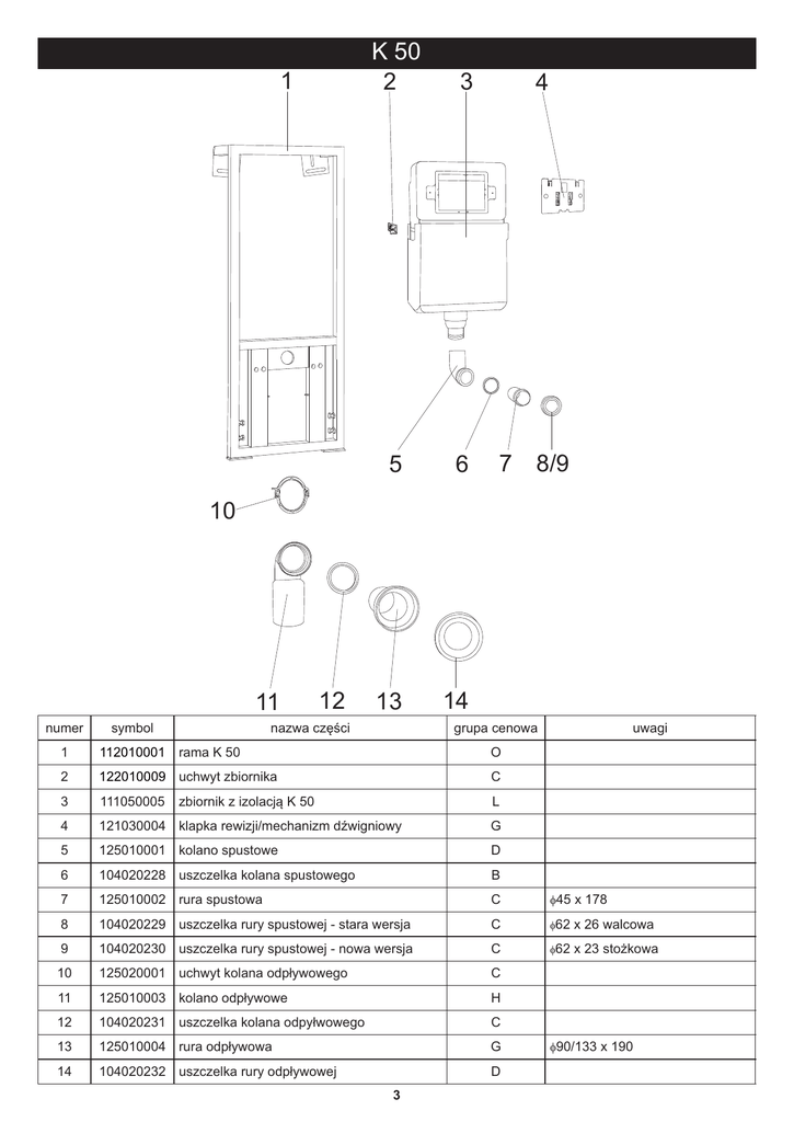 1 K 50 2 3 5 6 13 14 4 7 8/9 10 11 12 numer symbol nazwa części grupa cenowa 1 112010001 2 122010009 uchwyt zbiornika C 3 111050005 zbiornik z izolacją K 50 L 4 121030004 klapka rewizji/mechanizm dźwigniowy G 5 125010001 kolano spustowe D 6 104020228 uszczelka kolana spustowego B 7 125010002 rura spustowa C f45 x 178 8 104020229 uszczelka rury spustowej - stara wersja C f62 x 26 walcowa 9 104020230 uszczelka rury spustowej - nowa wersja C f62 x 23 stożkowa 10 125020001 uchwyt kolana odpływowego C 11 125010003 kolano odpływowe H 12 104020231 uszczelka kolana odpyłwowego C 13 125010004 rura odpływowa G 14 104020232 uszczelka rury odpływowej D rama K 50 uwagi O 3 f90/133 x 190 K 50 2 1 3 4 5 8 7 6 5 4 3 2 1 PrEN 14055-1 Model A020009 6 7 8 9 10 11 12 13 14 15 16 17 18 19 20 numer symbol nazwa części grupa cenowa uwagi 1 121010004 zawór napełniający - nowa wersja H zamienny ze starą wersją 2 121010005 zawór napełniający - stara wersja H wymaga potwierdzenia dostępności 3 121020004 zawór spustowy I 4 124010003 uchwyt zaworu spustowego D 5 103040001 zawór odcinający G 6 701020039 zaślepka otworu zaworu odcinającego B 7 102030099 wąż zasilający wewnętrzny E 8 703010040 uchwyt śruby montażowej przycisku A 9 122010010 zestaw montażowy miski H 10 122010011 zestaw montażowy stelaża G 11 701020040 zaślepka montażowa otworu rewizyjnego D 12 701020041 zaślepka montażowa kolana spustowego C 13 701020042 zaślepka montażowa kolana odpływowego D 14 124010004 mata pod miskę ustępową F 15 121030005 popychacz A 16 121030006 śruba montażowa przycisku A 17 18 19 20 4 1/2" x 3/8" 3/8" x 3/8" L300