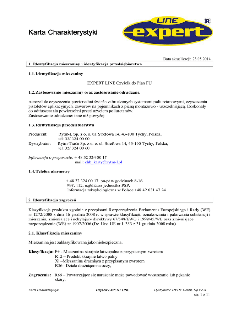Karta Charakterystyki Data aktualizacji: 23.05.2014 1. Identyfikacja mieszaniny i identyfikacja przedsiębiorstwa 1.1. Identyfikacja mieszaniny EXPERT LINE Czyścik do Pian PU 1.2. Zastosowanie mieszaniny oraz zastosowanie odradzane. Aerozol do czyszczenia powierzchni świeżo zabrudzonych systemami poliuretanowymi, czyszczenia pistoletów aplikacyjnych, zaworów na pojemnikach z pianą montażowo - uszczelniającą. Doskonały do odtłuszczania powierzchni przed użyciem poliuretanów. Zastosowanie odradzane: inne niż powyżej. 1.3. Identyfikacja przedsiębiorstwa Producent: Dystrybutor: Rytm-L Sp. z o. o. ul. Strefowa 14, 43-100 Tychy, Polska, tel: 32/ 324 00 00 Rytm-Trade Sp. z o. o. ul. Strefowa 14, 43-100 Tychy, Polska, tel: 32/ 324 00 60 Informacja o preparacie: + 48 32 324 00 17 mail: [email protected] 1.4. Telefon alarmowy + 48 32 324 00 17 pn-pt w godzinach 8-16 998, 112, najbliższa jednostka PSP, Informacja toksykologiczna w Polsce +48 42 631 47 24 2. Identyfikacja zagrożeń Klasyfikacja produktu zgodnie z przepisami Rozporządzenia Parlamentu Europejskiego i Rady (WE) nr 1272/2008 z dnia 16 grudnia 2008 r. w sprawie klasyfikacji, oznakowania i pakowania substancji i mieszanin, zmieniające i uchylające dyrektywy 67/548/EWG i 1999/45/WE oraz zmieniające rozporządzenie (WE) nr 1907/2006 (Dz. Urz. UE nr L 353 z 31 grudnia 2008 roku). 2.1. Klasyfikacja mieszaniny Mieszanina jest zaklasyfikowana jako niebezpieczna. Klasyfikacja: F+ - Mieszanina skrajnie łatwopalna z przypisanym zwrotem R12 – Produkt skrajnie łatwo palny Xi –Mieszanina drażniąca z przypisanym zwrotem R36– Działa drażniąco na oczy, Zagrożenia: R66 – Powtarzające się narażenie może powodować wysuszanie lub pękanie skóry. Karta Charakterystyki Czyścik EXPERT LINE Dystrybutor: RYTM TRADE Sp z o.o. str. 1 z 11 R 67 - Pary mogą wywoływać uczucie senności i zawroty głowy. Gaz palny cięższy od powietrza; może gromadzić się przy powierzchni i w dolnych partiach pomieszczeń. Drogi narażenia: oczy, skóra, przewód pokarmowy, drogi oddechowe. 2.2. Elementy oznakowania: Xi drażniący F+ skrajnie łatwopalny Zwroty R (wskazujące rodzaj zagrożenia): R36 Działa drażniąco na oczy, R66 Powtarzające się narażenie może powodować wysuszanie lub pękanie skóry R67 Pary mogą wywoływać uczucie senności i zawroty głowy Zwroty S (określające warunki bezpiecznego stosowania): S2 Chronić przed dziećmi. S9 Przechowywać pojemnik w miejscu dobrze wentylowanym. S23 Nie wdychać pary, rozpylonej cieczy. S26 Zanieczyszczone oczy przemyć natychmiast dużą ilością wody i zasięgnąć porady lekarza. S46 W razie połknięcia niezwłocznie zasięgnij porady lekarza – pokaż opakowanie lub etykietę. S51 Stosować wyłącznie w dobrze wentylowanych pomieszczeniach. Pojemnik pod ciśnieniem: chronić przed słońcem i nagrzaniem powyżej temperatury +50oC. Nie przekłuwać ani nie spalać, także po zużyciu. Nie rozpylać nad otwartym płomieniem lub żarzącym się materiałem. Nie przechowywać w pobliżu źródeł zapłonu – nie palić tytoniu. Chronić przed dziećmi. „Pary mogą wywoływać uczucie senności i zawroty głowy.” Zawiera: węglowodory alifatyczne <30% 2.3. Inne zagrożenia Nie dotyczy. 3. Skład/ informacja o składnikach 3.1. Substancje Nie dotyczy 3.2. Mieszaniny Składniki niebezpieczne zawarte w mieszaninie: Nazwa Zawartość [%] Nr CAS Nr WE Klasyfikacja 67/548/EWG Klasyfikacja wg ROZPORZĄDZENIA (WE) NR 1272/2008 Aceton (propan-2-on) 65-75 67-64-1 200-662-2 F , R11 Xi, R36, R66, R67 Eye Irrit.2 H319 STOT SE 3 H336 Flam. Liq.2 H225 <30 74-98-6 200-827-9 F+, R12 Flam. Gas 1 H220 01-2119471330-49-xxxx Propan/butan/izobutan Karta Charakterystyki Czyścik EXPERT LINE Dystrybutor: RYTM TRADE Sp z o.o. str. 2 z 11 106-97-8 75-28-5 203-448-7 200-857-2 Press. Gas 4. Środki pierwszej pomocy 4.1 Opis środków pierwszej pomocy Zapewnień dopływ świeżego powietrza. Podać tlen lub założyć Wdychanie: aparat do oddychania, jeżeli sytuacja tego wymaga. W razie potrzeby zapewnić pomoc medyczna Przemywać wielokrotnie dużą ilością czystej letniej wody Kontakt z oczami: trzymając szeroko otwarte powieki przez ok. 15 min. Skontaktować się z lekarzem. Zdjąć zanieczyszczoną odzież. Zanieczyszczoną skórę dokładnie Kontakt ze skórą: spłukać wodą. W przypadku utrzymujących się dolegliwości skonsultować się z lekarzem. Tylko przy całkowitej przytomności poszkodowanego można Połknięcie: pozwolić na samoczynne wymioty. Osobę wymiotująca leżącą na plecach niezwłocznie obrócić na bok. Wypłukać usta. Podać duże ilości wody do picia i zapewnić dopływ świeżego powietrza. Nie podawać do picia mleka, tłuszczów tłuszczów alkoholi. Wezwać lekarza, jeżeli połknięto duże ilości substancji. 4.2. Najważniejsze ostre i opóźnione skutki objawy oraz skutki narażenia Nie dotyczy. 4.3.Wskazania dotyczące wszelkiej natychmiastowej pomocy lekarskiej i szczególnego postępowania z poszkodowanym. Nie dotyczy. 5. Postępowanie w przypadku pożaru 5.1. Środki gaśnicze Stosować ditlenek węgla, suche proszki gaśnicze, pianę gaśniczą alkoholoodporną, rozpyloną wodę w zależności od otoczenia. Zagrożone pożarem zbiorniki usunąć, jeśli to możliwe i nie wiąże się z nadmiernym ryzykiem lub chłodzić rozpyloną wodą z bezpiecznej odległości. Pod wpływem wysokiej temperatury w pojemniku wzrasta ciśnienie, co zagraża jego rozerwaniem i wybuchem. Nieodpowiednie środki gaśnicze: Zwarte strumienie wody. 5.2. Szczególne zagrożenia związane z substancją Preparat skrajnie łatwopalny. Wydzielające się pary są cięższe od powietrza, mogą się utrzymywać przy powierzchni ziemi i przemieszczać przewodami wentylacyjnymi. Zamknięte opakowania/zbiorniki narażone na działanie ognia lub wysokiej temperatury mogą wybuchać w wyniku wzrostu ciśnienia wewnątrz nich. W środowisku pożaru powstają tlenki węgla.