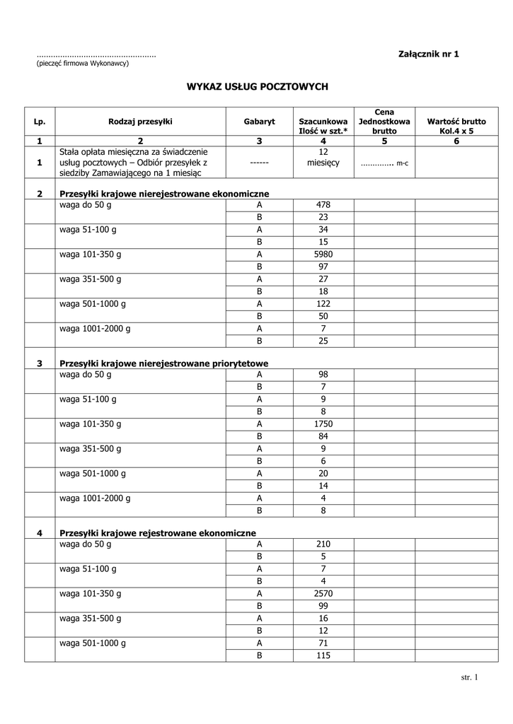 …………………………………………… Załącznik nr 1 (pieczęć firmowa Wykonawcy) WYKAZ USŁUG POCZTOWYCH Lp. 1 1 2 3 4 Rodzaj przesyłki 2 Stała opłata miesięczna za świadczenie usług pocztowych – Odbiór przesyłek z siedziby Zamawiającego na 1 miesiąc Gabaryt Szacunkowa Ilość w szt.* 3 4 12 miesięcy ------ Przesyłki krajowe nierejestrowane ekonomiczne waga do 50 g A B waga 51-100 g A B waga 101-350 g A B waga 351-500 g A B waga 501-1000 g A B waga 1001-2000 g A B 478 23 34 15 5980 97 27 18 122 50 7 25 Przesyłki krajowe nierejestrowane priorytetowe waga do 50 g A B waga 51-100 g A B waga 101-350 g A B waga 351-500 g A B waga 501-1000 g A B waga 1001-2000 g A B 98 7 9 8 1750 84 9 6 20 14 4 8 Przesyłki krajowe rejestrowane ekonomiczne waga do 50 g A B waga 51-100 g A B waga 101-350 g A B waga 351-500 g A B waga 501-1000 g A B 210 5 7 4 2570 99 16 12 71 115 Cena Jednostkowa brutto Wartość brutto Kol.4 x 5 5 6 ………….. m-c str. 1 waga 1001-2000 g 5 6 7 8 A B 29 31 Przesyłki krajowe rejestrowane priorytetowe waga do 50 g A B waga 51-100 g A B waga 101-350 g A B waga 351-500 g A B waga 501-1000 g A B waga 1001-2000 g A B 6 8 12 9 1005 110 13 7 11 32 4 8 Przesyłki krajowe rejestrowane ekonomiczne ZPO waga do 50 g A B waga 51-100 g A B waga 101-350 g A B waga 351-500 g A B waga 501-1000 g A B waga 1001-2000 g A B 168 17 10 9 3384 195 140 18 6 18 3 6 Przesyłki krajowe rejestrowane priorytetowe ZPO waga do 50 g A B waga 51-100 g A B waga 101-350 g A B waga 350-500 g A B waga 501-1000 g A B waga 1001-2000 g A B 12 7 9 5 138 16 8 6 5 7 4 3 Przesyłki zagraniczne nierejestrowane ekonomiczne waga do 50 g Europa waga 51-100 g Europa waga 101-350 g Europa waga 351-500 g Europa waga 501-1000 g Europa 62 8 5 4 6 str. 2 waga 1001-2000 g 9 Przesyłki zagraniczne nierejestrowane ekonomiczne waga do 50 g Azja waga 51-100 g Azja 1 1 Ameryka Płn. waga do 50 g Ameryka Płdn. i Środkowa Ameryka Płdn. i Środkowa 4 Afryka Afryka 1 1 Australia i Oceania Australia i Oceania 1 waga do 50 g waga 51-100 g waga do 50 g waga 51-100 g 11 8 waga do 50 g Waga 51-100 g waga 51-100 g 10 Europa Ameryka Płn. 1 1 1 1 Przesyłki zagraniczne nierejestrowane priorytetowe waga do 50 g Europa waga 51-100 g Europa waga 101-350 g Europa waga 351-500 g Europa waga 501-1000g Europa 8 4 4 3 7 Przesyłki zagraniczne nierejestrowane priorytetowe waga do 50 g Azja waga 51-100 g Azja 1 1 waga do 50 g Ameryka Płn. Ameryka Płn. Ameryka Płn. 1 Ameryka Płdn. i Środkowa Ameryka Płdn. i Środkowa Ameryka Płdn. i Środkowa 1 Afryka Afryka Afryka 1 1 1 Australia i Oceania Australia i Oceania Australia i Oceania 1 Waga 51-100 g Waga 101-350 g waga do 50 g waga 51-100 g waga 101-350 g waga do 50 g waga 51-100 g waga 101-350 g waga do 50 g waga 51-100 g waga 101-350 g 1 1 1 1 1 1 str. 3 12 13 Przesyłki zagraniczne rejestrowane ekonomiczne waga do 50 g Europa waga 51-100 g Europa waga 101-350 g Europa waga 351-500 g Europa waga 501-1000 g Europa waga 1001-2000 g Europa 35 24 18 9 7 5 Przesyłki zagraniczne rejestrowane ekonomiczne waga do 50 g Azja waga 51-100 g Azja waga 101-350 g Azja waga 351-500 g Azja waga 501-1000 g Azja 1 1 1 1 1 waga do 50 g Waga 51-100 g Waga 101-350 g Waga 351-500 g Waga 501-1000 g Ameryka Płn. waga do 50 g Ameryka Płd. Środkowa Ameryka Płd. Środkowa Ameryka Płd. Środkowa Ameryka Płd. Środkowa Ameryka Płd. Środkowa waga 51-100 g waga 101-350 g waga 351-500 g waga 501-1000 g waga do 50 g waga 51-100 g waga 101-350 g waga do 50 g waga 51-100 g waga 101-350 g 14 Ameryka Płn. Ameryka Płn. Ameryka Płn. Ameryka Płn. i 1 i 1 i 1 i 1 i 1 Afryka Afryka Afryka 1 1 1 Australia i Oceania Australia i Oceania Australia i Oceania 1 Przesyłki zagraniczne rejestrowane priorytetowe waga do 50 g Europa waga 51-100 g Europa waga 101-350 g Europa waga 351-500 g Europa waga 501-1000 g Europa waga 1001-2000 g Europa waga do 50 g waga 51-100 g waga do 50 g 4 3 3 2 1 1 1 198 39 12 11 19 9 Azja Azja 1 1 Ameryka Płn. 1 str. 4 Waga 51-100 g Ameryka Płn. 1 waga do 50 g Ameryka Płdn. i Środkowa Ameryka Płdn. i Środkowa 5 Afryka Afryka 1 1 Australia i Oceania Australia i Oceania 1 waga 51-100 g waga do 50 g waga 51-100 g waga do 50 g waga 51-100 g 15 16 15 5 6 Przesyłki zagraniczne rejestrowane ekonomiczne ZPO waga do 50 g Azja 1 Ameryka Płn. Ameryka Płn. 1 Ameryka Płdn. i Środkowa Ameryka Płdn. i Środkowa 2 waga do 50 g Afryka 1 waga do 50 g Australia i Oceania 1 Waga 51-100 g waga do 50 g waga 51-100 g 18 19 1 Przesyłki zagraniczne rejestrowane ekonomiczne ZPO waga do 50 g Europa waga 51-100 g Europa waga 101-350 g Europa waga do 50 g 17 4 1 1 Przesyłki zagraniczne rejestrowane priorytetowe ZPO waga do 50 g Europa waga 51-100 g Europa 30 14 Przesyłki zagraniczne rejestrowane priorytetowe ZPO waga do 50 g Azja 1 waga do 50 g Waga 51-100 g Ameryka Płn. 1 1 waga do 50 g Ameryka Płdn. i Środkowa 1 waga do 50 g Afryka 1 waga do 50 g Australia i Oceania 1 Paczki krajowe ekonomiczne do 1 kg Paczki krajowe ekonomiczne do 2 kg Ameryka Płn. 4 12 str. 5 Paczki krajowe ekonomiczne do 5 kg Paczki krajowe ekonomiczne do 10 kg Paczki krajowe ekonomiczne do 20 kg 10 8 2 20 Paczki Paczki Paczki Paczki krajowe krajowe krajowe krajowe 5 4 4 5 21 Paczki Paczki Paczki Paczki Paczki zagraniczne zagraniczne zagraniczne zagraniczne zagraniczne 22 priorytetowe priorytetowe priorytetowe priorytetowe do do do do 1 kg 2 kg 5 kg 10 kg ekonomiczne ekonomiczne ekonomiczne ekonomiczne ekonomiczne do do do do do 1 2 3 4 5 kg kg kg kg kg Europa Europa Europa Europa Europa 3 3 2 2 1 Paczki zagraniczne ekonomiczne do 1 kg Paczki zagraniczne ekonomiczne do 2 kg Azja Azja 1 1 Paczki zagraniczne ekonomiczne do 1 kg Paczki zagraniczne ekonomiczne do 2 kg Ameryka Płn. 1 1 Paczki zagraniczne ekonomiczne do 1 kg Ameryka Płdn. i Środkowa 1 Paczki zagraniczne ekonomiczne do 1 kg Afryka 1 Paczki zagraniczne ekonomiczne do 1 kg Australia i Oceania 1 Ameryka Płn. Razem wartość brutto: …………………