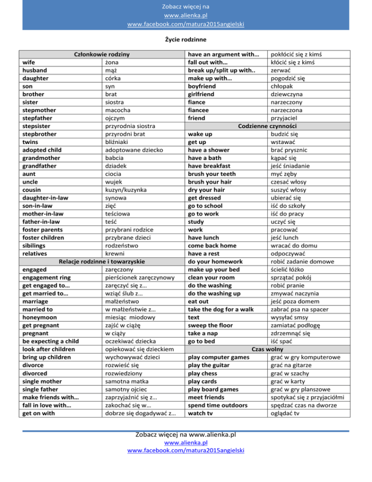 Zobacz więcej na www.alienka.pl www.facebook.com/matura2015angielski Życie rodzinne Członkowie rodziny have an argument with… pokłócić się z kimś wife żona fall out with… kłócić się z kimś husband mąż zerwać wwbreak up/split up with.. daughter córka make up with… pogodzić się son syn boyfriend chłopak brother brat girlfriend dziewczyna sister siostra fiance narzeczony stepmother macocha fiancee narzeczona stepfather ojczym friend przyjaciel stepsister przyrodnia siostra Codzienne czynności stepbrother przyrodni brat wake up budzić się twins bliźniaki get up wstawać adopted child adoptowane dziecko have a shower brać prysznic grandmother babcia have a bath kąpać się grandfather dziadek have breakfast jeść śniadanie aunt ciocia brush your teeth myć zęby uncle wujek brush your hair czesać włosy cousin kuzyn/kuzynka dry your hair suszyć włosy daughter-in-law synowa get dressed ubierać się son-in-law zięć go to school iść do szkoły mother-in-law teściowa go to work iść do pracy father-in-law teść study uczyć się foster parents przybrani rodzice work pracować foster children przybrane dzieci have lunch jeść lunch sibilings rodzeństwo come back home wracać do domu relatives krewni have a rest odpoczywać Relacje rodzinne i towarzyskie do your homework robić zadanie domowe engaged zaręczony make up your bed ścielić łóżko engagement ring pierścionek zaręczynowy clean your room sprzątać pokój get engaged to… zaręczyć się z… do the washing robić pranie get married to… wziąć ślub z… do the washing up zmywać naczynia marriage małżeństwo eat out jeść poza domem married to w małżeństwie z… take the dog for a walk zabrać psa na spacer honeymoon miesiąc miodowy text wysyłać smsy get pregnant zajść w ciążę sweep the floor zamiatać podłogę pregnant w ciąży take a nap zdrzemnąć się be expecting a child oczekiwać dziecka go to bed iść spać look after children opiekować się dzieckiem Czas wolny bring up children wychowywać dzieci play computer games grać w gry komputerowe divorce rozwieść się play the guitar grać na gitarze divorced rozwiedziony play chess grać w szachy single mother samotna matka play cards grać w karty single father samotny ojciec play board games grać w gry planszowe make friends with… zaprzyjaźnić się z… meet friends spotykać się z przyjaciółmi fall in love with… zakochać się w… spend time outdoors spędzać czas na dworze get on with dobrze się dogadywać z… watch tv oglądać tv Zobacz więcej na www.alienka.pl www.alienka.pl www.facebook.com/matura2015angielski Zobacz więcej na www.alienka.pl www.facebook.com/matura2015angielski have a party go swimming go to a concert go to a party listen to music organizować imprezę iść popływać iść na koncert iść na imprezę słuchać muzyki ww Zobacz więcej na www.alienka.pl www.alienka.pl www.facebook.com/matura2015angielski