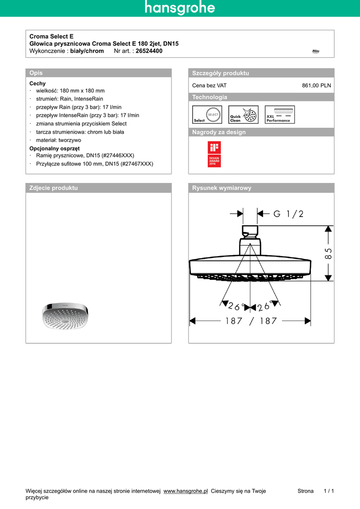 Croma Select E Głowica prysznicowa Croma Select E 180 2jet, DN15 Wykonczenie : biały/chrom___Nr art. : 26524400 Opis Szczegóły produktu Cechy · wielkość: 180 mm x 180 mm Cena bez VAT · strumień: Rain, IntenseRain 861,00-PLN Technologia · przepływ Rain (przy 3 bar): 17 l/min · przepływ IntenseRain (przy 3 bar): 17 l/min · zmiana strumienia przyciskiem Select · tarcza strumieniowa: chrom lub biała Nagrody za design · materiał: tworzywo Opcjonalny osprzęt · Ramię prysznicowe, DN15 (#27446XXX) · Przyłącze sufitowe 100 mm, DN15 (#27467XXX) Zdjecie produktu Rysunek wymiarowy Więcej szczegółów online na naszej stronie internetowej_www.hansgrohe.pl_Cieszymy się na Twoje przybycie Strona 1/1