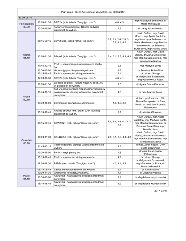Plan zajęć - HL-III-1A, semestr Wszystkie, rok 2016/2017 30.09-06.10 Poniedziałek 30.09 Wtorek 01.10 10:00-11:30 B2/B2+ (zob. tabela "Drugi jęz. rom.") 13:30-15:00 Kultury prekolumbijskie. Obszar andyjski przedmiot do wyboru 08:15-09:45 B2/A2 (zob. tabela "Drugi jęz. rom.") 10:00-11:30 B2+/A2 (zob. tabela "Drugi jęz. rom.") 13:30-15:00 15:15-16:45 PNJH - konwersacje i rozumienie ze słuchu ćw. Historia języka hiszpańskiego konw. PNJH - sprawności zintegrowane ćw. 17:00-18:30 B2/B2+ (zob. tabela "Drugi jęz. rom.") 11:45-13:15 10:00-11:30 11:45-13:15 Środa 02.10 13:30-15:00 Seminarium licencjackie seminarium 15:15-16:45 Analiza struktur leks.-gram. (Don Quijote) przedmiot do wyboru 08:15-09:45 B2/A2/B2+ (zob. tabela "Drugi jęz. rom.") 10:00-11:30 B2+/B2/A2 (zob. tabela "Drugi jęz. rom.") 11:45-13:15 Teatr hiszpański Złotego Wieku przedmiot do wyboru 13:30-15:00 PNJH - język pisany ćw. 15:15-16:45 PNJH - sprawności zintegrowane ćw. 17:00-18:30 B2B2+ (zob. tabela "Drugi jęz. rom.") 08:15-09:45 10:00-11:30 Zawód tłumacz przedmiot do wyboru Gramatyka kontrastywna konw. Akwizycja i nauka języka drugiego przedmiot do wyboru Akwizycja i nauka języka drugiego przedmiot do wyboru Czwartek 03.10 Piątek 04.10 La edad de plata - kultura hiszp. w pocz. XX w. przedmiot do wyboru XIX-wieczna literatura hispanoamerykańska w poszukiwaniu własnej tożsamości przedmiot do wyboru 13:30-15:00 15:15-16:45 4.8, 4.3 mgr Katarzyna Setkowicz, dr Marta Minkiewicz 4.3 dr Jerzy Achmatowicz Kevin Dufour, mgr David Monzo, mgr Agata Zapłotna, 0.2, 2.1, 2.4, 2.5, 3.1, mgr Katarzyna Setkowicz, dr 3.8, 4.1, 4.3 Marta Minkiewicz, mgr Monika Szmulewska, dr Zuzanna Bułat-Silva, mgr Natalia Likus Kevin Dufour, mgr David Monzo, dr Marta Minkiewicz, 2.4, 3.1, 3.8, 4.1, 4.3 mgr Monika Szmulewska, mgr Aleksandra Matyja 2.5 mgr Martyna Sońta 4.3 3.1 dr Zuzanna Bułat-Silva dr Łukasz Smuga dr Małgorzata Szczepanik, mgr Gabriele La Rosa 4.3, 4.1 2.5 dr Agata Draus-Kłobucka 4.8 dr hab. Marcin Kurek 4.8, 4.3, 3.8 dr hab., prof. nadzw. UWr Beata Baczyńska, dr Ewa Kulak, dr José Luis Losada Palenzuela 2.1 dr Monika Głowicka Kevin Dufour, mgr Agata Zapłotna, mgr Martyna Sońta, 2.1, 2.4, 3.8, 4.1, 4.3, mgr Monika Szmulewska, dr 4.8 Zuzanna Bułat-Silva, mgr Natalia Likus Kevin Dufour, mgr David Monzo, dr Marta Minkiewicz, 2.5, 3.1, 3.8, 4.1, 4.8 mgr Monika Szmulewska, mgr Aleksandra Matyja dr hab., prof. nadzw. UWr 4.8 Beata Baczyńska dr José Luis Losada 4.8 Palenzuela 4.1 dr Łukasz Smuga dr Małgorzata Szczepanik, 4.3, 4.1, 3.2 mgr Gabriele La Rosa, dr Maurizio Mazzini 2.1 dr Anna Kuźnik 4.1 dr Justyna Wesoła 2.1 dr Magdalena Krzyżostaniak 3.2 dr Magdalena Krzyżostaniak 2017-03-07