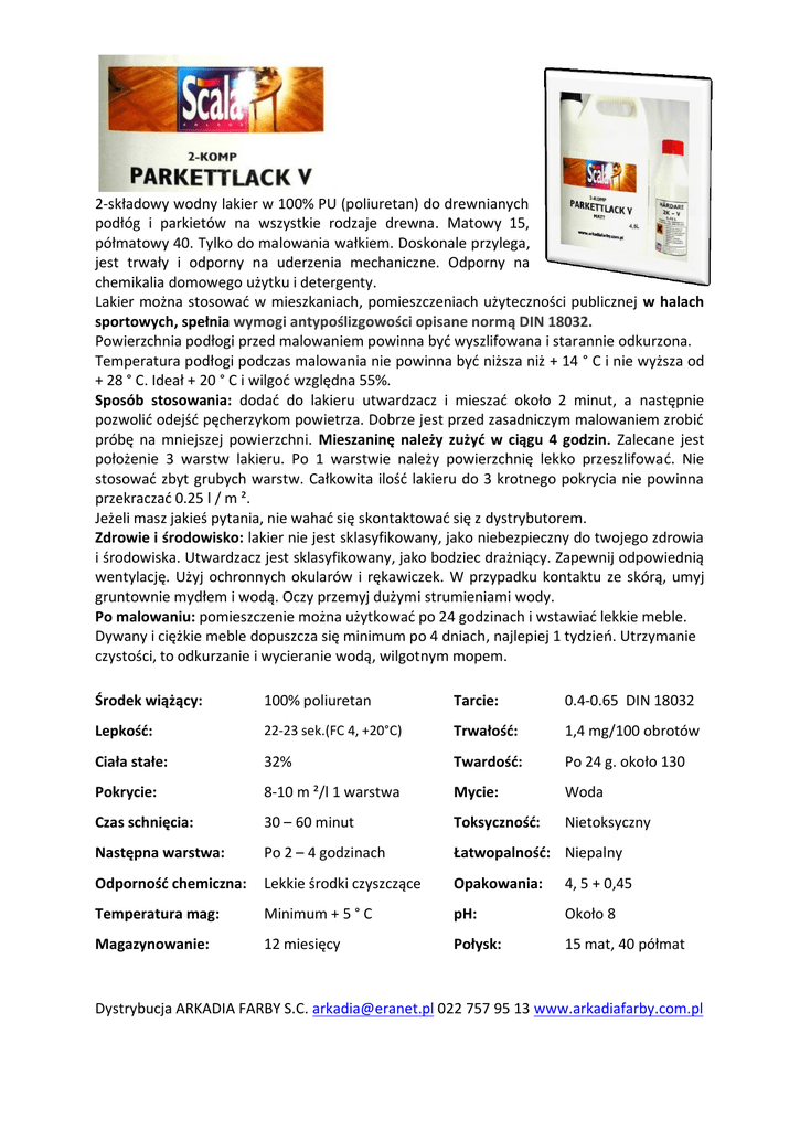 2-składowy wodny lakier w 100% PU (poliuretan) do drewnianych podłóg i parkietów na wszystkie rodzaje drewna. Matowy 15, półmatowy 40. Tylko do malowania wałkiem. Doskonale przylega, jest trwały i odporny na uderzenia mechaniczne. Odporny na chemikalia domowego użytku i detergenty. Lakier można stosowad w mieszkaniach, pomieszczeniach użyteczności publicznej w halach sportowych, spełnia wymogi antypoślizgowości opisane normą DIN 18032. Powierzchnia podłogi przed malowaniem powinna byd wyszlifowana i starannie odkurzona. Temperatura podłogi podczas malowania nie powinna byd niższa niż + 14 ° C i nie wyższa od + 28 ° C. Ideał + 20 ° C i wilgod względna 55%. Sposób stosowania: dodad do lakieru utwardzacz i mieszad około 2 minut, a następnie pozwolid odejśd pęcherzykom powietrza. Dobrze jest przed zasadniczym malowaniem zrobid próbę na mniejszej powierzchni. Mieszaninę należy zużyd w ciągu 4 godzin. Zalecane jest położenie 3 warstw lakieru. Po 1 warstwie należy powierzchnię lekko przeszlifowad. Nie stosowad zbyt grubych warstw. Całkowita ilośd lakieru do 3 krotnego pokrycia nie powinna przekraczad 0.25 l / m ². Jeżeli masz jakieś pytania, nie wahad się skontaktowad się z dystrybutorem. Zdrowie i środowisko: lakier nie jest sklasyfikowany, jako niebezpieczny do twojego zdrowia i środowiska. Utwardzacz jest sklasyfikowany, jako bodziec drażniący. Zapewnij odpowiednią wentylację. Użyj ochronnych okularów i rękawiczek. W przypadku kontaktu ze skórą, umyj gruntownie mydłem i wodą. Oczy przemyj dużymi strumieniami wody. Po malowaniu: pomieszczenie można użytkowad po 24 godzinach i wstawiad lekkie meble. Dywany i ciężkie meble dopuszcza się minimum po 4 dniach, najlepiej 1 tydzieo. Utrzymanie czystości, to odkurzanie i wycieranie wodą, wilgotnym mopem. Środek wiążący: 100% poliuretan Tarcie: 0.4-0.65 DIN 18032 Lepkośd: 22-23 sek.(FC 4, +20°C) Trwałośd: 1,4 mg/100 obrotów Ciała stałe: 32% Twardośd: Po 24 g. około 130 Pokrycie: 8-10 m ²/l 1 warstwa Mycie: Woda Czas schnięcia: 30 – 60 minut Toksycznośd: Nietoksyczny Następna warstwa: Po 2 – 4 godzinach Łatwopalnośd: Niepalny Odpornośd chemiczna: Lekkie środki czyszczące Opakowania: 4, 5 + 0,45 Temperatura mag: Minimum + 5 ° C pH: Około 8 Magazynowanie: 12 miesięcy Połysk: 15 mat, 40 półmat Dystrybucja ARKADIA FARBY S.C. [email protected] 022 757 95 13 www.arkadiafarby.com.pl