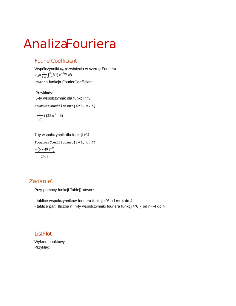 - tablice par: {liczba n, n-ty wspolczynniki fouriera funkcji t^6 } od n=-4 do 4