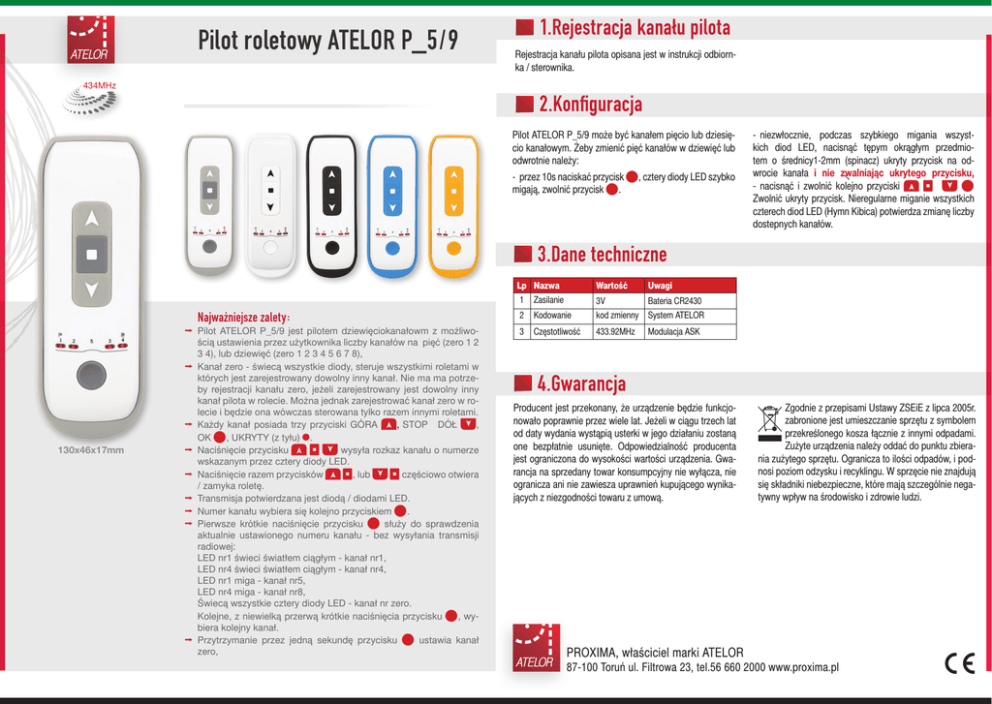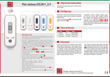 Pilot roletowy ATELOR P_5/9 1.Rejestracja kanału pilota Rejestracja kanału pilota opisana jest w instrukcji odbiornka / sterownika. 434MHz 2.Konfiguracja Pilot ATELOR P_5/9 może być kanałem pięcio lub dziesięcio kanałowym. Żeby zmienić pięć kanałów w dziewięć lub odwrotnie należy: - przez 10s naciskać przycisk , cztery diody LED szybko migają, zwolnić przycisk . -niezwłocznie, podczas szybkiego migania wszystkich diod LED, nacisnąć tępym okrągłym przedmiotem o średnicy1-2mm (spinacz) ukryty przycisk na odwrocie kanała i nie zwalniając ukrytego przycisku, -nacisnąć i zwolnić kolejno przyciski Zwolnić ukryty przycisk. Nieregularne miganie wszystkich czterech diod LED (Hymn Kibica) potwierdza zmianę liczby dostepnych kanałów. 3.Dane techniczne Najważniejsze zalety: j Pilot ATELOR P_5/9 jest pilotem dziewięciokanałowm z możliwo- 130x46x17mm ścią ustawienia przez użytkownika liczby kanałów na pięć (zero 1 2 3 4), lub dziewięć (zero 1 2 3 4 5 6 7 8), j Kanał zero - świecą wszystkie diody, steruje wszystkimi roletami w których jest zarejestrowany dowolny inny kanał. Nie ma ma potrzeby rejestracji kanału zero, jeżeli zarejestrowany jest dowolny inny kanał pilota w rolecie. Można jednak zarejestrować kanał zero w rolecie i będzie ona wówczas sterowana tylko razem innymi roletami. j Każdy kanał posiada trzy przyciski GÓRA , STOP DÓŁ , OK , UKRYTY (z tyłu) �. j Naciśnięcie przycisku wysyła rozkaz kanału o numerze wskazanym przez cztery diody LED. j Naciśnięcie razem przycisków , lub częściowo otwiera / zamyka roletę. j Transmisja potwierdzana jest diodą / diodami LED. j Numer kanału wybiera się kolejno przyciskiem . j Pierwsze krótkie naciśnięcie przycisku służy do sprawdzenia aktualnie ustawionego numeru kanału - bez wysyłania transmisji radiowej: LED nr1 świeci światłem ciągłym - kanał nr1, LED nr4 świeci światłem ciągłym - kanał nr4, LED nr1 miga - kanał nr5, LED nr4 miga - kanał nr8, Świecą wszystkie cztery diody LED - kanał nr zero. Kolejne, z niewielką przerwą krótkie naciśnięcia przycisku , wybiera kolejny kanał. j Przytrzymanie przez jedną sekundę przycisku ustawia kanał zero, Lp Nazwa Wartość Uwagi 1 Zasilanie 3V Bateria CR2430 2 Kodowanie kod zmienny System ATELOR 3 Częstotliwość 433.92MHz Modulacja ASK 4.Gwarancja Producent jest przekonany, że urządzenie będzie funkcjonowało poprawnie przez wiele lat. Jeżeli w ciągu trzech lat od daty wydania wystąpią usterki w jego działaniu zostaną one bezpłatnie usunięte. Odpowiedzialność producenta jest ograniczona do wysokości wartości urządzenia. Gwarancja na sprzedany towar konsumpcyjny nie wyłącza, nie ogranicza ani nie zawiesza uprawnień kupującego wynikających z niezgodności towaru z umową. Zgodnie z przepisami Ustawy ZSEiE z lipca 2005r. zabronione jest umieszczanie sprzętu z symbolem przekreślonego kosza łącznie z innymi odpadami. Zużyte urządzenia należy oddać do punktu zbierania zużytego sprzętu. Ogranicza to ilości odpadów, i podnosi poziom odzysku i recyklingu. W sprzęcie nie znajdują się składniki niebezpieczne, które mają szczególnie negatywny wpływ na środowisko i zdrowie ludzi. PROXIMA, właściciel marki ATELOR 87-100 Toruń ul. Filtrowa 23, tel.56 660 2000 www.proxima.pl