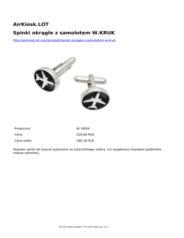 AirKiosk.LOT Spinki okrągłe z samolotem W.KRUK http://airkiosk.lot.com/produkt/spinki-okragle-z-samolotem-w-kruk Producent W. KRUK Cena 229.00 PLN Cena netto 186.18 PLN Stylowe spinki do koszuli wykonane ze szlachetnego srebra. Ich wyjątkowy charakter podkreśla motyw samolotu. TXT_PDF_PAGE_NUMBER 1 TXT_PDF_PAGE_OUT_OF 1