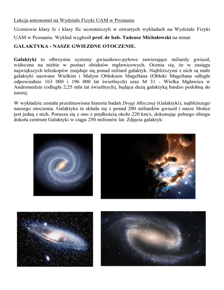 Lekcja astronomii na Wydziale Fizyki UAM w Poznaniu Uczniowie klasy Ic i klasy IIc uczestniczyli w otwartych wykładach na Wydziale Fizyki UAM w Poznaniu. Wykład wygłosił prof. dr hab. Tadeusz Michałowski na temat GALAKTYKA - NASZE GWIEZDNE OTOCZENIE. Galaktyki to olbrzymie systemy gwiazdowo-pyłowe zawierające miliardy gwiazd, widoczne na niebie w postaci obiektów mgławicowych. Ocenia się, że w zasięgu największych teleskopów znajduje się ponad miliard galaktyk. Najbliższymi z nich są małe galaktyki nazwane Wielkim i Małym Obłokiem Magellana (Obłoki Magellana odległe odpowiednio 163 000 i 196 000 lat świetlnych) oraz M 31 - Wielka Mgławica w Andromedzie (odległa 2,25 mln lat świetlnych), będąca dużą galaktyką bardzo podobną do naszej. W wykładzie została przedstawiona historia badań Drogi Mlecznej (Galaktyki), najbliższego naszego otoczenia. Galaktyka ta składa się z ponad 200 miliardów gwiazd i nasze Słońce jest jedną z nich. Porusza się z ono z prędkością około 220 km/s, dokonując pełnego obiegu dokoła centrum Galaktyki w ciągu 250 milionów lat. Zdjęcia galaktyk: Po wykładach uczniowie mieli możliwość zwiedzania Instytutu Fizyki UAM w Poznaniu oraz wzięcia udziału w pokazach doświadczeń fizycznych. Dużym zainteresowaniem zwiedzających cieszyło się wahadło umieszczone w holu uniwersytetu oraz gridy komputerowe czyli komputery przeznaczone do wykonywania zaawansowanych obliczeń fizycznych.