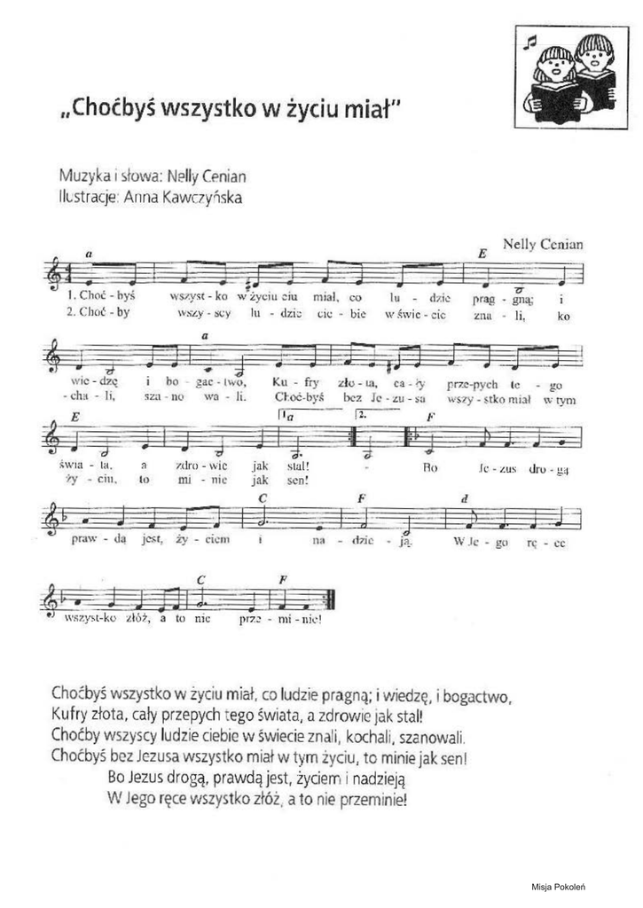 „Choćbyś wszystko w życiu miał" Muzyka i słowa: Nelly Cenian llt-stracje: Anna Kawczyńska ~ ~I . '„'· Choć 2. C hoć j J - hyś - by \VS-z; st - ko 1 ,v„życiu wszy - .scy c iu lu - dzic J mia ł. CIC Nell y Cenian E co - bi~ J I J j lu \V Ś\vic d7.ic- cie .J'.] prag 41111 ?T gną; ko li, - a J 3 wie - d2o< - dm - li, bo - gac - (\Yl•, 1 sza - no Ku - fry '\Va - Il. Cl:oć-by~ rr;, E ~J ~\v1a ~y J la. ~ - cin. prnw - I J J ;-:<iro - wie j mi (t) dą - I J. J jc.-r, fy - cic1u jak jak wszyst-ko J jJ I J. :.:łó7., a to nic "' I F J ~ Ro stal! sen! c rl· ~- -J na - <17.ic - ją. d jE j W .le - go J J) r~ - ce „ c •J 12. prze-pych te - go wszy - $tko mi:.1 w tym Jl' - ,J- - ni c • ca - Jy bo:-z Je • zu - s:a :d o - 1a, j J -I Jmi - nk! • :'.I pr7.·~ Cho~byś wszystko w życiu m iał, co ludzie pragną; i wiedzę, i bogactwo, Kufry złota . caly przepych tego świata, a zdrowie jak stal! Choćby wszyscy ludzie ciebie w świecie znali, kochali. szanowali. Choćbyś bez Jezusa wszystko m iał w tym życiu , to minie jak sen! Bo Jezus drogą, prawdą jest, życiem i nad zieją \IV Jego ręce wszystko złóż. a to nie przeminie! Misja Pokoleń Pomocą w zrozumieniu słóvv p:osenki dla dzieci m~odszych mogą być ilvstracje zamieszczone poniżej lub zndleLione i \'vycięte z kolorowycr. gazet: *wiedza (komputer, książki. .. ), *bogactwo (pałac, luksusovvy Jacht„ ) * kufer ze złotem. "silny i zdrowy człowiek, * śpi ący człowiek, któremu cos się śni, •symbol drogi, krzyża, nieba. Przed rozpoczęciem śpiewu rozdajemy dzieciom ilJstracje. Czytamy słcwa i dzieci ustalają ko lejność ilustracji. Następnie stajemy w kr~gu, aby dzieci widziały ilustracje. Pooczas śpiewu dziecko trzymające daną ilustracje w rę kach podnosi ją do góry. Gdy słowa piosenki zostaną przez dzieci opanowane, możemy uroz maicić śpiewani; w ten sposób, że dzieci stoją w rzędzie i dziecko z odpowiednią ilustracja robi krok do przodu, odwraca się i pokazuje wszystkim pozostałym ilustracje. Piosenka znakomicie nadaje się do tego, aby dzieci zaprezentowały ją na naboźeństwie i nauczyty wszystkich obecnych. Rozmowa Piosenka mówi o największej wartości w życiu, to jest zaufaniu Jezusowi. Moźesz jej nauczać w powiązan iu z wieloma lekcjami ewangelizacyjnymi, które mówią o oddaniu życia Jezusowi i że tylko ta więź przetrwa aż za grób. \Vszystko, o co ludzie zabiegają, kończy się w chwili śmierci, a często nawet wcześniej. Proponowane pytania do rozmowy: • Co sprawia, że ludzie są szczęśliwi' • Jak długo trvva szczęście ludzi bogatych, zdrowych? • Co może być cenniejsze niż złoto? • Znasz ludzi, którzy nie zabiegają o pieniądze, czy nowoczesny sprzęt, ale cieszą się, że spotkali na sv11ej drodze Jezusa? \N jaki sposób można połączyć z pioserką werset z Ew. Mat. ó:33 „Szukajcie najpierw Królestwa Bożego i sprawiedliwości jego, a wszystko inne będzie warn dodane"? „Łatwiej v~ielbłądowi przejść przez ucho igielne, niż bogatP.mu wejść do Królestwa Boźego" Mat. 19:24 Jak myślisz, dlaczego bogatemu człowiekowi, trudno jest wejść do Królestwa BoźP.go? Co mu '""tym przeszkadza? Misja Pokoleń . d0 piosenki llustraqe I j \ I A ~.Q II\11 I I Misja Pokoleń Ilustracje do piosenki Misja Pokoleń