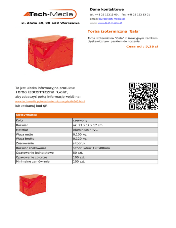 Dane kontaktowe tel. +48 22 122 13 00 , fax. +48 22 122 13 01 email: [email protected] ul. Złota 59, 00-120 Warszawa www: www.tech-media.pl Torba izotermiczna 'Gala' Torba izotermiczna "Gala" z izolacyjnym zamkiem błyskawicznym i paskiem do noszenia. Cena od : 5,28 zł To jest ulotka informacyjna produktu: Torba izotermiczna 'Gala' , aby zobaczyć pełną informację wejdź na: www.tech-media.pl/torba,izotermiczna,gala,04645.html lub zeskanuj kod QR. Specyfikacja Kolor czerwony Rozmiar ok. 21 x 17 x 17 cm Materiał Aluminium / PVC Waga netto 0,100 kg. Waga brutto 0,120 kg. Znakowanie sitodruk Rozmiar znakowania sitodrukdruk:120x80mm Opakowanie jednostkowe 50 szt. Opakowanie zbiorcze 100 szt. Minimalne zamówienie 100 szt.