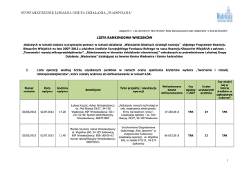 STOWARZYSZENIE LOKALNA GRUPA DZIAŁANIA „WADOVIANA” Załącznik nr 1 do Uchwały Nr XIV/197/2014 Rady Stowarzyszenia LGD „Wadoviana” z dnia 26.05.2014r. LISTA RANKINGOWA WNIOSKÓW złożonych w ramach naboru o przyznanie pomocy w ramach działania „Wdrażanie lokalnych strategii rozwoju” objętego Programem Rozwoju Obszarów Wiejskich na lata 2007-2013 z udziałem środków Europejskiego Funduszu Rolnego na rzecz Rozwoju Obszarów Wiejskich z zakresu : „Tworzenie i rozwój mikroprzedsiębiorstw”, „Różnicowanie w kierunku działalności nierolniczej ” wdrażanych za pośrednictwem Lokalnej Grupy Działania „Wadoviana” działającej na terenie Gminy Wadowice i Gminy Andrychów. I. Numer wniosku III/03/2013 III/02/2013 Lista operacji według liczby uzyskanych punktów w ramach oceny spełniania kryteriów wyboru mikroprzedsiębiorstw”, które zostały wybrane do dofinansowania w ramach LSR. Data wpływu 02.07.2013 02.07.2013 „Tworzenie i rozwój Czy mieści się w Liczba limicie uzyskanych środków w punktów ogłoszonym naborze? Godzina wpływu Beneficjent Tytuł projektu/ Lokalizacja operacji Wnioskowana kwota dofinansowania Czy zgodny z LSR? 14.20 Łukasz Koczot; Adres Wnioskodawcy: os. Pod Skarpą 19/27, 34-100 Wadowice, NIP Wnioskodawcy: 551241-52-44; Numer identyfikacyjny Wnioskodawcy: 068713983 „Wdrażanie nowych technologii w celu zwiększenia atrakcyjności firmy na lokalnym rynku”; Lokalizacja operacji : os. Pod Skarpą 19/27, 34-100 Wadowice 19 250,00 zł TAK 24 TAK 11.45 Monika Szumna; Adres Wnioskodawcy: ul. Wspólna 106, 34-125 Sułkowice, NIP Wnioskodawcy: 858-180-05-67; Numer identyfikacyjny Wnioskodawcy: 068701631 Uruchomienie Gospodarstwa Gościnnego „Pod Jaworem” w miejscowości Sułkowice; Lokalizacja operacji : ul. Wspólna 106, nr działki 673/11, 34-125 Sułkowice 66 623,00 zł TAK 22 TAK 1 STOWARZYSZENIE LOKALNA GRUPA DZIAŁANIA „WADOVIANA” II. Numer wniosku III/01/2013 III. Lista operacji niewybranych do dofinansowania w ramach działania „Tworzenie i rozwój mikroprzedsiębiorstw” w ramach LSR. Data wpływu 01.07.2013 Godzina wpływu 8.21 Beneficjent Katarzyna Madej, Adres wnioskodawcy: Leńcze 96A, 34-142 Leńcze, NIP Wnioskodawcy: 551-244-5156; Numer identyfikacyjny Wnioskodawcy: 068696256 Tytuł projektu/ Lokalizacja operacji Budowa budynku z bala w całości przeznaczonego na wynajem; Lokalizacja operacji: Leńcze, 34-142 Leńcze; nr działki: 2233/4 Wnioskowana kwota dofinansowania 155 278,84 zł Czy Zgodny z LSR? Liczba uzyskanych punktów Czy mieści się w limicie środków w ogłoszonym naborze? NIE zgodnie z § 25 pkt. 1 Regulaminu Rady LGD „Wadoviana” oraz pkt. 6a „Ogólnej procedury przyjmowania i obsługi wniosków” nie przeprowadzono oceny operacji według kryteriów lokalnych przyjętych przez LGD. Nie dotyczy Lista operacji według liczby uzyskanych punktów w ramach oceny spełniania kryteriów wyboru „Różnicowanie w kierunku działalności nierolniczej”, które są zgodne z Lokalną Strategią Rozwoju i zostały wybrane do dofinansowania w ramach LSR. - nie dotyczy 2 STOWARZYSZENIE LOKALNA GRUPA DZIAŁANIA „WADOVIANA” IV. Numer wniosku IV/01/2013 V. VI. Lista operacji niewybranych do dofinansowania w ramach działania „Różnicowanie w kierunku działalności nierolniczej” w ramach LSR. Data wpływu 01.07.2013 Godzina wpływu Beneficjent Tytuł projektu 10.21 Jerzy Roman Lachendrowicz, Adres Wnioskodawcy: ul. Wadowicka 107, Inwałd, 34-120 Andrychów, NIP Wnioskodawcy:551-222-7146; Numer identyfikacyjny Wnioskodawcy: 045706196 Zakup silosa zbożowego oraz pługu do śniegu, Lokalizacja operacji: Inwałd, działka ewid. Nr 809/1, obręb 0002, 34-120 Andrychów Wnioskowana kwota dofinansowania 20 470,00 zł Czy zgodny z LSR? Liczba uzyskanych punktów Czy mieści się w limicie środków w ogłoszonym naborze? NIE zgodnie z § 25 pkt. 1 Regulaminu Rady LGD „Wadoviana” oraz pkt. 6a „Ogólnej procedury przyjmowania i obsługi wniosków” nie przeprowadzono oceny operacji według kryteriów lokalnych przyjętych przez LGD. Nie dotyczy Lista operacji, które nie wpłynęły w terminie - nie dotyczy Lista operacji, w których nie uzyskano adresu wnioskodawcy - nie dotyczy 3
