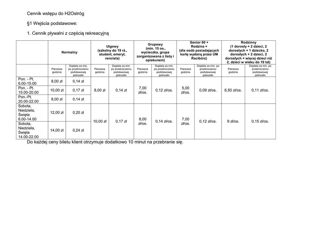 Cennik wstępu do H2Ostróg §1 Wejścia podstawowe: 1. Cennik pływalni z częścią rekreacyjną Normalny Pon. - Pt. 6.00-15.00 Pon. - Pt. 15.00-20.00 Pon.-Pt. 20.00-22.00 Sobota, Niedziela, Święta 6.00-14.00 Sobota, Niedziela, Święta 14.00-22.00 Pierwsza godzina Dopłata za min. po przekroczeniu podstawowej jednostki 8,00 zł 0,14 zł 10,00 zł 0,17 zł 8,00 zł 0,14 zł 12,00 zł 0,20 zł 14,00 zł Ulgowy (szkolny do 19 rż., student, emeryt, rencista) Grupowy (min. 15 os., wycieczka, grupa zorganizowana z listą i opiekunem) Senior 60 + Rodzina + (dla osób posiadających kartę wydaną przez UM Racibórz) Rodzinny (1 dorosły + 2 dzieci, 2 dorosłych + 1 dziecko, 2 dorosłych + 2 dzieci, 2 dorosłych + więcej dzieci niż 2, dzieci w wieku do 19 lat) Pierwsza godzina Dopłata za min. po przekroczeniu podstawowej jednostki Pierwsza godzina Dopłata za min. po przekroczeniu podstawowej jednostki Pierwsza godzina Dopłata za min. po przekroczeniu podstawowej jednostki Pierwsza godzina Dopłata za min. po przekroczeniu podstawowej jednostki 8,00 zł 0,14 zł 7,00 zł/os. 0,12 zł/os. 5,00 zł/os. 0,09 zł/os. 6,50 zł/os. 0,11 zł/os. 10,00 zł 0,17 zł 8,00 zł/os. 0,14 zł/os. 7,00 zł/os. 0,12 zł/os. 9 zł/os. 0,15 zł/os. 0,24 zł Do każdej ceny biletu klient otrzymuje dodatkowo 10 minut na przebranie się. 2. Cennik pływalni z częścią rekreacyjną oraz dostępem do SPA Normalny Pon. - Pt. 6.00-15.00 Pon. - Pt. 15.00-20.00 Pon.-Pt. 20.00-22.00 Sobota, Niedziela, Święta 6.00-14.00 Sobota, Niedziela, Święta 14.00-22.00 Pierwsza godzina Dopłata za min. po przekroczeniu podstawowej jednostki 10,00 zł 0,17 zł 12,00 zł 0,20 zł 10,00 zł 0,17 zł 14,50 zł 0,25 zł 17,00 zł Ulgowy (szkolny do 19 rż., student, emeryt, rencista) Grupowy (min. 15 os., wycieczka, grupa zorganizowana z listą i opiekunem) Senior 60+ Rodzina + Rodzinny (1 dorosły + 2 dzieci, 2 dorosłych + 1 dziecko, 2 dorosłych + 2 dzieci, 2 dorosłych + więcej dzieci niż 2, dzieci w wieku do 19 lat) Pierwsza godzina Dopłata za min. po przekroczeniu podstawowej jednostki Pierwsza godzina Dopłata za min. po przekroczeniu podstawowej jednostki Pierwsza godzina Dopłata za min. po przekroczeniu podstawowej jednostki Pierwsza godzina Dopłata za min. po przekroczeniu podstawowej jednostki 10,00 zł 0,17 zł 8,50 zł/os. 0,15 zł/os. 6,00 zł/os. 0,10 zł/os. 8,00 zł/os. 0,14 zł/os. 12,00 zł 0,20 zł 10,00 zł/os. 0,17 zł/os. 8,50 zł/os. 0,15 zł/os. 11,00zł/os. 0,19 zł/os. 0,29 zł Do każdej ceny biletu klient otrzymuje dodatkowo 10 minut na przebranie się. §2 PROMOCJE: 1. Dzieci do lat 3: wstęp 1zł 2. Bilety wielogodzinne (dla jednej osoby) 2 a. Cennik pływalni z częścią rekreacyjną Bilet wstępu Poniedziałek - Piątek Normalny (2h) 6.00-22.00 Normalny (3h) Pierwsze 2 godziny Dopłata za min. po przekroczeniu podstawowej jednostki Pierwsze 3 godziny Dopłata za min. po przekroczeniu podstawowej jednostki 17,00 zł 0,15 zł 20,00 zł 0,12 zł Normalny (cały dzień) 30,00 zł Ulgowy (2h) Ulgowy (3h) Pierwsze 2 godziny Dopłata za min. po przekroczeniu podstawowej jednostki Pierwsze 3 godziny Dopłata za min. po przekroczeniu podstawowej jednostki 14,00 zł 0,12 zł 16,00 zł 0,09 zł Ulgowy (cały dzień) 24,00 zł Sobota, Niedziela, Święta Bilet wstępu Normalny (2h) 6.00-22.00 Pierwsze 2 godziny Dopłata za min. po przekroczeniu podstawowej jednostki 24,00 zł 0,2 zł Normalny (3 h) Ulgowy (2h) Pierwsze 3 godziny Dopłata za min. po przekroczeniu podstawowej jednostki Normalny (cały dzień) 28,00 zł 0,16 zł 42,00 zł Ulgowy (3h) Pierwsze 2 godziny Dopłata za min. po przekroczeniu podstawowej jednostki Pierwsze 3 godziny Dopłata za min. po przekroczeniu podstawowej jednostki Ulgowy (cały dzień) 17,00 zł 0,15 zł 20,00 zł 0,12 zł 30,00 zł 2 b. Cennik pływalni z częścią rekreacyjną oraz dostępem do SPA Bilet wstępu Poniedziałek - Piątek Normalny (2h) 6.00-22.00 Normalny (3h) Pierwsze 2 godziny Dopłata za min. po przekroczeniu podstawowej jednostki Pierwsze 3 godziny Dopłata za min. po przekroczeniu podstawowej jednostki 20,00 zł 0,17 zł 24,00 zł 0,14 zł Normalny (cały dzień) 36,00 zł Ulgowy (2h) Ulgowy (3h) Pierwsze 2 godziny Dopłata za min. po przekroczeniu podstawowej jednostki Pierwsze 3 godziny Dopłata za min. po przekroczeniu podstawowej jednostki 17,00 zł 0,15 zł 19,00 zł 0,11 zł Ulgowy (cały dzień) 29,00 zł Sobota, Niedziela, Święta Bilet wstępu Normalny (2h) 6.00-22.00 Normalny (3 h) Ulgowy (2h) Pierwsze 2 godziny Dopłata za min. po przekroczeniu podstawowej jednostki Pierwsze 3 godziny Dopłata za min. po przekroczeniu podstawowej jednostki Normalny (cały dzień) 29,00 zł 0,25 zł 34,00 zł 0,19 zł 50,00 zł Ulgowy (3h) Pierwsze 2 godziny Dopłata za min. po przekroczeniu podstawowej jednostki Pierwsze 3 godziny Dopłata za min. po przekroczeniu podstawowej jednostki Ulgowy (cały dzień) 20,00 zł 0,17 zł 24,00 zł 0,14 zł 36,00 zł 3. Bilety wielogodzinne rodzinne: (1+2, 2+1, 2+2, 2+3 i więcej): Cennik pływalni z częścią rekreacyjną (białe tło) oraz z częścią rekreacyjną i dostępem do SPA (szare tło) Poniedziałek - Piątek Bilet wstępu Rodzinny (2h) 6.00-22.00 Rodzinny (3 h) Pierwsze 2 godziny Dopłata za min. po przekroczeniu podstawowej jednostki Pierwsze 3 godziny Dopłata za min. po przekroczeniu podstawowej jednostki 11,00 zł/os. 0,09 zł/os. 13,00 zł/os 0,07 zł/os. 20,00 zł/os. Rodzinny (2h) Rodzinny (3h) Pierwsze 2 godziny Dopłata za min. po przekroczeniu podstawowej jednostki Pierwsze 3 godziny Dopłata za min. po przekroczeniu podstawowej jednostki 13,00 zł/os 0,11 zł/os. 16,00 zł/os. 0,09 zł/os. Rodzinny (cały dzień) 24,00 zł/os. Sobota, Niedziela, Święta Bilet wstępu Rodzinny (2 h) 6.00-22.00 Rodzinny (cały dzień) Rodzinny (3 h) Pierwsze 2 godziny Dopłata za min. po przekroczeniu podstawowej jednostki Pierwsze 3 godziny Dopłata za min. po przekroczeniu podstawowej jednostki 15,00 zł