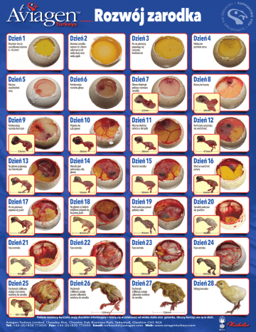 Rozwój zarodka Dzień1 Dzień2 Dzień3 Dzień4 Dzień5 Dzień6 Dzień7 Dzień8 22mm 28mm Rozmiar tarczy zarodkowej wynosi 6–10,5mm Można wyodrębnić oczy Dzień9 Kontynuacja rozrostu kończyn 33mm Dzień13 Na głowie pojawiają się mieszki piór 48mm Dzień17 Po raz pierwszy pojawia się puch 73mm Dzień21 Faza wzrostu 105mm Dzień25 Pęcherzyk żółtkowy zostaje częściowo wcielony do zarodka 105-110mm Rozmiar zarodka wynosi 10–26mm zależności od wieku kury oraz wieku jajek Po raz pierwszy pojawiają się naczynia krwionośne Kontynuacja rozrostu głowy Widoczne jest bicie serca Głowa obejmuje połowę rozmiaru zarodka Dzień10 Rosną kończyny Dzień11 Pojawia się ząb jajowy Dzień12 Można dostrzec odnóża i skrzydła Kończyny zaczynają się wyróżniać 38mm 36mm Dzień14 47mm Dzień15 Mieszki piór pokrywają całą głowę Dzień16 Rozrost zarodka Można wyróżnić pazury 56mm 53mm Dzień18 64mm Dzień19 Na głowie (u białych indyków) pojawia się brązowy puch Dzień20 Puch pokrywa ponad połowę ciała Zarodek pokrywa się puchem 95mm 85mm Dzień22 98mm Dzień23 Faza wzrostu Dzień24 Faza wzrostu Faza wzrostu 105mm 105mm Dzień26 105mm Dzień27 Pęcherzyk żółtkowy zostaje prawie całkowicie wcielony do zarodka Dzień28 Pęcherzyk żółtkowy zostaje całkowicie wcielony do zarodka 120mm Wylęg kurczaka 120mm Podane rozmiary kurczaka mają charakter orientacyjny i różnią się w zależności od wieku stada oraz gatunku. Obrazy kurcząt nie są w skali. Aviagen Turkeys Limited, Chowley Five, Chowley Oak Business Park, Tattenhall, Cheshire CH3 9GA Tel: +44 (0)1829 772020 Fax: +44 (0)1829 772059 Email: [email protected] Web: www.aviagenturkeys.com
