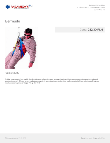 PARAMEDYK sklep ul. Gilarska 103, 03-589 Warszawa 22 679 70 16 Bermude Cena: 282,30 PLN Opis produktu Trójkąt ewakuacyjny bez szelek. Bardzo łatwy do założenia nawet w pozycji siedzącej, jest przeznaczony do szybkiej ewakuacji poszkodowanych. Można go bez trudu dostosować do wszystkich rozmiarów ciała, zarówno dzieci jak i dorosłych, dzięki różnym możliwościom wpinania. Waga: 795 g. EN 1948 Plik wygenerowano: 07-03-2017 Powered by TCPDF (www.tcpdf.org) Oprogramowanie sklepu: AptusShop