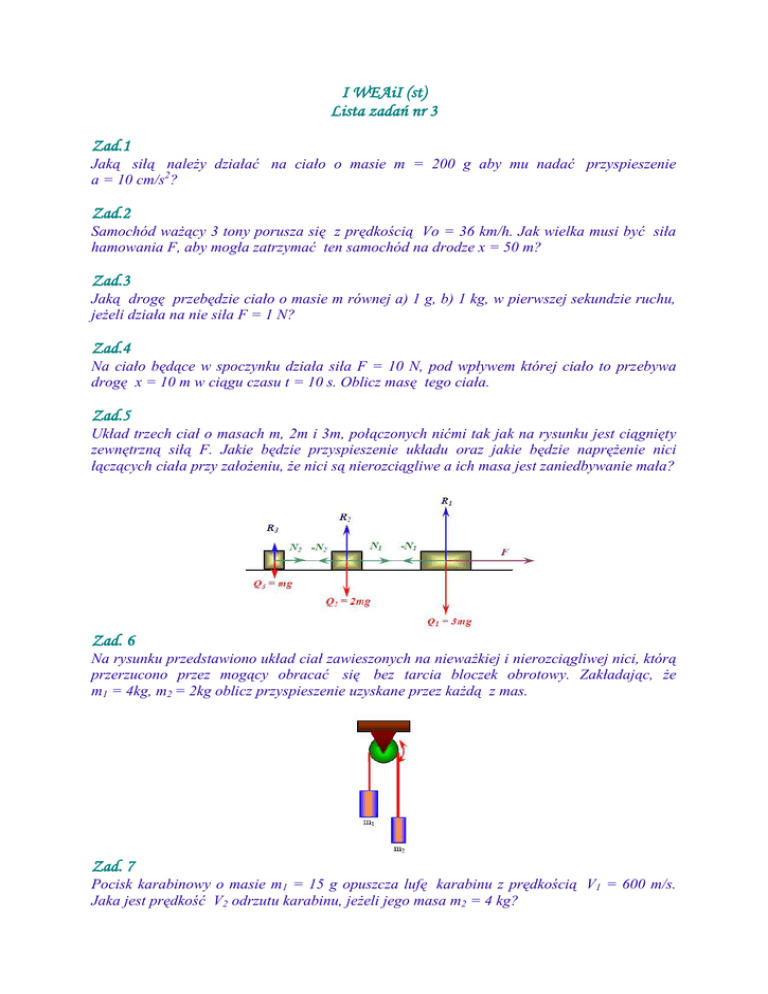 I WEAiI (st) Lista zadań nr 3 Zad.1 Jaką siłą należy działać na ciało o masie m = 200 g aby mu nadać przyspieszenie a = 10 cm/s2? Zad.2 Samochód ważący 3 tony porusza się z prędkością Vo = 36 km/h. Jak wielka musi być siła hamowania F, aby mogła zatrzymać ten samochód na drodze x = 50 m? Zad.3 Jaką drogę przebędzie ciało o masie m równej a) 1 g, b) 1 kg, w pierwszej sekundzie ruchu, jeżeli działa na nie siła F = 1 N? Zad.4 Na ciało będące w spoczynku działa siła F = 10 N, pod wpływem której ciało to przebywa drogę x = 10 m w ciągu czasu t = 10 s. Oblicz masę tego ciała. Zad.5 Układ trzech ciał o masach m, 2m i 3m, połączonych nićmi tak jak na rysunku jest ciągnięty zewnętrzną siłą F. Jakie będzie przyspieszenie układu oraz jakie będzie naprężenie nici łączących ciała przy założeniu, że nici są nierozciągliwe a ich masa jest zaniedbywanie mała? Zad. 6 Na rysunku przedstawiono układ ciał zawieszonych na nieważkiej i nierozciągliwej nici, którą przerzucono przez mogący obracać się bez tarcia bloczek obrotowy. Zakładając, że m1 = 4kg, m2 = 2kg oblicz przyspieszenie uzyskane przez każdą z mas. Zad. 7 Pocisk karabinowy o masie m1 = 15 g opuszcza lufę karabinu z prędkością V1 = 600 m/s. Jaka jest prędkość V2 odrzutu karabinu, jeżeli jego masa m2 = 4 kg?
