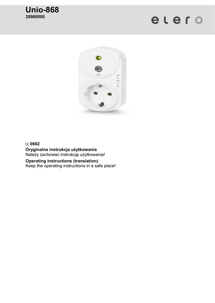 Unio-868 28980000 0682 Oryginalna instrukcja użytkowania Należy zachować instrukcję użytkowania! Operating instructions (translation) Keep the operating instructions in a safe place! Tłumaczenie z oryginalnej wersji niemieckiej. Wszystkie pozostałe dokumenty w innych językach są tłumaczeniami wersji oryginalnej. Wszystkie prawa z rejestracji patentu, wzoru użytkowego lub patentów projektowych zastrzeżone. 2 | PL Ⓒ elero GmbH Spis treści 1 1.1 1.2 1.3 1.4 Ogólne Informacje na temat instrukcji obsługi Normy i dyrektywy Używanie zgodne z przeznaczeniem Gwarancja i odpowiedzialność 2 2.1 2.2 2.3 Bezpieczeństwo Ogólne zasady bezpieczeństwa Wymagania dotyczące personelu Wskazówki bezpieczeństwa dot. eksploatacji 3 3.1 3.2 3.3 3.4 3.5 3.6 3.6.1 3.6.2 3.6.3 3.6.4 5 5 6 6 7 8 8 10 10 Opis produktu Ogólne Zawartość przesyłki Dwukierunkowy system radiowy Jednokierunkowy system radiowy Przygotowanie do uruchomienia Sterowanie (uruchomienie) Wyświetlanie statusu Unio-868 Bezpośrednia obsługa poprzez przycisk sterowania na urządzeniu Unio-868 Obsługa przy pomocy ręcznego nadajnika Obsługa automatyczna (zegary i/lub sensory) Zapamiętywanie (Programowanie) 10 10 11 11 11 12 12 12 13 13 13 14 15 16 3.7 3.7.1 Programowanie nadajników ręcznych, naściennych i zegarowych 3.7.2 Programowanie sensorów (nadajnik sensora) 3.7.3 Kasowanie zaprogramowanego nadajnika w Unio-868 3.7.4 Kasowanie wszystkich zaprogramowanych nadajników w Unio-868 Ⓒ elero GmbH 16 16 PL | 3 4 Dane techniczne 5 Informacje dotyczące deklaracji zgodności WE 6 Usuwanie błędów 7 Naprawa 8 Adres 9 Usuwanie odpadów 10 Wskazówki prawne 4 | PL Ⓒ elero GmbH 17 17 18 18 19 19 20 1 Ogólne 1.1 Informacje na temat instrukcji obsługi Przed pierwszym uruchomieniem produktu Unio-868 należy dokładnie przeczytać instrukcję obsługi oraz przestrzegać wskazówek dotyczących bezpieczeństwa! Wszystkie czynności związane z Unio-868 mogą być przeprowadzone, o ile zostały opisane w niniejszej instrukcji obsługi. Instrukcję należy zachować na wypadek potrzeby ponownego z niej skorzystania. W przypadku przekazania Unio-868, prosimy dołączyć również niniejszą instrukcję obsługi. Symbole ostrzegawcze oraz słowa sygnalizujące użyte w instrukcji. Użyte symbole ostrzegawcze oraz słowa sygnalizujące Ostrzeżenie! Ostrzeżenie przed ryzykiem porażenia prądem elektrycznym! Uwaga! Należy przestrzegać zawartych w instrukcji zaleceń, aby zapewnić bezpieczeństwo użytkowników i zapobiec szkodom materialnym! Ważne: Należy przestrzegać zaleceń! Ważne: Dalsze informacje dotyczące użytkowania Unio-868! Usuwanie odpadów: Podlegające utylizacji części elektroniczne należy oddzielać od odpadów komunalnych. Ⓒ elero GmbH PL | 5 Producent zastrzega sobie prawo do wprowadzenia zmian danych technicznych zawartych w niniejszej instrukcji obsługi. Mogą one różnić się w przypadku niektórych wersji produktu, jednak zasadniczo nie ma miejsca zmiana informacji merytorycznych oraz utrata ważności. Aktualny stan danych technicznych jest zawsze dostępny u producenta. Wszelkie roszczenia z tego tytułu są nieskuteczne. Możliwe są odchylenia od informacji zawartych w tekście i na ilustracjach, uzależnione od rozwoju technicznego, wyposażenia i akcesoriów urządzenia. O innych danych w wersjach specjalnych producent informuje w dokumentacji sprzedaży. Pozostałe dane nie ulegają zmianom. 1.2 Normy i dyrektywy Podczas produkcji zostały zastosowane podstawowe przepisy, normy i dyrektywy określające wymagania dotyczące bezpieczeństwa i zdrowia. Wszelkie dane dotyczące bezpieczeństwa zawarte w niniejszej instrukcji obsługi odnoszą się do przepisów oraz rozporządzeń obowiązujących w momencie redagowania na terytorium Niemiec. Należy bezwzględnie przestrzegać wszelkich danych zawartych w instrukcji obsługi. Oprócz zasad bezpieczeństwa zawartych w niniejszej instrukcji należy przestrzegać obowiązujących w miejscu zastosowania przepisów BHP oraz ochrony środowiska. Przepisy i normy dotyczące oceny bezpieczeństwa znajdują się w deklaracji zgodności WE, potwierdzającej bezpieczeństwo. 1.3 Używanie zgodne z przeznaczeniem Unio-868 jest gniazdem z radiowym przełącznikiem, umożliwia wygodne, bezprzewodowe przełączanie z dużej odległości urządzeń elektrycznych, zasilanych z sieci. Nazwa urządzenia Unio-868 zawiera również wersję bazującą na 915 MHz. 6 | DE Ⓒ elero GmbH Obsługa Unio-868 może następować zarówno poprzez wykorzystanie przycisków umieszczonych na urządzeniu lub przy pomocy należącego do programu produkcji elero ProLine lub ProLine 2 radiowego nadajnika ręcznego. Zaprogramowane dane (np. dot. nadajnika) zostają trwale zapisane w zintegrowanej pamięci (także w przypadku awarii sieci, magazynowania zaprogramowanego urządzenia Unio-868 bez zasilania lub wymiany instalacji elektrycznej). Inne możliwości zastosowania muszą zostać omówione wcześniej z producentem, elero GmbH Antriebstechnik (patrz rozdział 8, adres). Za szkody powstałe w wyniku niewłaściwego użytkowania Unio-868 wyłączną odpowiedzialność ponosi sam użytkownik. Za obrażenia osób i szkody materialne, które powstały w wyniku nadużyć, niewłaściwej obsługi oraz błędów podczas uruchamiania, producent nie ponosi żadnej odpowiedzialności. Jako przypuszczalne, niewłaściwe użycie uważa się zastosowanie odbiegające od przeznaczenia dopuszczonego przez producenta, elero GmbH Antriebstechnik,. Przed pierwszym uruchomieniem prosimy o przeczytanie niniejszej instrukcji obsługi w całości oraz dokładnie; zawiera ona liczne wskazówki dotyczące użytkowania zgodnego z przeznaczeniem urządzenia Unio-868. 1.4 Gwarancja i odpowiedzialność Zasadniczo obowiązują Ogólne Warunki Sprzedaży i Dostawy producenta, elero GmbH Antriebstechnik (patrz rozdział 8, adres). Roszczenia dotyczące odpowiedzialności w przypadku obrażeń