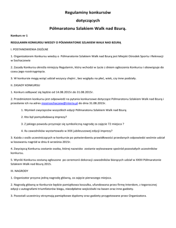 Regulaminy konkursów dotyczących Półmaratonu Szlakiem Walk nad Bzurą. Konkurs nr 1 REGULAMIN KONKURSU WIEDZY O PÓŁMARATONIE SZLAKIEM WALK NAD BZURĄ I. POSTANOWIENIA OGÓLNE 1. Organizatorem Konkursu wiedzy o Półmaratonie Szlakiem Walk nad Bzurą jest Miejski Ośrodek Sportu i Rekreacji w Sochaczewie 2. Zasady Konkursu określa niniejszy Regulamin, który wchodzi w życie z dniem ogłoszenia Konkursu i obowiązuje do czasu jego rozstrzygnięcia. 3. W konkursie mogą wziąć udział wszyscy chętni , bez względu na płeć, wiek, czy inne podziały. II. ZASADY KONKURSU 1. Konkurs odbywać się będzie od 14.08.2015r.do 31.08.2015r. 2. Przedmiotem konkursu jest odpowiedź na pytania konkursowe dotyczące Półmaratonu Szlakiem Walk nad Bzurą i przesłanie ich na adres [email protected] do dnia 31.08.2015r. 1. Wymień zwycięzców wszystkich edycji Półmaratonu Szlakiem Walk nad Bzurą 2. Kto był pomysłodawcą imprezy? 3. Z jakiego powodu przyznaje się symboliczną nagrodę za zajęcie 72 miejsca ? 4. Ilu zawodników wystartowało w XXX jubileuszowej edycji imprezy? 3. Każda z osób uczestniczących w konkursie po potwierdzeniu prawidłowości przesłanych odpowiedzi weźmie udział w losowaniu nagród w dniu 6 września 2015r. 4. Zwycięzcą Konkursu zostanie osoba, której nazwisko zostanie wylosowane spośród pozostałych uczestników konkursu. 5. Wyniki Konkursu zostaną ogłoszone po ceremonii dekoracji zawodników biorących udział w XXXII Półmaratonie Szlakiem Walk nad Bzurą 2015. III. NAGRODY 1. Organizator przyzna jedną nagrodę główną, za zajęcie pierwszego miejsca. 2. Nagrodą główną w Konkursie będzie pamiątkowa koszulka, ufundowana przez firmę Interdom, z tegorocznej edycji z autografami triumfatorów biegu, nieodpłatne wejściówki na basen oraz inne gadżety. 3. Pozostali uczestnicy otrzymają pamiątkowe dyplomy oraz gadżety przygotowane przez Organizatora. IV. POSTANOWIENIA KOŃCOWE 1. Organizator nie ponosi odpowiedzialności za zdarzenia, których przy zachowaniu należytej staranności nie był w stanie przewidzieć, lub którym nie mógł zapobiec, w szczególności spowodowane działaniem siły wyższej lub działaniem osób trzecich, za które Organizator nie ponosi odpowiedzialności. 2. Uczestnicy Konkursu upoważniają Organizatora do publikacji zdjęć i tekstu reportażu na temat przeprowadzonego Konkursu, zawierających ich wizerunek. Jednocześnie uczestnicy Konkursu nie będą dochodzić od Organizatora żadnych roszczeń związanych z publikacją zdjęć i tekstu, o których mowa w zdaniu poprzedzającym. 3. Organizator zastrzega sobie prawo do nieodpłatnego filmowania i fotografowania uczestników Konkursu. 4. Organizator zastrzega sobie prawo dokumentowania oraz wykorzystania prezentacji uczestników Konkursu w radio, TV, prasie, bez wypłacania honorariów. 5. Decyzje Organizatorów Konkursu mają charakter ostateczny i nie przysługuje od nich odwołanie. 6. Przystąpienie do udziału w Konkursie jest jednoznaczne z przyjęciem warunków niniejszego Regulaminu. 7. Organizator zastrzega sobie prawo do odwołania Konkursu bez podania przyczyny. 8. Szczegółowe informacje na temat konkursu można uzyskać pod numerem telefonu 721-121-011. Konkurs nr 2 REGULAMIN KONKURSU DLA GRUP ZORGANIZOWANYCH NA NAJCIEKAWSZY DOPING ZAWODNIKÓW BIORĄCYCH UDZIAŁ W XXXII PÓŁMARATONIE SZLAKIEM WALK NAD BZURĄ 2015 I. POSTANOWIENIA OGÓLNE 1. Organizatorem Konkursu na najciekawszy doping zawodników biorących udział w zawodach XXXII Półmaratonie Szlakiem Walk nad Bzurą jest Miejski Ośrodek Sportu i Rekreacji w Sochaczewie 2. Zasady Konkursu określa niniejszy Regulamin, który wchodzi w życie z dniem ogłoszenia Konkursu i obowiązuje do czasu jego rozstrzygnięcia. 3. W konkursie udział biorą minimum czteroosobowe, a maksymalnie dziesięcioosobowe zorganizowane grupy, które dokonają zgłoszenia. II. ZASADY KONKURSU 1. Konkurs odbędzie się w dniu 6.09.2015r. podczas ostatniego etapu trasy XXXII Półmaratonu Szlakiem Walk nad Bzurą na stadionie MOSiR przy ul. Warszawskiej 80 2. Przedmiotem konkursu jest przygotowanie i przeprowadzenie możliwie najciekawszego dopingu zawodników biorących udział w biegu. 3. Każda z drużyn uczestniczących w konkursie otrzyma indywidualny numer, na podstawie którego możliwa będzie jej identyfikacja podczas głosowania zawodników. 4. Zwycięzcą Konkursu zostanie grupa, której działania zostaną najwyżej ocenione przez zawodników biorących udział w zawodach. 5. Zawodnicy uczestniczący w XXXII Półmaratonie Szlakiem Walk nad Bzurą 2015 za pomocą kuponów do głosowania przekazanych przez Organizatora, oddadzą swój głos na wybraną grupą kibiców. 6. Konkurs wygra drużyna, na którą zawodnicy startujący w Półmaratonie 2015 oddadzą najwięcej głosów. W przypadku remisu decydujący głos mają Organizatorzy 7. Ocenie podlegać będzie: a) zaangażowanie jak największej liczby osób w aktywne kibicowanie; b) oryginalny sposób kibicowania: c) oryginalne akcesoria/gadżety do kibicowania; d) ciekawe hasła, przyśpiewki, wszelkiego rodzaju działania ukierunkowane na aktywny doping; e) zastosowane przebrania. 8. Drużyny zgłoszone do Konkursu zobowiązane są do kibicowania wszystkim zawodnikom Półmaratonu od momentu ukończenia biegu przez pierwszego zawodnika do momentu ukończenia trasy przez ostatniego zawodnika. 9. Wyniki Konkursu zostaną ogłoszone po ceremonii dekoracji zawodników biorących udział w XXXII Półmaratonie Szlakiem Walk nad Bzurą 2015. III. NAGRODY 1. Organizator przyzna jedną nagrodę główną, za zajęcie pierwszego miejsca w głosowaniu zawodników. 2. Nagrodą główną w Konkursie na najciekawszy doping zawodników biorących udział w biegu są pamiątkowe koszulki, ufundowane przez firmę Interdom, z tegorocznej edycji biegu, nieodpłatne wejściówki na basen dla wszystkich członków drużyny kibiców oraz inne gadżety. 3. Pozost