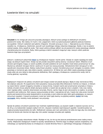 Artykuł pobrano ze strony eioba.pl Łowienie kleni na smużaki Smużaki to nic innego jak sztuczne przynęty pływające, których praca polega na delikatnym smużeniu powierzchni wody. Nie należy ich mylić z tzw. popperami, które są wykorzystywane głównie podczas łowienia szczupaków i których zadaniem jest głośne chlapanie. Smużaki pracują w ciszy :). Najczęściej są one imitacją owadów np. chrabąszczy, biedronek, pszczół czyli wszelkiego rodzaju robactwa latającego. Każdy z nas na pewno widział owada, który wpadł do wody. Taki owad usilnie próbuje odkleić się od powierzchni wody powodując właśnie charakterystyczne smużenie. Ryby, które gustują w takich owadach mogą być więc naszym celem podczas łowienia tego typu przynętami. Jednym z ulubionych pokarmów kleni są chrabąszcze majowe i koniki polne. Owady te często wpadają do wody stając się łatwym łupem kleni. Dzieje się tak przede wszystkim późną wiosną i wczesnym latem. Właśnie w tym okresie spinningista mający w swoim pudełku smużaki podobne do tych owadów może łatwo przechytrzyć te ryby. Wystarczy odnaleźć żerujące klenie i podrzucić im pod nos naszą przynętę. Odnalezienie kleni żerujących w ten sposób jest stosukowo łatwe. Należy nasłuchiwać plusków i szukać charakterystycznych okręgów na wodzie, które powstają w momencie gdy ryba zbiera owada z powierzchni. W Odrze ten sam efekt często powodują żerujące stada uklei ale one robią to zdecydowanie delikatniej. Kleń zjadający chrabąszcza z powierzchni wody robi to trochę głośniej i wyraźniej. Najlepszym miejscem do połowu smużkami jest stojąca woda lub powoli płynąca. Będą to więc starorzecza Odry lub większe zatoczki. Po wypatrzeniu kleni posyłamy naszą przynętę klika-klikanaście metrów za miejsce, w którym są nasze klenie i powoli ściągamy smużaka w naszą stronę. Czasami warto jest przytrzymać przynętę w miejscu (wtedy smużak smuży jedynie dzięki płynącej wodzie) a nawet dać jej spłynąć wraz z prądem. Cały czas należy mieć napiętą żyłkę i uważnie obserwować przynętę. Branie, oprócz tego że jest odczuwalne na wędce, to przede wszystkim jest widoczne. Kleń zasysa naszą przynętę od dołu i najczęściej od tyłu. Często też ryba przez moment płynie pod powierzchnią wody bezpośrednio za przynętą co jest widoczne jako lekki garb podążający za naszym sztucznym owadem. Czasami przyłowem może być okoń (gdy łowimy na płytkiej wodzie), boleń lub mały szczupak, który niestety może pozbawić nas przynęty. Sprzęt do połowu smużkami powinien być możliwie najdelikatniejszy. Ja używam wędki o ciężarze wyrzutu od 4 g do 20 g a na kołowrotek nawijam żyłkę 0.16 mm. Używam możliwie najmniejszych agrafek i karabińczyków lub wiążę przynętę bezpośrednio do żyłki. Delikatność zestawu jest nam potrzebna nie tylko do tego aby nie zniechęcić klenia do brania ale również do tego aby móc posłać naszego smużaka jak najdalej. Smużaki to przynęty stosunkowo młode. Wydaje mi się, że nie są one jeszcze produkowane przez żadną znaną markę. Większość dostępnych modeli to wyroby rękodzielnicze. Pomimo tego na allegro zawsze znajdziemy coś ciekawego. Ja najchętniej łowię na chrabąszcza o nazwie Bromba Pana A. Lipińskiego imitującego chrabąszcza majowego. Swoją drogą chrabąszcze majowe najwcześniej widuje dopiero na początku czerwca :). Artykuł pochodzi ze strony Wędkarska Odra, na której można znaleźć wiele ciekawych artykułów związanych z wędkarstwem i z Odrą. Artykuły pisane są w oparciu o nasze wędkarskie doświadczenie. Znaleźć tam można coś o metodach połowu, o tym jak przechytrzyć dany gatunek ryby oraz kilka informacji na temat naszych łowisk. Zamieszczamy tam również relacje z wypraw z wędką nad rzekę. Autor: aplom Przedruk ze strony: http://wedkarska-odra.pl/metody/lowienie-kleni-na-smuzaki Artykuł pobrano ze strony eioba.pl