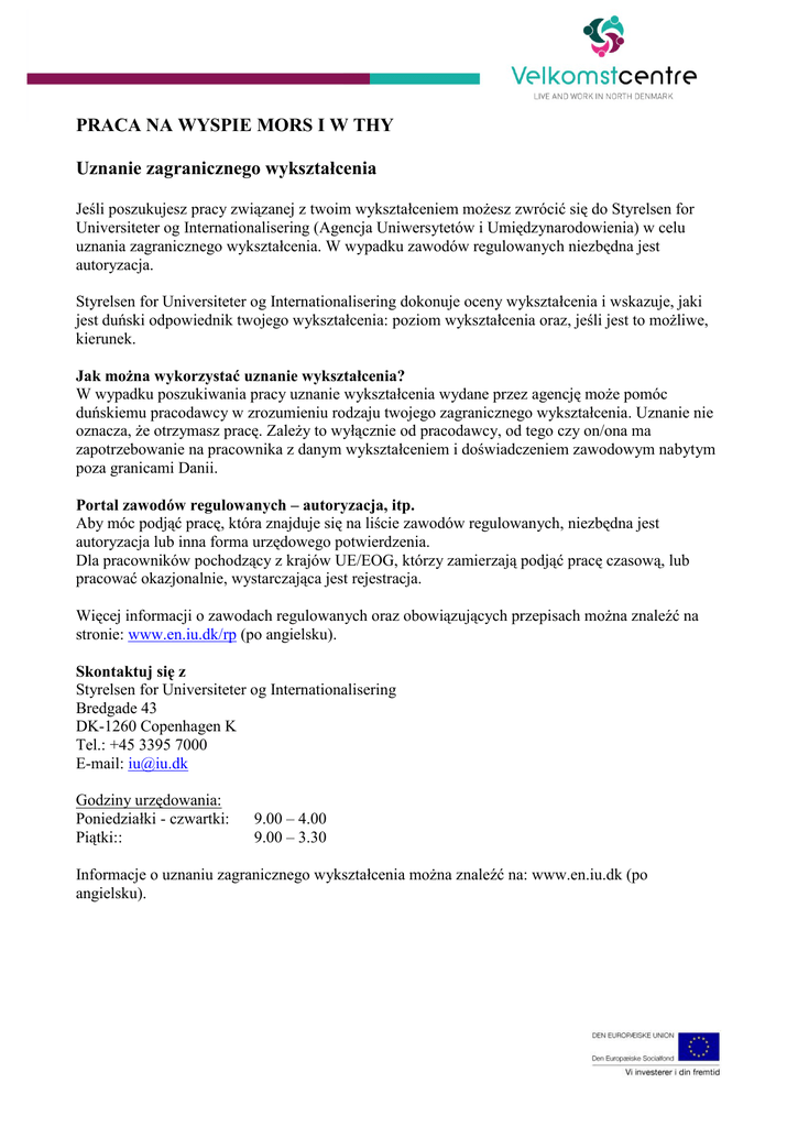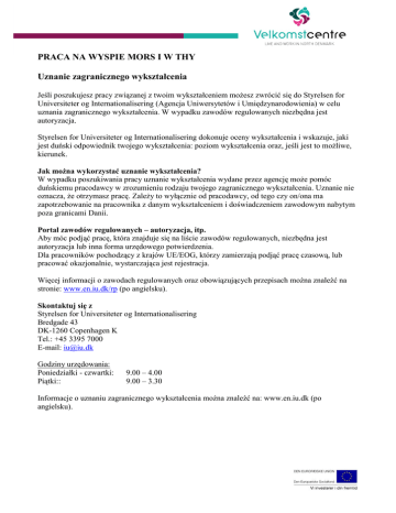 PRACA NA WYSPIE MORS I W THY Uznanie zagranicznego wykształcenia Jeśli poszukujesz pracy związanej z twoim wykształceniem możesz zwrócić się do Styrelsen for Universiteter og Internationalisering (Agencja Uniwersytetów i Umiędzynarodowienia) w celu uznania zagranicznego wykształcenia. W wypadku zawodów regulowanych niezbędna jest autoryzacja. Styrelsen for Universiteter og Internationalisering dokonuje oceny wykształcenia i wskazuje, jaki jest duński odpowiednik twojego wykształcenia: poziom wykształcenia oraz, jeśli jest to możliwe, kierunek. Jak można wykorzystać uznanie wykształcenia? W wypadku poszukiwania pracy uznanie wykształcenia wydane przez agencję może pomóc duńskiemu pracodawcy w zrozumieniu rodzaju twojego zagranicznego wykształcenia. Uznanie nie oznacza, że otrzymasz pracę. Zależy to wyłącznie od pracodawcy, od tego czy on/ona ma zapotrzebowanie na pracownika z danym wykształceniem i doświadczeniem zawodowym nabytym poza granicami Danii. Portal zawodów regulowanych – autoryzacja, itp. Aby móc podjąć pracę, która znajduje się na liście zawodów regulowanych, niezbędna jest autoryzacja lub inna forma urzędowego potwierdzenia. Dla pracowników pochodzący z krajów UE/EOG, którzy zamierzają podjąć pracę czasową, lub pracować okazjonalnie, wystarczająca jest rejestracja. Więcej informacji o zawodach regulowanych oraz obowiązujących przepisach można znaleźć na stronie: www.en.iu.dk/rp (po angielsku). Skontaktuj się z Styrelsen for Universiteter og Internationalisering Bredgade 43 DK-1260 Copenhagen K Tel.: +45 3395 7000 E-mail: [email protected] Godziny urzędowania: Poniedziałki - czwartki: Piątki:: 9.00 – 4.00 9.00 – 3.30 Informacje o uznaniu zagranicznego wykształcenia można znaleźć na: www.en.iu.dk (po angielsku).