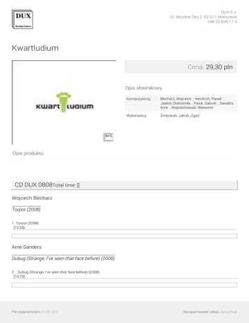 DUX S.J. Ul. Morskie Oko 2, 02-511 Warszawa +48 22 849 11 3 Kwartludium Cena: 29,30 pln Opis słownikowy Kompozytorzy Blecharz, Wojciech ∎, Hendrich, Paweł ∎, Jaskot, Dobromiła ∎, Paiuk, Gabriel ∎, Sanders, Arne ∎, Wojciechowski, Sławomir ∎ Wykonawcy Żmijowski, Jakub „Zgas” ∎ Opis produktu CD DUX 0808Total time: [] Wojciech Blecharz Torpor (2008) 1. Torpor (2008) [10:56] Arne Sanders Dubug (Strange, I’ve seen that face before) (2008) 2. . Dubug (Strange, I’ve seen that face before) (2008) [10:25] Plik wygenerowano: 07-03-2017 Oprogramowanie sklepu: AptusShop DUX S.J. Ul. Morskie Oko 2, 02-511 Warszawa +48 22 849 11 3 Sławomir Wojciechowski Rope of sands (2009) 3. Rope of sands (2009) [9:10] Dobromiła Jaskot Hum... (2008) 4. Hum... (2008) [6:44] Gabriel Paiuk Distancia (efectos de superficie) (2008) 5. Distancia (efectos de superficie) (2008) [7:10] Paweł Hendrich Cyclostratus (2008) 6. Cyclostratus (2008) [9:08] Wykonawcy: Jakub „Zgas” Żmijowski /beatboxer/ Plik wygenerowano: 07-03-2017 Powered by TCPDF (www.tcpdf.org) Oprogramowanie sklepu: AptusShop