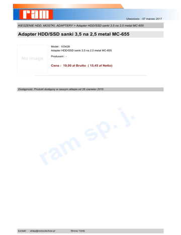 Utworzono : 07 marzec 2017 KIESZENIE HDD, MOSTKI, ADAPTERY > Adapter HDD/SSD sanki 3,5 na 2,5 metal MC-655 Adapter HDD/SSD sanki 3,5 na 2,5 metal MC-655 Model : 103426 Adapter HDD/SSD sanki 3,5 na 2,5 metal MC-655 No image Producent : - Cena : 19,00 zł Brutto ( 15,45 zł Netto) Dostępność: Produkt dostępny w naszym sklepie od 26 czerwiec 2015 . j . m a r kontakt : - [email protected] Strona 1/{nb} p s