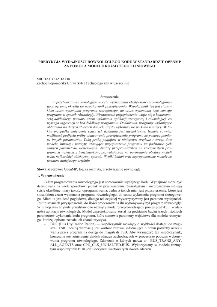 PREDYKCJA WYDAJNOCI RÓWNOLEGŁEGO KODU W STANDARDZIE OPENMP ZA POMOC MODELU ROZMYTEGO I LINIOWEGO MICHAŁ GOZDALIK Zachodniopomorski Uniwersytet Technologiczny w Szczecinie Streszczenie W przetwarzaniu równoległym w celu wyznaczenia efektywnoĞci zrównoleglonego programu, okreĞla siĊ współczynnik przyspieszenia. Współczynnik ten jest stosunkiem czasu wykonania programu szeregowego, do czasu wykonania tego samego programu w sposób równoległy. Wyznaczenie przyspieszenia wiąĪe siĊ z koniecznoĞcią dokładnego pomiaru czasu wykonania aplikacji szeregowej i równoległej, co wymaga ingerencji w kod Ĩródłowy programów. Dodatkowo, programy wykonujące obliczenia na duĪych zbiorach danych, czĊsto wykonują siĊ po kilka miesiĊcy. W takim przypadku zmierzenie czasu ich działania jest nieefektywne. Istnieje równieĪ moĪliwoĞü podjĊcia próby oszacowania przyspieszenia programu za pomocą pomiaru innych parametrów. Taką próbĊ podjąłem w niniejszym artykule tworząc dwa modele, liniowy i rozmyty, szacujące przyspieszenie programu na podstawie tych samych parametrów wejĞciowych. AnalizĊ przeprowadziłem na rzeczywistych programach wziĊtych z benchmarków, pozwalających na porównanie obydwu modeli w jak najbardziej obiektywny sposób. Wyniki badaĔ oraz zaproponowane modele są tematem niniejszego artykułu. Słowa kluczowe: OpenMP, logika rozmyta, przetwarzanie równoległe. 1. Wprowadzenie Celem programowania równoległego jest opracowanie wydajnego kodu. Wydajno moe by definiowana na wiele sposobów, jednak w przetwarzaniu równoległym i rozproszonym istniej cile okrelone miary jakoci oprogramowania. Jedn z takich miar jest przyspieszenie, które jest stosunkiem czasu wykonania programu równoległego, do czasu wykonania programu szeregowego. Miara ta jest do pogldowa, dlatego te czciej wykorzystywany jest parametr wydajnoci. Jest to stosunek przyspieszenia, do iloci procesorów na ilu wykonywany był program równoległy. W niniejszym artykule przedstawiono rozmyty model przeprowadzajcy proces predykcji wydajnoci aplikacji równoległych. Model zaprojektowany został na podstawie bada trzech istotnych parametrów wykonania kodu programu, które stanowi parametry wejciowe dla modelu rozmytego. Poniej opisana została ich charakterystyka. − BUR (Bus Utylization Ration) — współczynnik mówicy o szybkoci dostpu do magistrali FSB. Idealn wartoci jest warto zerowa, informujca o braku potrzeby oczekiwania przez program na dostp do magistrali FSB. Aby wyznaczy ten współczynnik, konieczne jest zmierzenie dwóch zdarze zachodzcych w procesorze podczas wykonywania programu równoległego. Zdarzenia o których mowa to BUS_TRANS_ANY. ALL_AGENTS oraz CPU_CLK_UNHALTED.BUS. Wykorzystany w modelu rozmytym współczynnik BUR jest iloczynem wartoci tych dwóch zdarze. 260 POLSKIE STOWARZYSZENIE ZARZĄDZANIA WIEDZĄ Seria: Studia i Materiały, nr 32, 2010 LCMI (L2 Cache Miss Impact) — współczynnik informujcy o braku danych w pamici L2. Jest to pami znajdujca si pomidzy pamici RAM a pamici L1. Idealn wartoci tego współczynnika jest warto zerowa, informujca o niezaistnieniu sytuacji, w której program odwołujcy si do pamici L2 nie znajdował w niej potrzebnych danych, przez co musiał oczekiwa na załadowanie tych danych z pamici RAM. Naley w tym miejscu nadmieni, i czas dostpu do pamici RAM jest około siedmiu razy dłuszy od czasu potrzebnego do uzyskania danych przez procesor z pamici L2. Aby wyznaczy parametr LCMI, wykorzystany w modelu rozmytym jako parametr wejciowy, naley dokona pomiaru nastpujcy zdarze procesora. MEM_LOAD_RETIRED.L2 LINE_MISS i INST_RETIRED.ANY. Warto parametru LCMI jest stosunkiem wartoci zdarzenia MEM_LOAD_RETIRED.L2 LINE_MISS, do wartoci zdarzenia INST_RETIRED.ANY − MDSR (Modified Data Sharing Ratio) — zmodyfikowany współczynnik dla danych współdzielonych. Informuje on o problemach z równoczesnym dostpem do danych przez wicej ni jeden wtek. Wartoci idealn jest warto zerowa. Oznacza ona brak czasu straconego na oczekiwanie przez wtki na dostp do zmiennych współdzielonych. Aby wyznaczy parametr MDSR, naley zmierzy wartoci zdarze EXT_SNOOP.ALL_AGENTS.HITM i INST_RETIRED.ANY. Współczynnik MDSR jest iloczynem wartoci tych dwóch zdarze. Powysze parametry, wchodzce w skład miary wydajnoci, s stosowane dla procesorów wielordzeniowych wyprodukowanych przez Intela i wykonanych w technologii 45 nanometrów. Podane współczynniki, wraz ze zdarzeniami procesora, mog zosta zmierzone za pomoc narzdzia Intel VTuner Analyzer, dla kadego programu wykonywanego na komputerze z wielordzeniowym procesorem Intela. − 2. Model rozmyty Model podzielony został na dwa mniejsze modele. Pierwszy z nich otrzymał nazw Data Model, gdy parametry wejciowe tego systemu odnosz sie do danych, na których operuje program. Parametrem wyjciowym z tego podsystemu jest parametr CP, wskazujcy wydajno obsługi danych, wykorzystywanych przez program w trakcie działania. Drugi model składowy nazwany został Common Mapping Part. Składa si on równie z dwóch parametrów wejciowych, CP oraz BUR opisanych w rozdziale pierwszym. Parametrem wyjciowym jest poszukiwany wskanik mierzcy wydajno programu, wzgldem czasu jego wykonania. Rys. 1 przedstawia cały model systemu rozmytego. Rys. 1. Model systemu mierzącego wydajnoĞü programów równoległych Michał Gozdalik Predykcja wydajnoĞci równoległego kodu w standardzie OpenMP za pomocą modelu rozmytego i liniowego 261 3. Fuzyfikacja zmiennych Dla kadego z parametrów w projektowanym systemie przydzielone zostały zmienne lingwistyczne. Wszystkie parametry s destymulantami, co oznacza e im wysza warto danego parametru, tym mniej efektywnie zostały wykorzystane zasoby sprztowe. Kady z parametrów jest znormalizowany do przedziału <0 . . . 1>. • LCMI — mały, sredni, duzy. • MDSR — wysoki, sredni, niski. • BUR — wysoki, sredni, niski. • CP — bardzo dobry, dobry, słaby. • EFI — bardzo dob