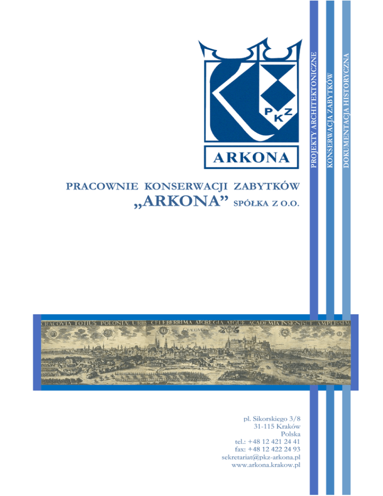 „ARKONA” SPÓŁKA Z O.O. pl. Sikorskiego 3/8 31-115 Kraków Polska tel.: +48 12 421 24 41 fax: +48 12 422 24 93 [email protected] www.arkona.krakow.pl DOKUMENTACJA HISTORYCZNA KONSERWACJA ZABYTKÓW PROJEKTY ARCHITEKTONICZNE PRACOWNIE KONSERWACJI ZABYTKÓW Firma Pracownie Konserwacji Zabytków „Arkona” Sp. z o.o. powstała w 1995 r. w wyniku przekształceń prywatyzacyjnych znanej w Polsce i w Europie firmy Przedsiębiorstwo Państwowe Pracownie Konserwacji Zabytków. Spółkę PKZ „Arkona” z siedzibą w Krakowie tworzą dwie Pracownie: Projektowa i Dokumentacji Naukowo-Historycznej. Ich działalność w zakresie rewaloryzacji obiektów zabytkowych skupia się na trzech zagadnieniach: ● kompleksowym rozpoznaniu i zbadaniu zabytkowych obiektów, ● opracowaniu programów konserwatorskich i wielobranŜowych projektów remontów, odbudowy i adaptacji zabytkowych obiektów (muzeów, hoteli, restauracji, ambasad, urzędów, banków, rezydencji itp.) oraz rewitalizacji terenów zielonych, ● wykonaniu prac konserwatorskich w zakresie konserwacji malowideł ściennych i sztalugowych. Pracownia Projektowa ponadto oferuje teŜ pełny zakres prac przy projektowaniu od podstaw nowych budynków – obiektów uŜyteczności publicznej oraz budynków mieszkalnych (domów wielofunkcyjnych i wielorodzinnych). W ramach prac badawczych wykonujemy: ● inwentaryzację obiektów, ● studia urbanistyczne i ruralistyczne, ● dokumentacje historyczne budynków i ich zespołów, ● badania archeologiczne i architektoniczne, ● badania stratygrafii tynków oraz polichromii. Programy konserwatorskie obejmują całość problematyki, zarówno w zakresie architektury obiektu, jak teŜ dekoracji jego wnętrz (elementy drewniane i metalowe, dekoracje malarskie, sztukaterie, ceramika, kamień). Dla obiektów zabytkowych wykonujemy kompleksowe projekty obejmujące, oprócz architektury i konstrukcji, takŜe wszystkie instalacje wewnętrzne, projekty zagospodarowania terenu (dróg, zieleni, oświetlenia zewnętrznego, iluminacji). PKZ „Arkona” zatrudnia na stałe wysoko wyspecjalizowaną kadrę projektantów z wieloletnim staŜem zawodowym i uprawnieniami do wykonywania prac projektowych: architektów, konstruktorów, specjalistów w zakresie instalacji sanitarnych, elektrycznych, telekomunikacji, inŜynierii środowiska, zagospodarowania terenów zielonych, a takŜe historyków sztuki oraz kosztorysantów. Ze względu na szeroki profil działalności współpracujemy teŜ z liczną grupą stałych konsultantów. Wiedza oraz duŜe doświadczenie całego zespołu pozwala na realizację skomplikowanych i specjalistycznych tematów oraz świadczenie kompleksowych usług budowlanych oraz konserwatorskich. Wykonane prace uzyskują powszechne uznanie, zarówno środowiska konserwatorskiego, jak i inwestorów. PKZ „Arkona” odznacza się duŜą dynamiką rozwoju i zapewnia wysoki poziom rozwiązań funkcjonalnych, estetycznych i technicznych oraz terminową realizację wszystkich faz procesu projektowego. Pozycja jaką firma zdobyła na rynku sprawia, Ŝe jest zapraszana do prac w całym kraju. Rekomendacją dorobku twórczego Pracowni i współpracującej z nią grupy specjalistów są liczne opracowane dokumentacje badawcze i zrealizowane inwestycje w Krakowie i innych częściach Polski, a takŜe za granicą. WYBRANE PRACE PROJEKTOWE WYKONANE PRZEZ PRACOWNIKÓW PKZ „ARKONA” W LATACH 1980–2010 1. Pałac Ahmed-beja, Konstantyna, Algieria 2. Collegium Maius, Uniwersytet Jagielloński, Kraków 3. Ulica Kanonicza, Kraków 4. Rezydencja Prezydencka, Wisła 5. Willa Decjusza, Kraków 6. Zamek śupny – Muzeum śup Krakowskich, Wieliczka 7. Pałac Konopków – Instytut Pamięci Narodowej, Wieliczka 8. Pałac Czapskich, Kraków 9. Pałac Goetzów, Brzesko 10. Dawna zajezdnia tramwajowa na Kazimierzu, Kraków 11. Spichlerz na pl. Sikorskiego, Kraków 12. Fort Kościuszko, Kraków 13. Fort Krzesławice, Kraków 14. Kamienica przy ul. Kurniki, Kraków 15. Plac Szczepański, Kraków 16. Ambasada Rzeczpospolitej Polski, Londyn, Wielka Brytania STRONA 2 1 Pałac Ahmed-beja Konstantyna, Algieria Foto 1. Dziedziniec z ogrodem Foto 2. Schody na dziedzińcu głównym Pałac ostatniego beja Algierii został zbudowany pod koniec XIX wieku. Budynek został zaadaptowany na potrzeby muzeum. W zakres prac projektowych wchodziły projekty architektoniczne, konstrukcyjne i wnętrz. Zaprojektowano takŜe sieci: wodociągową, kanalizacji, elektryczną i telefoniczną. NajwaŜniejsze prace miały za zadanie osuszenie pałacu, uporządkowanie zieleni ogrodów i ich nawodnienie. STRONA 3 1 Pałac Ahmed-beja Konstantyna, Algieria Foto 3. Fontanna w ogrodzie Foto 4. Rysunek techniczny Pałac ostatniego beja Algierii został zbudowany pod koniec XIX wieku. Budynek został zaadaptowany na potrzeby muzeum. W zakres prac projektowych wchodziły projekty architektoniczne, konstrukcyjne i wnętrz. Zaprojektowano takŜe sieci: wodociągową, kanalizacji, elektryczną i telefoniczną. NajwaŜniejsze prace miały za zadanie osuszenie pałacu, uporządkowanie zieleni ogrodów i ich nawodnienie. STRONA 4 2 Collegium Maius, Uniwersytet Jagielloński Kraków Foto 1. Widok od frontu Foto 2. Brama Ogrodu Profesorskiego Najstarszy budynek Uniwersytetu Jagiellońskiego załoŜonego w 1364 r. Budynek powstał w 1400 r. Obecnie w Collegium znajduje się Muzeum Uniwersytetu Jagiellońskiego. PKZ Arkona opracowały projekty budowlane i konserwatorskie związane z renowacją budynku i otoczenia. STRONA 7 2 Collegium Maius, Uniwersytet Jagielloński Kraków Foto 3. Dziedziniec Foto 4. Dziedziniec Najstarszy budynek Uniwersytetu Jagiellońskiego załoŜonego w 1364 r. Budynek powstał w 1400 r. Obecnie w Collegium znajduje się Muzeum Uniwersytetu Jagiellońskiego. PKZ Arkona opracowały projekty budowlane i konserwatorskie związane z renowacją budynku i otoczenia. STRONA 8 3 Ulica Kanonicza Kraków Foto 1. Widok ulicy Foto 2. Widok ulicy Jedna