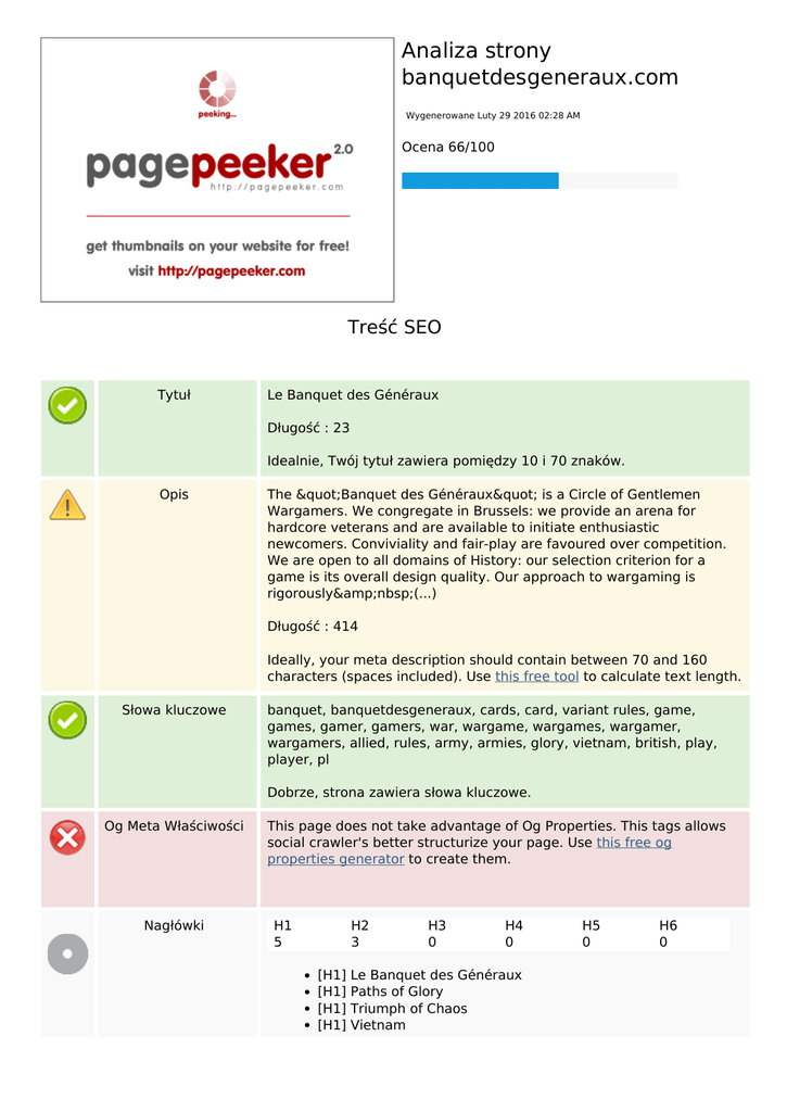 Analiza strony banquetdesgeneraux.com Wygenerowane Luty 29 2016 02:28 AM Ocena 66/100 Treść SEO Tytuł Le Banquet des Généraux Długość : 23 Idealnie, Twój tytuł zawiera pomiędzy 10 i 70 znaków. Opis The "Banquet des Généraux" is a Circle of Gentlemen Wargamers. We congregate in Brussels: we provide an arena for hardcore veterans and are available to initiate enthusiastic newcomers. Conviviality and fair-play are favoured over competition. We are open to all domains of History: our selection criterion for a game is its overall design quality. Our approach to wargaming is rigorously (...) Długość : 414 Ideally, your meta description should contain between 70 and 160 characters (spaces included). Use this free tool to calculate text length. Słowa kluczowe banquet, banquetdesgeneraux, cards, card, variant rules, game, games, gamer, gamers, war, wargame, wargames, wargamer, wargamers, allied, rules, army, armies, glory, vietnam, british, play, player, pl Dobrze, strona zawiera słowa kluczowe. Og Meta Właściwości Nagłówki This page does not take advantage of Og Properties. This tags allows social crawler's better structurize your page. Use this free og properties generator to create them. H1 5 H2 3 [H1] [H1] [H1] [H1] H3 0 H4 0 Le Banquet des Généraux Paths of Glory Triumph of Chaos Vietnam H5 0 H6 0 Treść SEO [H1] [H2] [H2] [H2] Obrazy Twilight Struggle [Belgium] Our Forum Contact us We found 3 images on this web page. Good, most or all of your images have alt attributes Współczynnik Text/HTML Ratio : 40% Ideal! This page's ratio of text to HTML code is between 25 and 70 percent. Flash Ramka Perfect, no Flash content has been detected on this page. Great, there are no Iframes detected on this page. SEO Linki URL Rewrite Good. Your links looks friendly! Podkreślenia w adresach URL Perfect! No underscores detected in your URLs. Linki na stronie We found a total of 7 links including 0 link(s) to files Statistics External Links : noFollow 0% External Links : Passing Juice 0% Internal Links 100% Linki na stronie Anchor Type Juice Paths of Glory Internal Passing Juice Triumph of Chaos Internal Passing Juice Vietnam Internal Passing Juice Linki na stronie Twilight Struggle Internal Passing Juice [Belgium] Internal Passing Juice Our Forum Internal Passing Juice Contact us Internal Passing Juice SEO słowa kluczowe Chmura - słowa kluczowe analysis them reality, des own historical banquet généraux reflect some Słowa kluczowe spójność Keyword Content them 3 des 3 banquet 2 some 2 historical 2 Tytuł Słowa kluczowe Opis Nagłówki Użyteczność - Usability Url Domain : banquetdesgeneraux.com Długość : 22 Favicon Great, your website has a favicon. Printability We could not find a Print-Friendly CSS. Język You have not specified the language. Use this free meta tags generator to declare the intended language of your website. Dublin Core This page does not take advantage of Dublin Core. Użyteczność - Usability Document Doctype HTML 4.01 Transitional Kodowanie Perfect. Your declared charset is UTF-8. W3C Validity Błędy : 1 Ostrzeżenia : 4 Email Privacy Great no email address has been found in plain text! Nieaktualne HTML Great! We haven't found deprecated HTML tags in your HTML. Porady prędkości Excellent, your website doesn't use nested tables. Perfect. No inline css has been found in HTML tags! Great, your website has few CSS files. Perfect, your website has few JavaScript files. Mobile Mobile Optimization Apple Icon Meta Viewport Tag Flash content Powered by TCPDF (www.tcpdf.org)