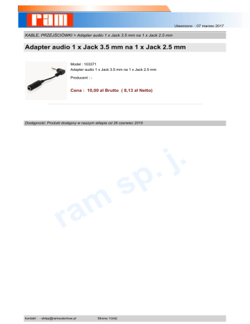 Utworzono : 07 marzec 2017 KABLE, PRZEJŚCIÓWKI > Adapter audio 1 x Jack 3.5 mm na 1 x Jack 2.5 mm Adapter audio 1 x Jack 3.5 mm na 1 x Jack 2.5 mm Model : 103371 Adapter audio 1 x Jack 3.5 mm na 1 x Jack 2.5 mm Producent : - Cena : 10,00 zł Brutto ( 8,13 zł Netto) Dostępność: Produkt dostępny w naszym sklepie od 26 czerwiec 2015 . j . m a r kontakt : - [email protected] Strona 1/{nb} p s