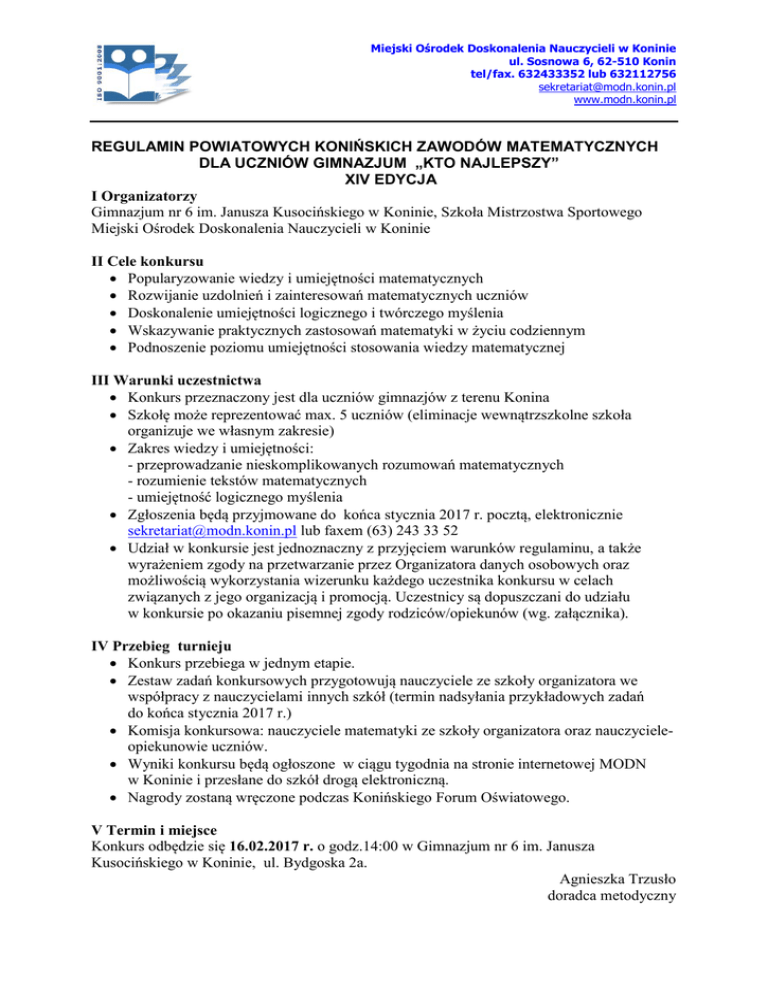 Miejski Ośrodek Doskonalenia Nauczycieli w Koninie ul. Sosnowa 6, 62-510 Konin tel/fax. 632433352 lub 632112756 [email protected] www.modn.konin.pl REGULAMIN POWIATOWYCH KONIŃSKICH ZAWODÓW MATEMATYCZNYCH DLA UCZNIÓW GIMNAZJUM „KTO NAJLEPSZY” XIV EDYCJA I Organizatorzy Gimnazjum nr 6 im. Janusza Kusocińskiego w Koninie, Szkoła Mistrzostwa Sportowego Miejski Ośrodek Doskonalenia Nauczycieli w Koninie II Cele konkursu Popularyzowanie wiedzy i umiejętności matematycznych Rozwijanie uzdolnień i zainteresowań matematycznych uczniów Doskonalenie umiejętności logicznego i twórczego myślenia Wskazywanie praktycznych zastosowań matematyki w życiu codziennym Podnoszenie poziomu umiejętności stosowania wiedzy matematycznej III Warunki uczestnictwa Konkurs przeznaczony jest dla uczniów gimnazjów z terenu Konina Szkołę może reprezentować max. 5 uczniów (eliminacje wewnątrzszkolne szkoła organizuje we własnym zakresie) Zakres wiedzy i umiejętności: - przeprowadzanie nieskomplikowanych rozumowań matematycznych - rozumienie tekstów matematycznych - umiejętność logicznego myślenia Zgłoszenia będą przyjmowane do końca stycznia 2017 r. pocztą, elektronicznie [email protected] lub faxem (63) 243 33 52 Udział w konkursie jest jednoznaczny z przyjęciem warunków regulaminu, a także wyrażeniem zgody na przetwarzanie przez Organizatora danych osobowych oraz możliwością wykorzystania wizerunku każdego uczestnika konkursu w celach związanych z jego organizacją i promocją. Uczestnicy są dopuszczani do udziału w konkursie po okazaniu pisemnej zgody rodziców/opiekunów (wg. załącznika). IV Przebieg turnieju Konkurs przebiega w jednym etapie. Zestaw zadań konkursowych przygotowują nauczyciele ze szkoły organizatora we współpracy z nauczycielami innych szkół (termin nadsyłania przykładowych zadań do końca stycznia 2017 r.) Komisja konkursowa: nauczyciele matematyki ze szkoły organizatora oraz nauczycieleopiekunowie uczniów. Wyniki konkursu będą ogłoszone w ciągu tygodnia na stronie internetowej MODN w Koninie i przesłane do szkół drogą elektroniczną. Nagrody zostaną wręczone podczas Konińskiego Forum Oświatowego. V Termin i miejsce Konkurs odbędzie się 16.02.2017 r. o godz.14:00 w Gimnazjum nr 6 im. Janusza Kusocińskiego w Koninie, ul. Bydgoska 2a. Agnieszka Trzusło doradca metodyczny Miejski Ośrodek Doskonalenia Nauczycieli w Koninie ul. Sosnowa 6, 62-510 Konin tel/fax. 632433352 lub 632112756 [email protected] www.modn.konin.pl ZGŁOSZENIE udziału w POWIATOWYCH KONIŃSKICH ZAWODACH MATEMATYCZNYCH DLA UCZNIÓW GIMNAZJUM „KTO NAJLEPSZY” Nazwa i adres szkoły, telefon ....................................................................................................................................................... ....................................................................................................................................................... ....................................................................................................................................................... Liczba zgłoszonych uczniów: ………………………… Imiona i nazwiska uczniów: .................................................................................... .................................................................................... .................................................................................... .................................................................................... ……………………………………………………… ……………………………………………………… Imiona i nazwiska opiekunów/adres e-mail: ....................................................................................................................................................... ....................................................................................................................................................... ....................................................................................................................................................... ....................................................................................................................................................... data zgłoszenia: ................................. podpis dyrektora: …………………………………….