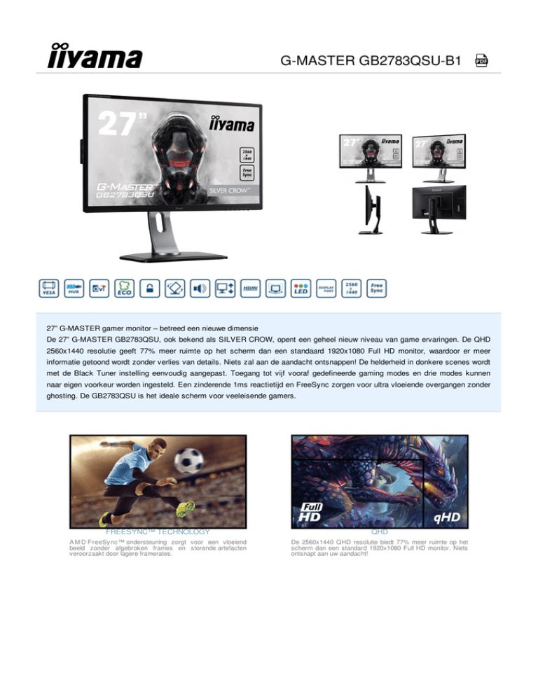 G-MASTER GB2783QSU-B1 27” G-MASTER gamer monitor – betreed een nieuwe dimensie De 27” G-MASTER GB2783QSU, ook bekend als SILVER CROW, opent een geheel nieuw niveau van game ervaringen. De QHD 2560x1440 resolutie geeft 77% meer ruimte op het scherm dan een standaard 1920x1080 Full HD monitor, waardoor er meer informatie getoond wordt zonder verlies van details. Niets zal aan de aandacht ontsnappen! De helderheid in donkere scenes wordt met de Black Tuner instelling eenvoudig aangepast. Toegang tot vijf vooraf gedefineerde gaming modes en drie modes kunnen naar eigen voorkeur worden ingesteld. Een zinderende 1ms reactietijd en FreeSync zorgen voor ultra vloeiende overgangen zonder ghosting. De GB2783QSU is het ideale scherm voor veeleisende gamers. FREESYNC™ TECHNOLOGY QHD A M D FreeSync™ ondersteuning zorgt voor een vloeiend beeld zonder afgebroken frames en storende artefacten veroorzaakt door lagere framerates. De 2560x1440 QHD resolutie biedt 77% meer ruimte op het scherm dan een standard 1920x1080 Full HD monitor. Niets ontsnapt aan uw aandacht! 1 MS VOORGEDEFINIEERDE GAMING MODES Een snelle reactietijd is de sleutel tot ultra vloeiende game. Het vermindert ghosting en blurring, waardoor je gemakkelijk jouw prestaties kunt verbeteren. Doe het op jouw manier! Kies één van de vooraf gedefineerde gaming modes (inclusief FPS en strategie) of stel je eigen voorkeursinstellingen in. BLACK TUNER De gebruikers kunnen met de Black Tuner de helderheid en de donkere schaduwplekken gemakkelijk aanpassen (lichter of donkerder maken), wat betere weergave prestaties biedt en kan helpen om de vijand eerder te spotten. 1. PANEL BEELDDIAGONAAL 27"; 68.5cm BEELDVERHOUDING 16 : 9 PANEEL TN LED, matte finish RESOLUTIE 2560 x 1440 ( 3.7 megapixel) HELDERHEID 350 cd/m² typisch CONTRAST 1000 : 1 typisch CONTRAST 12 000 000 : 1 ACR REACTIETIJD 1 ms INKIJKHOEK horizontaal/verticaal: 170°/ 160°; rechts/links: 85°/ 85°; omhoog/omlaag: 80/ 80° AANTAL KLEUREN 16.7 miljoen BLUE LIGHT REDUCER ja FLICKER FREE LED ja ZICHTBAAR FORMAAT (H X B) 335.7 x 596.7 mm; 13.2" x 23.5" DOT PITCH (VERT. X HOR.) 0.233 x 0.233 mm HORIZONTALE FREQUENTIE 30 - 90 KHz VERTICALE FREQUENTIE 55 - 75 Hz SYNCHRONISATIE Separate sync 2. SIGNAALINGANGEN DIGITALE SIGNAALINGANGEN DVI-D, HDMI, DisplayPort HDCP ja UITGANGSAANSLUITINGEN hoofdtelefoon aansluiting USB HUB UP 1 x USB 3.0 / DOWN 2 x USB 3.0 3. KENMERKEN APPLE COMPATIBEL Alle iiyama monitoren zijn compatibel met Apple-Macintosh computers. PLUG & PLAY VESA DDC2B™ INSTELLINGEN Via OSD in 11 talen (EN, DE, FR, ES, IT, PL, CZ, NL, Chinees, RU, JP) en 6 bedieningsknoppen (Power, Menu/ Selectie, Omhoog/ Volume, Omlaag/ ECO, Sluit, Ingang) beeldinstellingen (contrast, helderheid, OD, verh. contrast, ECO modus, Blue Light Reducer, Black Tuner, kleurverzadiging, gamma) ingangsselectie, audio aanpassen (volume, geluid uit, digitale audio) GEBRUIKERSINSTELLINGEN instellingen opslaan, kleurinstellingen (koel, standaard, warm, gebruikersinstelling) afbeelding aanpassen (i-Style color, scherpte, HDMI RGB bereik, directe aansturing, aanpassen video modus) taal, menu set-up (OSD positie, time-out OSD, openingslogo, FreeSync) display info, resetten LUIDSPREKERS 2 x 2 W (Stereo) DIEFSTALBEVEILIGING Kensington-lock™ voorbereid CERTIFICATEN CE, TÜV-GS, CU EXTRA FUNCTIES Ondersteund FreeSync™ technologie, DisplayPort: 2560x1440 @70Hz IN HOOGTE VERSTELBARE VOET Ja HOOGTE-INSTELLING 130 mm ROTATIE (PORTRET / LANDSCHAP POSITIE) 90° DRAAIBARE VOET (LINKS, RECHTS) 90°; 45° links; 45° rechts KANTEL HOEK 22° omhoog; 5° omlaag VESA MONTAGE 100 x 100 mm KLEUR zwart 4. ACCESSOIRES INBEGREPEN ACCESSOIRES stroomkabel, DVI-D signaalkabel, DisplayPort-kabel, USB-kabel, audiokabel, monitorvoet, snel-starthandleiding, veiliheidsinstructies 5. POWER MANAGEMENT STROOMVOORZIENING AC 100 - 240 V, 50 / 60 Hz VOEDING intern ENERGIEVERBRUIK 44 Watt typisch; max. 0.5 Watt bij Power management modus ENERGIEBEHEER VESA DPMS 6. EU ENERGIELABEL ENERGIE EFFICIËNTIE KLASSE B ENERGIEVERBRUIK AAN MODUS 42.6W JAARLIJKS ENERGIEVERBRUIK 62 kWh/jaar* ZICHTBAAR SCHERM DIAGONAAL 69 cm; 27"; ( 27'' segment ) Informatie op basis van Regelement (EU) Nr. 1062/2010. *Gebaseerd op stroomverbruik van een televisie die 4 uur per dag gedurende 365 dagen opereert. Het werkerlijke energieverbruik hangt af van hoe de televisie wordt gebruikt. 7. AFMETINGEN GROOTTE (B X H X D) 622.5 x 400.5 (530.5) x 230 mm GEWICHT 6.1 kg Alle handelsmerken zijn geregisteerd. Gegevens onder voorbehoud van zetfouten. Specificaties kunnen vooraf en zonder opgaaf van reden gewijzigd worden. Alle LCD-panels vallen onder ISO-9241-307:2008 inzake pixelfouten. © IIYAMA CORPORATION ( ). ALL RIGHTS RESERVED.