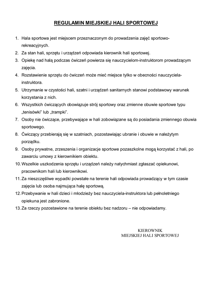 REGULAMIN MIEJSKIEJ HALI SPORTOWEJ 1. Hala sportowa jest miejscem przeznaczonym do prowadzenia zajęć sportoworekreacyjnych. 2. Za stan hali, sprzętu i urządzeń odpowiada kierownik hali sportowej. 3. Opiekę nad halą podczas ćwiczeń powierza się nauczycielom-instruktorom prowadzącym zajęcia. 4. Rozstawienie sprzętu do ćwiczeń moŜe mieć miejsce tylko w obecności nauczycielainstruktora. 5. Utrzymanie w czystości hali, szatni i urządzeń sanitarnych stanowi podstawowy warunek korzystania z nich. 6. Wszystkich ćwiczących obowiązuje strój sportowy oraz zmienne obuwie sportowe typu „tenisówki” lub „trampki”. 7. Osoby nie ćwiczące, przebywające w hali zobowiązane są do posiadania zmiennego obuwia sportowego. 8. Ćwiczący przebierają się w szatniach, pozostawiając ubranie i obuwie w naleŜytym porządku. 9. Osoby prywatne, zrzeszenia i organizacje sportowe pozaszkolne mogą korzystać z hali, po zawarciu umowy z kierownikiem obiektu. 10. Wszelkie uszkodzenia sprzętu i urządzeń naleŜy natychmiast zgłaszać opiekunowi, pracownikom hali lub kierownikowi. 11. Za nieszczęśliwe wypadki powstałe na terenie hali odpowiada prowadzący w tym czasie zajęcia lub osoba najmująca halę sportową. 12. Przebywanie w hali dzieci i młodzieŜy bez nauczyciela-instruktora lub pełnoletniego opiekuna jest zabronione. 13. Za rzeczy pozostawione na terenie obiektu bez nadzoru – nie odpowiadamy. KIEROWNIK MIEJSKIEJ HALI SPORTOWEJ