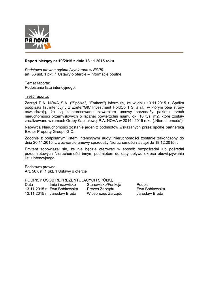 Zarząd P.A. NOVA S.A. ("Spółka", "Emitent") informuje, że w dniu 13.11.2015 r. Spółka