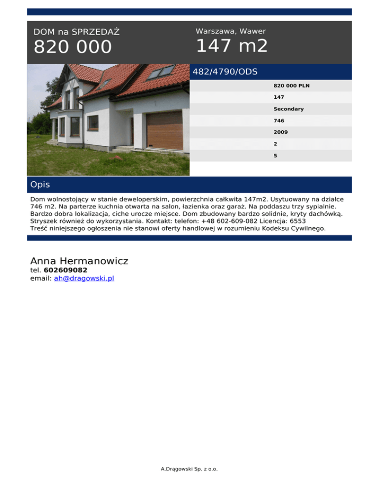 DOM na SPRZEDAŻ 820 000 Warszawa, Wawer 147 m2 482/4790/ODS 820 000 PLN 147 Secondary 746 2009 2 5 Opis Dom wolnostojący w stanie deweloperskim, powierzchnia całkwita 147m2. Usytuowany na działce 746 m2. Na parterze kuchnia otwarta na salon, łazienka oraz garaż. Na poddaszu trzy sypialnie. Bardzo dobra lokalizacja, ciche urocze miejsce. Dom zbudowany bardzo solidnie, kryty dachówką. Stryszek również do wykorzystania. Kontakt: telefon: +48 602-609-082 Licencja: 6553 Treść niniejszego ogłoszenia nie stanowi oferty handlowej w rozumieniu Kodeksu Cywilnego. Anna Hermanowicz tel. 602609082 email: [email protected] A.Drągowski Sp. z o.o. Powered by TCPDF (www.tcpdf.org)