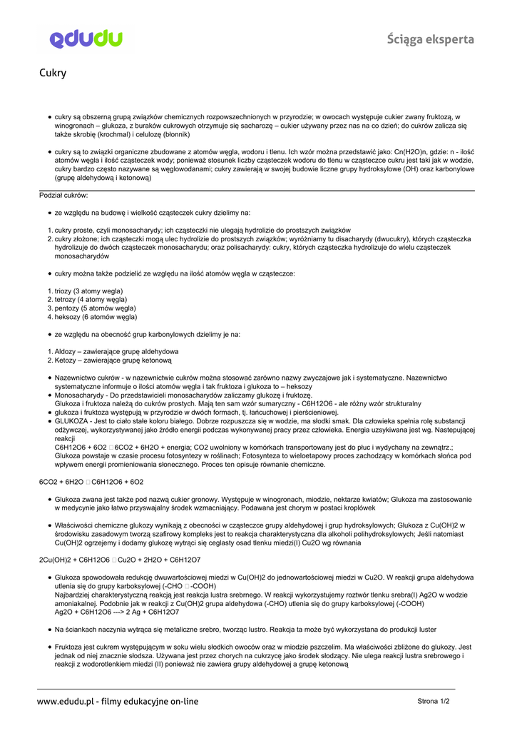 Ściąga eksperta Cukry cukry są obszerną grupą związków chemicznych rozpowszechnionych w przyrodzie; w owocach występuje cukier zwany fruktozą, w winogronach – glukoza, z buraków cukrowych otrzymuje się sacharozę – cukier używany przez nas na co dzień; do cukrów zalicza się także skrobię (krochmal) i celulozę (błonnik) cukry są to związki organiczne zbudowane z atomów węgla, wodoru i tlenu. Ich wzór można przedstawić jako: Cn(H2O)n, gdzie: n - ilość atomów węgla i ilość cząsteczek wody; ponieważ stosunek liczby cząsteczek wodoru do tlenu w cząsteczce cukru jest taki jak w wodzie, cukry bardzo często nazywane są węglowodanami; cukry zawierają w swojej budowie liczne grupy hydroksylowe (OH) oraz karbonylowe (grupę aldehydową i ketonową) Podział cukrów: ze względu na budowę i wielkość cząsteczek cukry dzielimy na: 1. cukry proste, czyli monosacharydy; ich cząsteczki nie ulegają hydrolizie do prostszych związków 2. cukry złożone; ich cząsteczki mogą ulec hydrolizie do prostszych związków; wyróżniamy tu disacharydy (dwucukry), których cząsteczka hydrolizuje do dwóch cząsteczek monosacharydu; oraz polisacharydy: cukry, których cząsteczka hydrolizuje do wielu cząsteczek monosacharydów cukry można także podzielić ze względu na ilość atomów węgla w cząsteczce: 1. triozy (3 atomy wegla) 2. tetrozy (4 atomy węgla) 3. pentozy (5 atomów węgla) 4. heksozy (6 atomów węgla) ze względu na obecność grup karbonylowych dzielimy je na: 1. Aldozy – zawierające grupę aldehydowa 2. Ketozy – zawierające grupę ketonową Nazewnictwo cukrów - w nazewnictwie cukrów można stosować zarówno nazwy zwyczajowe jak i systematyczne. Nazewnictwo systematyczne informuje o ilości atomów węgla i tak fruktoza i glukoza to – heksozy Monosacharydy - Do przedstawicieli monosacharydów zaliczamy glukozę i fruktozę. Glukoza i fruktoza należą do cukrów prostych. Mają ten sam wzór sumaryczny - C6H12O6 - ale różny wzór strukturalny glukoza i fruktoza występują w przyrodzie w dwóch formach, tj. łańcuchowej i pierścieniowej. GLUKOZA - Jest to ciało stałe koloru białego. Dobrze rozpuszcza się w wodzie, ma słodki smak. Dla człowieka spełnia rolę substancji odżywczej, wykorzystywanej jako źródło energii podczas wykonywanej pracy przez człowieka. Energia uzsykiwana jest wg. Nastepującej reakcji C6H12O6 + 6O2 6CO2 + 6H2O + energia; CO2 uwolniony w komórkach transportowany jest do płuc i wydychany na zewnątrz.; Glukoza powstaje w czasie procesu fotosyntezy w roślinach; Fotosynteza to wieloetapowy proces zachodzący w komórkach słońca pod wpływem energii promieniowania słonecznego. Proces ten opisuje równanie chemiczne. 6CO2 + 6H2O C6H12O6 + 6O2 Glukoza zwana jest także pod nazwą cukier gronowy. Występuje w winogronach, miodzie, nektarze kwiatów; Glukoza ma zastosowanie w medycynie jako łatwo przyswajalny środek wzmacniający. Podawana jest chorym w postaci kroplówek Właściwości chemiczne glukozy wynikają z obecności w cząsteczce grupy aldehydowej i grup hydroksylowych; Glukoza z Cu(OH)2 w środowisku zasadowym tworzą szafirowy kompleks jest to reakcja charakterystyczna dla alkoholi polihydroksylowych; Jeśli natomiast Cu(OH)2 ogrzejemy i dodamy glukozę wytrąci się ceglasty osad tlenku miedzi(I) Cu2O wg równania 2Cu(OH)2 + C6H12O6 Cu2O + 2H2O + C6H12O7 Glukoza spowodowała redukcję dwuwartościowej miedzi w Cu(OH)2 do jednowartościowej miedzi w Cu2O. W reakcji grupa aldehydowa utlenia się do grupy karboksylowej (-CHO -COOH) Najbardziej charakterystyczną reakcją jest reakcja lustra srebrnego. W reakcji wykorzystujemy roztwór tlenku srebra(I) Ag2O w wodzie amoniakalnej. Podobnie jak w reakcji z Cu(OH)2 grupa aldehydowa (-CHO) utlenia się do grupy karboksylowej (-COOH) Ag2O + C6H12O6 ---> 2 Ag + C6H12O7 Na ściankach naczynia wytrąca się metaliczne srebro, tworząc lustro. Reakcja ta może być wykorzystana do produkcji luster Fruktoza jest cukrem występującym w soku wielu słodkich owoców oraz w miodzie pszczelim. Ma właściwości zbliżone do glukozy. Jest jednak od niej znacznie słodsza. Używana jest przez chorych na cukrzycę jako środek słodzący. Nie ulega reakcji lustra srebrowego i reakcji z wodorotlenkiem miedzi (II) ponieważ nie zawiera grupy aldehydowej a grupę ketonową www.edudu.pl - filmy edukacyjne on-line Strona 1/2 Ściąga eksperta Sacharoza - Największe znaczenie gospodarcze z disacharydów ma sacharoza. Sacharoza czyli zwykły cukier występuje w korzeniu buraka cukrowego i łodygach trzciny cukrowej. Jest białą krystaliczną substancją dobrze rozpuszczalną w wodzie. Posiada słodki smak, pod wpływem ogrzewania topi się i zmienia barwę na brunatną. Powstaje tzw. karmel. Gdy do karmelu dodamy wody następuje jego rozpuszczenie – jest to wykorzystywane do produkcji niektórych gatunków cukierków, a sam karmel do produkcji coca-coli. Sacharoza zbudowana jest z dwóch cząsteczek cukrów prostych tj. glukozy i fruktozy. Cząsteczki glukozy i fruktozy połączone są wiązaniem glikozydowym. Wzór sumaryczny C12H22O11. Cząsteczka sacharozy w obecności kwasu lub enzymu hydrolizuje w wyniku czego powstają równe ilości glukozy i fruktozy. Jest proces, który zachodzi w żołądku w czasie trawienia. C12H22O11 + H2O C6H12O6(glukoza) + C6H12O6(fruktoza) Sacharoza nie posiada właściwości redukujących jak glukoza. polisacharydy - wielocukry są związkami, których każda cząsteczka jest zbudowana z wielu setek lub nawet tysięcy jednostek cukrów prostych. Pod względem chemicznym są polimerami jednak otrzymanymi przez naturę a nie człowieka. Najważniejszymi polisacharydami są celuloza, skrobia i glikogen Skrobia - Wzór chemiczny skrobi ma postać (C6H10O5)n gdzie: n może przyjmować wartości - od kilkuset do kilkudziesięciu tysięcy. Skrobia występuje w roślinach. Znajduje się w nasionach, owocach, korzeniach i bulwach. S