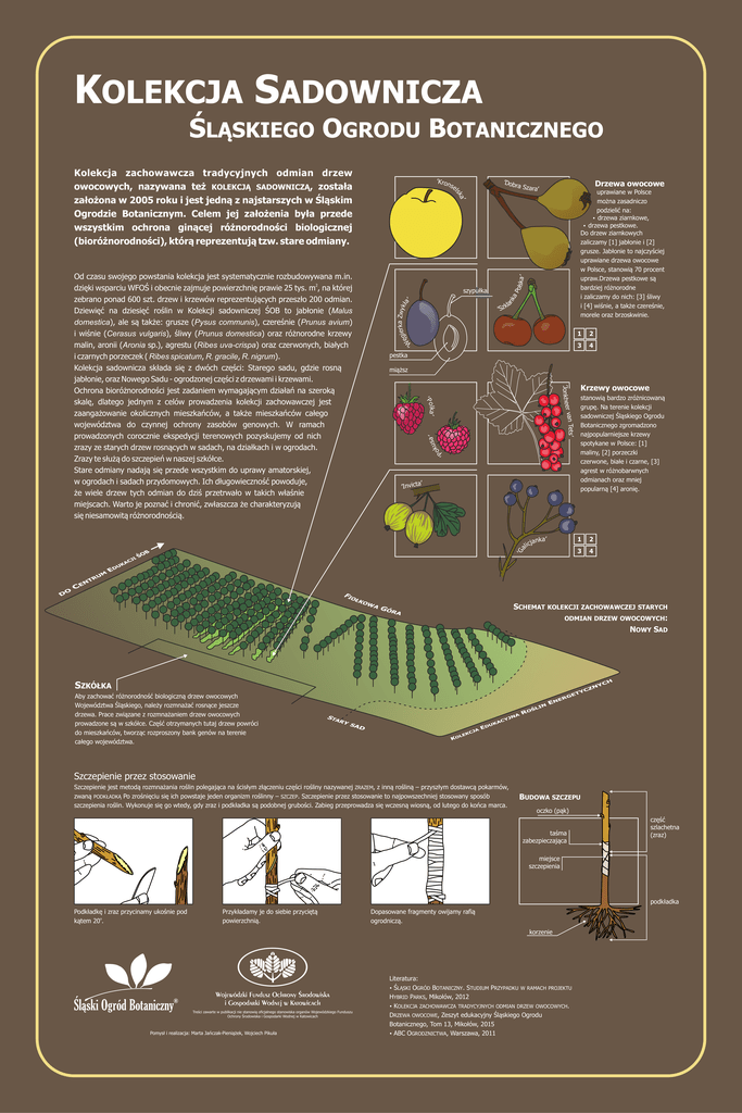 KOLEKCJA SADOWNICZA ŚLĄSKIEGO OGRODU BOTANICZNEGO Kolekcja zachowawcza tradycyjnych odmian drzew owocowych, nazywana też KOLEKCJĄ SADOWNICZĄ, została założona w 2005 roku i jest jedną z najstarszych w Śląskim Ogrodzie Botanicznym. Celem jej założenia była przede wszystkim ochrona ginącej różnorodności biologicznej (bioróżnorodności), którą reprezentują tzw. stare odmiany. ’Dob uprawiane w Polsce można zasadniczo podzielić na: ź drzewa ziarnkowe, ź drzewa pestkowe. Do drzew ziarnkowych zaliczamy [1] jabłonie i [2] grusze. Jabłonie to najczyściej uprawiane drzewa owocowe w Polsce, stanowią 70 procent upraw.Drzewa pestkowe są bardziej różnorodne i zaliczamy do nich: [3] śliwy i [4] wiśnie, a także czereśnie, morele oraz brzoskwinie. aP olska ’ a’ lsk szypułka nk ’ Drzewa owocowe ra Sza ra’ ka Zwyk r e i ła ęg W la k z ’S 1 2 3 4 ’ pestka miąższ ’Jonkheer ’ sa’ u ok van Tets’ ka Pol ’ ’P ’ a t c i v n I ’ ’Ga Od czasu swojego powstania kolekcja jest systematycznie rozbudowywana m.in. 2 dzięki wsparciu WFOŚ i obecnie zajmuje powierzchnię prawie 25 tys. m , na której zebrano ponad 600 szt. drzew i krzewów reprezentujących przeszło 200 odmian. Dziewięć na dziesięć roślin w Kolekcji sadowniczej ŚOB to jabłonie (Malus domestica), ale są także: grusze (Pysus communis), czereśnie (Prunus avium) i wiśnie (Cerasus vulgaris), śliwy (Prunus domestica) oraz różnorodne krzewy malin, aronii (Aronia sp.), agrestu (Ribes uva-crispa) oraz czerwonych, białych i czarnych porzeczek ( Ribes spicatum, R. gracile, R. nigrum). Kolekcja sadownicza składa się z dwóch części: Starego sadu, gdzie rosną jabłonie, oraz Nowego Sadu - ogrodzonej części z drzewami i krzewami. Ochrona bioróżnorodności jest zadaniem wymagającym działań na szeroką skalę, dlatego jednym z celów prowadzenia kolekcji zachowawczej jest zaangażowanie okolicznych mieszkańców, a także mieszkańców całego województwa do czynnej ochrony zasobów genowych. W ramach prowadzonych corocznie ekspedycji terenowych pozyskujemy od nich zrazy ze starych drzew rosnących w sadach, na działkach i w ogrodach. Zrazy te służą do szczepień w naszej szkółce. Stare odmiany nadają się przede wszystkim do uprawy amatorskiej, w ogrodach i sadach przydomowych. Ich długowieczność powoduje, że wiele drzew tych odmian do dziś przetrwało w takich właśnie miejscach. Warto je poznać i chronić, zwłaszcza że charakteryzują się niesamowitą różnorodnością. ’Kron se a’ k n a licj Krzewy owocowe stanowią bardzo zróżnicowaną grupę. Na terenie kolekcji sadowniczej Śląskiego Ogrodu Botanicznego zgromadzono najpopularniejsze krzewy spotykane w Polsce: [1] maliny, [2] porzeczki czerwone, białe i czarne, [3] agrest w różnobarwnych odmianach oraz mniej popularną [4] aronię. 1 2 3 4 SCHEMAT KOLEKCJI ZACHOWAWCZEJ STARYCH ODMIAN DRZEW OWOCOWYCH: NOWY SAD SZKÓŁKA Aby zachować różnorodność biologiczną drzew owocowych Województwa Śląskiego, należy rozmnażać rosnące jeszcze drzewa. Prace związane z rozmnażaniem drzew owocowych prowadzone są w szkółce. Część otrzymanych tutaj drzew powróci do mieszkańców, tworząc rozproszony bank genów na terenie całego województwa. Szczepienie przez stosowanie Szczepienie jest metodą rozmnażania roślin polegająca na ścisłym złączeniu części rośliny nazywanej ZRAZEM, z inną rośliną – przyszłym dostawcą pokarmów, zwaną PODKŁADKĄ Po zrośnięciu się ich powstaje jeden organizm roślinny – SZCZEP. Szczepienie przez stosowanie to najpowszechniej stosowany sposób szczepienia roślin. Wykonuje się go wtedy, gdy zraz i podkładka są podobnej grubości. Zabieg przeprowadza się wczesną wiosną, od lutego do końca marca. BUDOWA SZCZEPU oczko (pąk) taśma zabezpieczająca część szlachetna (zraz) miejsce szczepienia podkładka Podkładkę i zraz przycinamy ukośnie pod kątem 20o. Przykładamy je do siebie przyciętą powierzchnią. Dopasowane fragmenty owijamy rafią ogrodniczą. korzenie Treści zawarte w publikacji nie stanowią oficjalnego stanowiska organów Wojewódzkiego Funduszu Ochrony Środowiska i Gospodarki Wodnej w Katowicach Pomysł i realizacja: Marta Jańczak-Pieniążek, Wojciech Pikuła Literatura: źŚLĄSKI OGRÓD BOTANICZNY. STUDIUM PRZYPADKU W RAMACH PROJEKTU HYBRID PARKS, Mikołów, 2012 źKOLEKCJA ZACHOWAWCZA TRADYCYJNYCH ODMIAN DRZEW OWOCOWYCH. DRZEWA OWOCOWE, Zeszyt edukacyjny Śląskiego Ogrodu Botanicznego, Tom 13, Mikołów, 2015 źABC OGRODZNICTWA, Warszawa, 2011