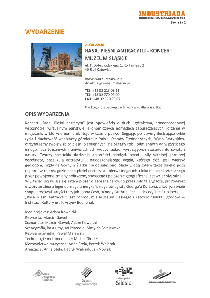 Strona 1 / 2 WYDARZENIE 21:30-22:30 RASA. PIEŚNI ANTRACYTU - KONCERT MUZEUM ŚLĄSKIE ul. T. Dobrowolskiego 1, Korfantego 3 40-514 Katowice www.muzeumslaskie.pl [email protected] TEL: +48 32 213 08 11 TEL: +48 32 779 93 00 FAX: +48 32 779 93 67 Dla kogo: dla szukających rozrywki, dla wszystkich OPIS WYDARZENIA Koncert „Rasa. Pieśni antracytu” jest opowieścią o duchu górnictwa, ponadnarodowej wspólnocie, wirtualnym państwie, ekonomicznych nomadach zapuszczających korzenie w miejscach, w których ziemia obfituje w czarne paliwo. Sięgając po utwory ilustrujące cykle życia i duchowość wspólnoty górniczej z Polski, Stanów Zjednoczonych, Wysp Brytyjskich, otrzymujemy swoisty zbiór pieśni plemiennych "na okrągły rok", odmiennych od wszystkiego innego, lecz tożsamych i uniwersalnych wobec siebie, wyrażających stosunek do świata i natury. Twórcy spektaklu docierają do źródeł pamięci, zasad i siły witalnej górniczej wspólnoty, poszukują antracytu – najdoskonalszego węgla, którego złóż, jeśli wierzyć geologom, nigdy na Górnym Śląsku nie odnaleziono. Ślady wiodą zatem także daleko poza region - w rejony, gdzie echo pieśni antracytu - pierwotnego mitu lokalnie zniekształconego przez powojenne zmiany polityczne, społeczne i położenie geograficzne jest wciąż słyszalne. W „Rasie” pojawiają się zatem piosenki zebrane zarówno przez Adolfa Dygacza, jak również utwory ze zbioru legendarnego amerykańskiego etnografa George'a Korsona, z których wiele spopularyzowali artyści tacy jak Johny Cash, Woody Guthrie, Pchil Ochs czy The Dubliners. „Rasa. Pieśni antracytu” jest koprodukcją Muzeum Śląskiego i Katowic Miasta Ogrodów — Instytucji Kultury im. Krystyny Bochenek Idea projektu: Adam Kowalski Reżyseria: Marcin Gaweł Scenariusz: Marcin Gaweł, Adam Kowalski Scenografia, kostiumy, multimedia: Matylda Sałajewska Reżyseria światła: Paweł Majewski Technologie multimedialne: Michał Głodek Kierownictwo muzyczne: Anna Stela, Patryk Walczak Aranżacje: Anna Stela, Patryk Walczak, Jan Nowak Strona 2 / 2 Tłumaczenia tekstów: Zbigniew Kadłubek Ruch sceniczny: Paulina Jóźwicka Producent: Marlena Hermanowicz Produkcja: Muzeum Śląskie, Katowice Miasto Ogrodów — Instytucja Kultury im. Krystyny Bochenek Występują m.in.: Barbara Lubos, Dariusz Niebudek, Anna Stela, Patryk Walczak, Jan Nowak, Jacek Mielcarek, Jakub Krawczyk, Orkiestra Dęta „Katowice”, Schola Cantorum Minorum Chosoviensis, Gospel Sound - Katowicki Chór Gospel, Kwartet Muzyków Ślaskiej Orkiestry Kameralnej „Społeczeństwo górnicze tworzy (…) jakieś osobliwe bractwo, w którym obowiązują inne zwyczaje, surowsza etyka zbiorowa, solidarność w pracy i niebezpieczeństwie, spotykana chyba tylko w rowach strzeleckich, odrębna skala uczuciowa i to podświadome może przekonanie, że w kopalni podczas pracy, a przede wszystkim podczas grożącego niebezpieczeństwa nie ma już wśród nich ludzi różniących się między sobą pochodzeniem, przekonaniami politycznymi czy religijnymi, wykształceniem lub czymkolwiek innym – jak na powierzchni – lecz jest tylko człowiek”.(Gustaw Morcinek) PROGRAM 11.06.2016 14:00 - 20:00 14:00 - 20:00 14:00 - 22:30 17:00 - 18:00 18:00 - 21:00 21:30 - 22:30 Do wyboru - bez koloru. Pamiątkowy linoryt. Zębatki, koła i trybiki - maszynowe konstrukcje. Warsztaty nie tylko dla dzieci. Zwiedzanie wystaw i oprowadzanie po terenie dawnej kopalni „Katowice” Kształt rzeczy. O węglu i porcelanie – spektakl Kształt rzeczy. O węglu i porcelanie – premiera filmu dokumentalnego RASA. Pieśni antracytu - koncert