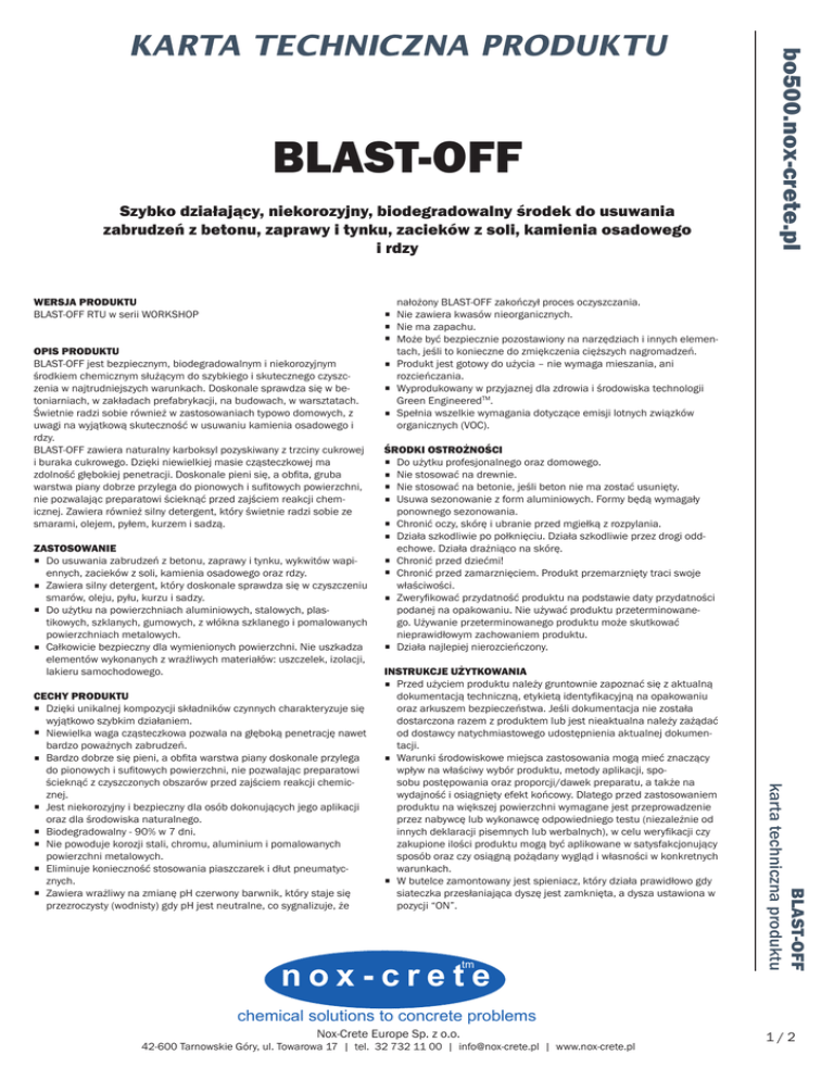 BLAST-OFF Szybko działający, niekorozyjny, biodegradowalny środek do usuwania zabrudzeń z betonu, zaprawy i tynku, zacieków z soli, kamienia osadowego i rdzy WERSJA PRODUKTU BLAST-OFF RTU w serii WORKSHOP OPIS PRODUKTU BLAST-OFF jest bezpiecznym, biodegradowalnym i niekorozyjnym środkiem chemicznym służącym do szybkiego i skutecznego czyszczenia w najtrudniejszych warunkach. Doskonale sprawdza się w betoniarniach, w zakładach prefabrykacji, na budowach, w warsztatach. Świetnie radzi sobie również w zastosowaniach typowo domowych, z uwagi na wyjątkową skuteczność w usuwaniu kamienia osadowego i rdzy. BLAST-OFF zawiera naturalny karboksyl pozyskiwany z trzciny cukrowej i buraka cukrowego. Dzięki niewielkiej masie cząsteczkowej ma zdolność głębokiej penetracji. Doskonale pieni się, a obfita, gruba warstwa piany dobrze przylega do pionowych i sufitowych powierzchni, nie pozwalając preparatowi ścieknąć przed zajściem reakcji chemicznej. Zawiera również silny detergent, który świetnie radzi sobie ze smarami, olejem, pyłem, kurzem i sadzą. ZASTOSOWANIE § Do usuwania zabrudzeń z betonu, zaprawy i tynku, wykwitów wapiennych, zacieków z soli, kamienia osadowego oraz rdzy. § Zawiera silny detergent, który doskonale sprawdza się w czyszczeniu smarów, oleju, pyłu, kurzu i sadzy. § Do użytku na powierzchniach aluminiowych, stalowych, plastikowych, szklanych, gumowych, z włókna szklanego i pomalowanych powierzchniach metalowych. § Całkowicie bezpieczny dla wymienionych powierzchni. Nie uszkadza elementów wykonanych z wrażliwych materiałów: uszczelek, izolacji, lakieru samochodowego. § § § nałożony BLAST-OFF zakończył proces oczyszczania. Nie zawiera kwasów nieorganicznych. Nie ma zapachu. Może być bezpiecznie pozostawiony na narzędziach i innych elementach, jeśli to konieczne do zmiękczenia cięższych nagromadzeń. Produkt jest gotowy do użycia – nie wymaga mieszania, ani rozcieńczania. Wyprodukowany w przyjaznej dla zdrowia i środowiska technologii Green EngineeredTM. Spełnia wszelkie wymagania dotyczące emisji lotnych związków organicznych (VOC). ŚRODKI OSTROŻNOŚCI § Do użytku profesjonalnego oraz domowego. § Nie stosować na drewnie. § Nie stosować na betonie, jeśli beton nie ma zostać usunięty. § Usuwa sezonowanie z form aluminiowych. Formy będą wymagały ponownego sezonowania. § Chronić oczy, skórę i ubranie przed mgiełką z rozpylania. § Działa szkodliwie po połknięciu. Działa szkodliwie przez drogi oddechowe. Działa drażniąco na skórę. § Chronić przed dziećmi! § Chronić przed zamarznięciem. Produkt przemarznięty traci swoje właściwości. § Zweryfikować przydatność produktu na podstawie daty przydatności podanej na opakowaniu. Nie używać produktu przeterminowanego. Używanie przeterminowanego produktu może skutkować nieprawidłowym zachowaniem produktu. § Działa najlepiej nierozcieńczony. INSTRUKCJE UŻYTKOWANIA § Przed użyciem produktu należy gruntownie zapoznać się z aktualną dokumentacją techniczną, etykietą identyfikacyjną na opakowaniu oraz arkuszem bezpieczeństwa. Jeśli dokumentacja nie została dostarczona razem z produktem lub jest nieaktualna należy zażądać od dostawcy natychmiastowego udostępnienia aktualnej dokumentacji. § Warunki środowiskowe miejsca zastosowania mogą mieć znaczący wpływ na właściwy wybór produktu, metody aplikacji, sposobu postępowania oraz proporcji/dawek preparatu, a także na wydajność i osiągnięty efekt końcowy. Dlatego przed zastosowaniem produktu na większej powierzchni wymagane jest przeprowadzenie przez nabywcę lub wykonawcę odpowiedniego testu (niezależnie od innych deklaracji pisemnych lub werbalnych), w celu weryfikacji czy zakupione ilości produktu mogą być aplikowane w satysfakcjonujący sposób oraz czy osiągną pożądany wygląd i własności w konkretnych warunkach. § W butelce zamontowany jest spieniacz, który działa prawidłowo gdy siateczka przesłaniająca dyszę jest zamknięta, a dysza ustawiona w pozycji “ON”. nox-crete tm BLAST-OFF karta techniczna produktu CECHY PRODUKTU § Dzięki unikalnej kompozycji składników czynnych charakteryzuje się wyjątkowo szybkim działaniem. § Niewielka waga cząsteczkowa pozwala na głęboką penetrację nawet bardzo poważnych zabrudzeń. § Bardzo dobrze się pieni, a obfita warstwa piany doskonale przylega do pionowych i sufitowych powierzchni, nie pozwalając preparatowi ścieknąć z czyszczonych obszarów przed zajściem reakcji chemicznej. § Jest niekorozyjny i bezpieczny dla osób dokonujących jego aplikacji oraz dla środowiska naturalnego. § Biodegradowalny - 90% w 7 dni. § Nie powoduje korozji stali, chromu, aluminium i pomalowanych powierzchni metalowych. § Eliminuje konieczność stosowania piaszczarek i dłut pneumatycznych. § Zawiera wrażliwy na zmianę pH czerwony barwnik, który staje się przezroczysty (wodnisty) gdy pH jest neutralne, co sygnalizuje, że § § § bo500.nox-crete.pl KARTA TECHNICZNA PRODUKTU chemical solutions to concrete problems Nox-Crete Europe Sp. z o.o. 42-600 Tarnowskie Góry, ul. Towarowa 17 | tel. 32 732 11 00 | [email protected] | www.nox-crete.pl 1/2 BLAST-OFF § § § Rozpylać pianę na całą zabrudzoną powierzchnię, odczekać kilka minut, aż piana zmieni kolor z delikatnie różowego na szary, co jest znakiem, że preparat przereagował. Zmiękczone pozostałości zabrudzenia można usunąć poprzez szorowanie szorstką stroną gąbki, często wystarczy wyłącznie spłukanie wodą. Spłukiwać wodą obficie. W przypadku dużych nagromadzeń starego betonu lub kamienia osadowego należy powtarzać procedurę do skutku. W najtrudniejszych przypadkach do całkowitego usunięcia zabrudzeń może być konieczne przeprowadzenie kilku - kilkunastu aplikacji. Jeśli dojdzie do wyschnięcia BLAST-OFF przed zmyciem wodą, na czyszczonej powierzchni pojawi się biały lub jasnoszary nal