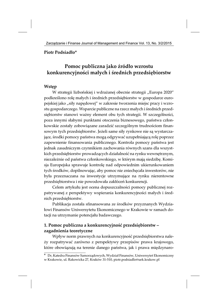 Zarz¹dzanie i Finanse Journal of Management and Finance Vol. 13, No. 3/2/2015 Piotr Podsiad³o* Piotr Podsiad³o Pomoc publiczna jako Ÿród³o wzrostu konkurencyjnoœci ma³ych i œrednich przedsiêbiorstw Pomoc publiczna jako Ÿród³o wzrostu konkurencyjnoœci… Wstêp W strategii lizboñskiej i wdra¿anej obecnie strategii „Europa 2020” podkreœlono rolê ma³ych i œrednich przedsiêbiorstw w gospodarce europejskiej jako „si³y napêdowej” w zakresie tworzenia miejsc pracy i wzrostu gospodarczego. Wsparcie publiczne na rzecz ma³ych i œrednich przedsiêbiorstw stanowi wa¿ny element obu tych strategii. W szczególnoœci, poza innymi s³abymi punktami otoczenia biznesowego, pañstwa cz³onkowskie zosta³y zobowi¹zane zaradziæ szczególnym trudnoœciom finansowym tych przedsiêbiorstw. Je¿eli same si³y rynkowe nie s¹ wystarczaj¹ce, œrodki pomocy pañstwa mog¹ odgrywaæ uzupe³niaj¹c¹ rolê poprzez zapewnienie finansowania publicznego. Kontrola pomocy pañstwa jest jednak zasadniczym czynnikiem zachowania równych szans dla wszystkich przedsiêbiorstw prowadz¹cych dzia³alnoœæ na rynku wewnêtrznym, niezale¿nie od pañstwa cz³onkowskiego, w którym maj¹ siedzibê. Komisja Europejska sprawuje kontrolê nad odpowiednim ukierunkowaniem tych œrodków, dopilnowuj¹c, aby pomoc nie zniechêca³a inwestorów, nie by³a przeznaczana na inwestycje utrzymuj¹ce na rynku nierentowne przedsiêbiorstwa i nie powodowa³a zak³óceñ konkurencji. Celem artyku³u jest ocena dopuszczalnoœci pomocy publicznej rozpatrywanej z perspektywy wspierania konkurencyjnoœci ma³ych i œrednich przedsiêbiorstw. Publikacja zosta³a sfinansowana ze œrodków przyznanych Wydzia³owi Finansów Uniwersytetu Ekonomicznego w Krakowie w ramach dotacji na utrzymanie potencja³u badawczego. 1. Pomoc publiczna a konkurencyjnoœæ przedsiêbiorstw – zagadnienia teoretyczne Wp³yw norm prawnych na konkurencyjnoœæ przedsiêbiorstwa nale¿y rozpatrywaæ zarówno z perspektywy przepisów prawa krajowego, które obowi¹zuj¹ na terenie danego pañstwa, jak i prawa miêdzynaro* Dr, Katedra Finansów Samorz¹dowych, Wydzia³ Finansów, Uniwersytet Ekonomiczny w Krakowie, ul. Rakowicka 27, Kraków 31-510, [email protected] 266 Piotr Podsiad³o dowego, które s¹ stosowane w zwi¹zku z prowadzeniem dzia³alnoœci gospodarczej na rynku miêdzynarodowym – np. jednolitym rynku europejskim. Z punktu widzenia podjêtego w artykule tematu wskazaæ nale¿y przede wszystkim na regulacje dotycz¹ce ingerencji pañstwa w gospodarkê. W kontekœcie badania wp³ywu ró¿nych czynników na makrokonkurencyjnoœæ rozwa¿ana jest kwestia zwi¹zana ze stymulowaniem miêdzynarodowej konkurencyjnoœci produkcji krajowej, której towarzysz¹ dwa procesy, tj. pobudzanie popytu na produkty wytwarzane w kraju oraz ochrona krajowych producentów [Hübner, 1994]. W zwi¹zku z tym, ¿e istnieje silna wspó³zale¿noœæ miêdzy konkurencyjnoœci¹ gospodarki narodowej a konkurencyjnoœci¹ przedsiêbiorstw w niej dzia³aj¹cych, zakres oraz metody protekcjonizmu pañstwowego w sposób bezpoœredni kszta³tuj¹ zachowania tych przedsiêbiorstw. Miêdzy protekcjonizmem a konkurencyjnoœci¹ przedsiêbiorstw zachodzi zale¿noœæ odwrotnie proporcjonalna, co oznacza, ¿e prowadzenie polityki gospodarczej, która oparta jest na stosowaniu w praktyce ochrony rynku krajowego poprzez tworzenie utrudnieñ dla zagranicznej konkurencji, powoduje w d³ugim okresie spadek konkurencyjnoœci przedsiêbiorstw uczestnicz¹cych w wymianie miêdzynarodowej, przy za³o¿eniu, ¿e inne czynniki konkurencyjnoœci nie ulegaj¹ zmianie. Jest to wynikiem tego, ¿e przedsiêbiorstwa dzia³aj¹ce w warunkach protekcjonizmu pañstwowego zatracaj¹ zdolnoœæ do konkurowania, poniewa¿ takie elementy, jak jakoœæ i cena oferowanych dóbr czêsto s¹ regulowane przez w³adze publiczne. W rzeczywistoœci oznacza to wprowadzenie instytucjonalnych ograniczeñ dla rozwoju miêdzynarodowej konkurencji i dlatego te¿ ograniczanie praktyk protekcjonistycznych stanowi czynnik wzrostu poziomu konkurencyjnoœci przedsiêbiorstw. Wówczas przedsiêbiorstwa musz¹ pos³ugiwaæ siê coraz nowoczeœniejszymi metodami i formami walki konkurencyjnej, poniewa¿ tylko wtedy s¹ one w stanie sprostaæ wymaganiom rynku miêdzynarodowego. Pomoc publiczna jest narzêdziem polityki gospodarczej pañstwa, które stosowane jest w celu z³agodzenia lub zrekompensowania ponoszonego przez przedsiêbiorstwo obci¹¿enia, a tak¿e s³u¿y zachêceniu do podjêcia okreœlonej dzia³alnoœci. Generalnie rzecz ujmuj¹c, udzielanie przez pañstwo pomocy publicznej, poprzez zmniejszanie lub ca³kowite znoszenie okreœlonych obci¹¿eñ publicznoprawnych, a tak¿e poprzez bezpoœrednie finansowanie z funduszy publicznych, ma wp³ywaæ na wzrost konkurencyjnoœci przedsiêbiorstw krajowych wzglêdem podmio- Pomoc publiczna jako Ÿród³o wzrostu konkurencyjnoœci… 267 tów zagranicznych. Z punktu widzenia konkurencyjnoœci przedsiêbiorstw pomoc publiczna powinna byæ stosowana jednak w ograniczonym czasie. Podnosi siê bowiem, ¿e udzielanie pomocy publicznej w d³ugim okresie mo¿e wywo³ywaæ skutki niezgodne z zamierzonymi [Pomyka³o, 1995, s. 971]. Wskazaæ tu nale¿y na wzrost cen, który mo¿e byæ spowodowany ma³¹ elastycznoœci¹ cenow¹ poda¿y ze strony beneficjenta pomocy, zmiany struktury podzia³u dochodu narodowego bêd¹ce nastêpstwem wzrostu dochodów odbiorców pomocy w stosunku do pozosta³ych podmiotów rynkowych, os³abienie sk³onnoœci do inwestowania i innowacyjnoœci w wyniku zmniejszenia presji do konkurowania z innymi przedsiêbiorstwami, a co za tym idzie – ryzyko przeznaczenia dodatkowego dochodu na bie¿¹c¹ dzia³alnoœæ zamiast na inwestycje, a tak¿e na powstawanie w wyniku udzielenia pomocy nadwy¿ek pewnych dóbr. W opozycji do interwencjonizmu pañstwowego stoi liberalizacja procesów rynkowych, która wp³ywa wprost proporcjonalnie na poziom