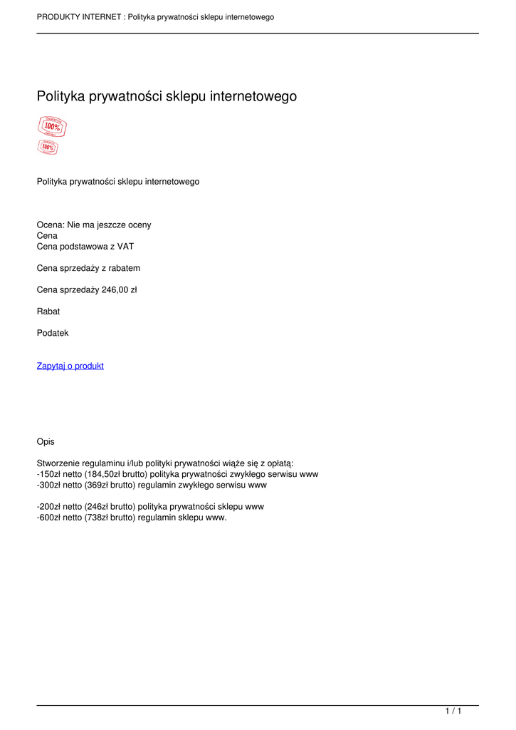 PRODUKTY INTERNET : Polityka prywatności sklepu internetowego Polityka prywatności sklepu internetowego Polityka prywatności sklepu internetowego Ocena: Nie ma jeszcze oceny Cena Cena podstawowa z VAT Cena sprzedaży z rabatem Cena sprzedaży 246,00 zł Rabat Podatek Zapytaj o produkt Opis Stworzenie regulaminu i/lub polityki prywatności wiąże się z opłatą: -150zł netto (184,50zł brutto) polityka prywatności zwykłego serwisu www -300zł netto (369zł brutto) regulamin zwykłego serwisu www -200zł netto (246zł brutto) polityka prywatności sklepu www -600zł netto (738zł brutto) regulamin sklepu www. 1/1 Powered by TCPDF (www.tcpdf.org)