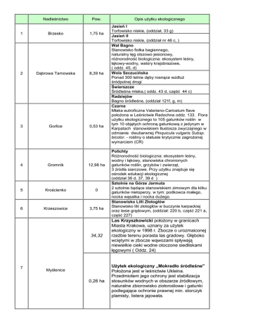 Nadleśnictwo Pow. 1 Brzesko 1,75 ha 2 Dąbrowa Tarnowska 8,39 ha 3 Gorlice 0,53 ha 4 Gromnik 12,98 ha 5 Krościenko 0 6 Krzeszowice 3,75 ha 7 Opis użytku ekologicznego Jasień I Torfowisko niskie, (oddział, 33 g) Jasień II Torfowisko niskie, (oddział nr 46 c, ) Wał Bagno Stanowisko fiołka bagiennego, naturalny łęg olszowo jesionowy, różnorodność biologiczna: ekosystem leśny, łąkowy-wodny, walory krajobrazowe, ( oddz. 45, d) Wola Szczucińska Ponad 300 letnie dęby rosnące wzdłuż śródpolnej drogi Świerszcze Śródleśna młaka,( oddz. 43 d, część 44 c) Radziejów Bagno śródleśne, (oddział 121f, g, m) Czarne Młaka eutroficzna Valeriano-Caricetum flave położona w Leśnictwie Radochna oddz. 133. Flora użytku ekologicznego to 105 gatunków roślin w tym 10 objętych ochroną gatunkową z jedynym w Karpatach stanowiskiem tłustosza zwyczajnego w odmianie dwubarwnej Pinquicula vulgaris Subsp. bicolor. - rośliny o statusie krytycznie zagrożonej wymarciem (CR) Polichty Różnorodność biologiczna: ekosystem leśny, wodny i łąkowy, stanowiska chronionych gatunków roślin, grzybów i zwierząt, 3 źródła siarczowe. Przy użytku znajduje się ośrodek edukacji ekologicznej (oddział 36 d, 37, 39 d ) Sztolnie na Górze Jarmuta 2 sztolnie będące stanowiskiem zimowym dla kilku gatunków nietoperzy, w tym: podkowca małego, nocka wąsatka i nocka dużego. Stanowisko Lilli Złotogłów Stanowisko lilii złotogłów w buczynie karpackiej oraz lesie grądowym, (oddział: 220 b, część 221 a, część 227) 34,32 Las Krzyszkowicki położony w granicach Miasta Krakowa, uznany za użytek ekologiczny w 1998 r. Zbocze o urozmaiconej rzeźbie terenu porasta las gradowy. Głęboko wciętymi w zbocze wąwozami spływają niewielkie cieki wodne otoczone siedliskami łęgowymi ( Oddz. 24) 0,26 ha Użytek ekologiczny „Mokradło śródleśne" Położona jest w leśnictwie Ukleina. Przedmiotem jego ochrony jest stabilizacja stosunków wodnych w obszarze źródłowym, naturalne zbiorowisko ziołoroślowe i gatunki podlegające ochronie prawnej min. storczyk plamisty, listera jajowata. Myślenice 0,12 ha „Młaka źródliskowa" Położona jest w leśnictwie Ukleina. Powołany został dla zachowania różnorodności biologicznej kompleksu oraz ochrony stosunków wodnych. 5,06 ha „Sucha Polana" - Położona jest w leśnictwie Lipnik. Pierwszorzędnym celem ochrony są tu zespoły łąk górskich i torfowisk niskich. Drugorzędnym celem ochrony są walory krajobrazowe górskiej polany położonej na uczęszczanym szlaku turystycznym. Jest to też miejsce pamięci narodowej.